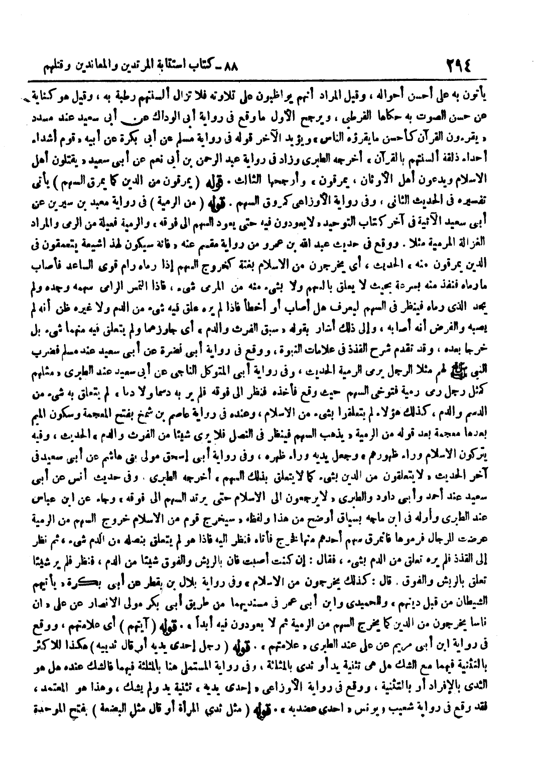 يَأْتُونَ بِهِ عَلَى أَحْسَنِ أَحْوَالِهِ وَقِيلَ الْمُرَادُ أَنَّهُمْ يُوَاظِبُونَ عَلَى تِلَاوَتِهِ فَلَا تَزَالُ أَلْسِنَتُهُمْ رَطْبَةً بِهِ وَقِيلَ هُوَ كِنَايَةٌ عَنْ حُسْنِ الصَّوْتِ بِهِ حَكَاهَا الْقُرْطُبِيُّ وَيُرَجِّحُ الْأَوَّلَ مَا وَقَعَ فِي رِوَايَةِ أَبِي الْوَدَّاكِ عَنْ أَبِي سعيد عِنْد مُسَدّد يقرؤون الْقُرْآنَ كَأَحْسَنِ مَا يَقْرَؤُهُ النَّاسُ وَيُؤَيِّدُ الْآخَرَ قَوْلُهُ فِي رِوَايَةِ مُسْلِمٍ عَنْ أَبِي بَكْرَةَ عَنْ أَبِيهِ قَوْمٌ أَشِدَّاءُ أَحِدَّاءُ ذَلِقَةٌ أَلْسِنَتُهُمْ بِالْقُرْآنِ أَخْرَجَهُ الطَّبَرِيُّ وَزَادَ فِي رِوَايَةِ عَبْدِ الرَّحْمَنِ بْنِ أَبِي نُعْمٍ عَنْ أَبِي سَعِيدٍ يَقْتُلُونَ أَهْلَ الْإِسْلَامِ وَيَدَعُونَ أَهْلَ الْأَوْثَانِ يَمْرُقُونَ وَأَرْجَحُهَا الثَّالِثُ قَوْلُهُ يَمْرُقُونَ مِنَ الدِّينِ كَمَا يَمْرُقُ السَّهْمُ يَأْتِي تَفْسِيرُهُ فِي الْحَدِيثِ الثَّانِي وَفِي رِوَايَةِ الْأَوْزَاعِيِّ كَمُرُوقِ السَّهْمِ قَوْلُهُ مِنَ الرَّمِيَّةِ فِي رِوَايَةِ مَعْبَدِ بْنِ سِيرِينَ عَنْ أَبِي سَعِيدٍ الْآتِيَةِ فِي آخِرِ كِتَابِ التَّوْحِيدِ لَا يَعُودُونَ فِيهِ حَتَّى يَعُودَ السَّهْمُ إِلَى فُوقِهِ وَالرَّمِيَّةُ فَعِيلَةٌ مِنَ الرَّمْيِ وَالْمُرَادُ الْغَزَالَةُ الْمَرْمِيَّةُ مَثَلًا وَوَقَعَ فِي حَدِيثِ عَبْدِ اللَّهِ بْنِ عَمْرٍو مِنْ رِوَايَةِ مِقْسَمٍ عَنْهُ فَإِنَّهُ سَيَكُونُ لِهَذَا شِيعَةٌ يَتَعَمَّقُونَ فِي الدِّينِ يَمْرُقُونَ مِنْهُ الْحَدِيثَ أَيْ يَخْرُجُونَ مِنَ الْإِسْلَامِ بَغْتَةً كَخُرُوجِ السَّهْمِ إِذَا رَمَاهُ رَامٍ قَوِيُّ السَّاعِدِ فَأَصَابَ مَا رَمَاهُ فَنَفَذَ مِنْهُ بِسُرْعَةٍ بِحَيْثُ لَا يَعْلَقُ بِالسَّهْمِ وَلَا بِشَيْءٍ مِنْهُ مِنَ الْمَرْمِيِّ شَيْءٌ فَإِذَا الْتَمَسَ الرَّامِي سَهْمَهُ وَجَدَهُ وَلَمْ يَجِدِ الَّذِي رَمَاهُ فَيَنْظُرُ فِي السَّهْمَ لِيَعْرِفَ هَلْ أَصَابَ أَوْ أَخْطَأَ فَإِذَا لَمْ يَرَهُ عَلِقَ فِيهِ شَيْءٌ مِنَ الدَّمِ وَلَا غَيْرُهُ ظَنَّ أَنَّهُ لَمْ يُصِبْهُ وَالْفَرْضُ أَنَّهُ أَصَابَهُ وَإِلَى ذَلِكَ أَشَارَ بِقَوْلِهِ سَبَقَ الْفَرْثَ وَالدَّمَ أَيْ جَاوَزَهُمَا وَلَمْ يَتَعَلَّقْ فِيهِ مِنْهُمَا شَيْءٌ بَلْ خَرَجَا بَعْدَهُ وَقَدْ تَقَدَّمَ شَرْحُ الْقُذَذِ فِي عَلَامَاتِ النُّبُوَّةِ وَوَقَعَ فِي رِوَايَةِ أَبِي نَضْرَةَ عَنْ أَبِي سَعِيدٍ عِنْدَ مُسْلِمٍ فَضَرَبَ النَّبِيُّ صَلَّى اللَّهُ عَلَيْهِ وَسَلَّمَ لَهُمْ مَثَلًا الرَّجُلُ يَرْمِي الرَّمِيَّةَ الْحَدِيثَ وَفِي رِوَايَةِ أَبِي الْمُتَوَكِّلِ النَّاجِيِّ عَنْ أَبِي سَعِيدٍ عِنْدَ الطَّبَرِيِّ مَثَلُهُمْ كَمَثَلِ رَجُلٍ رَمَى رَمِيَّةً فَتَوَخَّى السَّهْمَ حَيْثُ وَقَعَ فَأَخَذَهُ فَنَظَرَ إِلَى فُوقِهِ فَلَمْ يَرَ بِهِ دَسَمًا وَلَا دَمًا لَمْ يَتَعَلَّقْ بِهِ شَيْءٌ مِنَ الدَّسَمِ وَالدَّمِ كَذَلِكَ هَؤُلَاءِ لَمْ يَتَعَلَّقُوا بِشَيْءٍ مِنَ الْإِسْلَامِ وَعِنْدَهُ فِي رِوَايَةِ عَاصِمِ بْنِ شَمْخٍ بِفَتْحِ الْمُعْجَمَةِ وَسُكُونِ الْمِيمِ بَعْدَهَا مُعْجَمَةٌ بَعْدَ قَوْلِهِ مِنَ الرَّمِيَّةِ يَذْهَبُ السَّهْمُ فَيَنْظُرُ فِي النَّصْلِ فَلَا يَرَى شَيْئًا مِنَ الْفَرْثِ وَالدَّمِ الْحَدِيثَ وَفِيهِ يَتْرُكُونَ الْإِسْلَامَ وَرَاءَ ظُهُورِهِمْ وَجَعَلَ يَدَيْهِ وَرَاءَ ظَهْرِهِ وَفِي رِوَايَةِ أَبِي إِسْحَاقَ مَوْلَى بَنِي هَاشِمٍ عَنْ أَبِي سَعِيدٍ فِي آخِرِ الْحَدِيثِ لَا يَتَعَلَّقُونَ مِنَ الدِّينِ بِشَيْءٍ كَمَا لَا يَتَعَلَّقُ بِذَلِكَ السَّهْمِ أَخْرَجَهُ الطَّبَرِيُّ وَفِي حَدِيثِ أَنَسٍ عَنْ أَبِي سَعِيدٍ عِنْدَ أَحْمَدَ وَأَبِي دَاوُدَ وَالطَّبَرِيِّ
