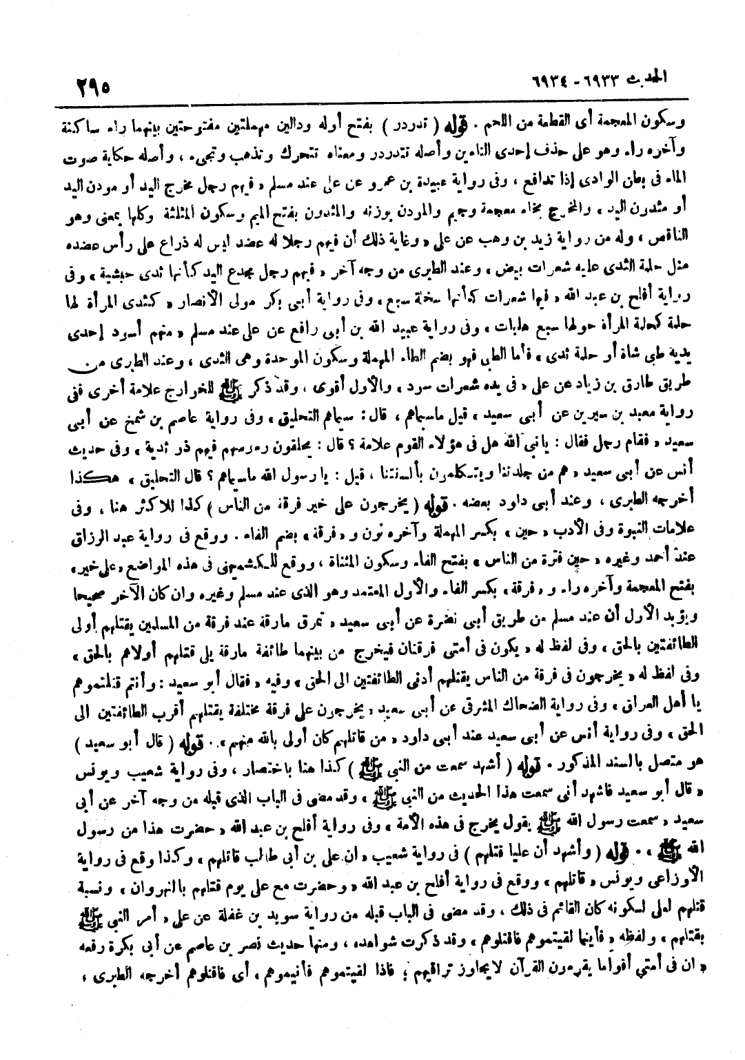 وَسُكُونِ الْمُعْجَمَةِ أَيِ الْقِطْعَةِ مِنَ اللَّحْمِ قَوْلُهُ تَدَرْدَرُ بِفَتْحِ أَوَّلِهِ وَدَالَيْنِ مُهْمَلَتَيْنِ مَفْتُوحَتَيْنِ بَيْنَهُمَا رَاءٌ سَاكِنَةٌ وَآخِرُهُ رَاءٌ وَهُوَ عَلَى حَذْفِ إِحْدَى التَّاءَيْنِ وَأَصْلُهُ تَتَدَرْدَرُ وَمَعْنَاهُ تَتَحَرَّكُ وَتَذْهَبُ وَتَجِيءُ وَأَصْلُهُ حِكَايَةُ صَوْتِ الْمَاءِ فِي بَطْنِ الْوَادِي إِذَا تَدَافَعَ وَفِي رِوَايَةِ عُبَيْدَةَ بْنِ عَمْرٍو عَنْ عَلِيٍّ عِنْدَ مُسْلِمٍ فِيهِمْ رَجُلٌ مخرج الْيَدِ أَوْ مُودَنُ الْيَدِ أَوْ مَثْدُونُ الْيَدِ والمخرج بِخَاءٍ مُعْجَمَةٍ وَجِيمٍ وَالْمُودَنُ بِوَزْنِهِ وَالْمَثْدُونُ بِفَتْحِ الْمِيمِ وَسُكُونِ الْمُثَلَّثَةِ وَكُلُّهَا بِمَعْنًى وَهُوَ النَّاقِصُ وَلَهُ مِنْ رِوَايَةِ زَيْدِ بْنِ وَهْبٍ عَنْ عَلِيٍّ وَغَايَةُ ذَلِكَ أَنَّ فِيهِمْ رَجُلًا لَهُ عَضُدٌ لَيْسَ لَهُ ذِرَاعٌ عَلَى رَأْسِ عَضُدِهِ مِثْلُ حَلَمَةِ الثَّدْيِ عَلَيْهِ شَعَرَاتٌ بِيضٌ وَعِنْدَ الطَّبَرِيِّ مِنْ وَجْهٍ آخَرَ فِيهِمْ رَجُلٌ مُجْدَعُ الْيَدِ كَأَنَّهَا ثَدْيُ حَبَشِيَّةٍ وَفِي رِوَايَةِ أَفْلَحَ بْنِ عَبْدِ اللَّهِ فِيهَا شَعَرَاتٌ كَأَنَّهَا سَخْلَةُ سَبُعٍ وَفِي رِوَايَةِ أَبِي بَكْرٍ مَوْلَى الْأَنْصَارِ كَثَدْيِ الْمَرْأَةِ لَهَا حَلَمَةٌ كَحَلَمَةِ الْمَرْأَةِ حَوْلُهَا سَبْعُ هُلْبَاتٍ وَفِي رِوَايَةِ عُبَيْدِ اللَّهِ بْنِ أَبِي رَافِعٍ عَنْ عَلِيٍّ عِنْدَ مُسْلِمٍ مِنْهُمْ أَسْوَدُ إِحْدَى يَدَيْهِ طُبْيُ شَاةٍ أَوْ حَلَمَةُ ثَدْيٍ فَأَمَّا الطُّبْيُ فَهُوَ بِضَمِّ الطَّاءِ الْمُهْمَلَةِ وَسُكُونِ الْمُوَحَّدَةِ وَهِيَ الثَّدْيُ وَعِنْدَ الطَّبَرِيِّ مِنْ طَرِيقِ طَارِقِ بْنِ زِيَادٍ عَنْ عَلِيٍّ فِي يَدِهِ شَعَرَاتٌ سُودٌ وَالْأَوَّلُ أَقْوَى وَقَدْ ذَكَرَ صَلَّى اللَّهُ عَلَيْهِ وَسَلَّمَ لِلْخَوَارِجِ عَلَامَةً أُخْرَى فَفِي رِوَايَةِ مَعْبَدِ بْنِ سِيرِينَ عَنْ أَبِي سَعِيدٍ قِيلَ مَا سِيمَاهُمْ قَالَ سِيمَاهُمُ التَّحْلِيقُ وَفِي رِوَايَةِ عَاصِمِ بْنِ شَمْخٍ عَنْ أَبِي سَعِيدٍ فَقَامَ رَجُلٌ فَقَالَ يَا نَبِيَّ اللَّهِ هَلْ فِي هَؤُلَاءِ الْقَوْمِ عَلَامَةٌ قَالَ يَحْلِقُونَ رؤوسهم فِيهِمْ ذُو ثُدَيَّةٍ وَفِي حَدِيثِ أَنَسٍ عَنْ أَبِي سَعِيدٍ هُمْ مِنْ جِلْدَتِنَا وَيَتَكَلَّمُونَ بِأَلْسِنَتِنَا قِيلَ يَا رَسُولَ اللَّهِ مَا سِيمَاهُمْ قَالَ التَّحْلِيقُ هَكَذَا أَخْرَجَهُ الطَّبَرِيُّ وَعِنْدَ أَبِي دَاوُدَ بَعْضُهُ قَوْلُهُ يَخْرُجُونَ عَلَى خَيْرِ فُرْقَةٍ مِنَ النَّاسِ كَذَا لِلْأَكْثَرِ هُنَا وَفِي عَلَامَاتِ النُّبُوَّةِ وَفِي الْأَدَبِ حِينَ بِكَسْرِ الْمُهْمَلَةِ وَآخِرُهُ نُونٌ وَفرْقَة بِضَمِّ الْفَاءِ وَوَقَعَ فِي رِوَايَةِ عَبْدِ الرَّزَّاقِ عِنْدَ أَحْمَدَ وَغَيْرِهِ حِينَ فَتْرَةٍ مِنَ النَّاسِ بِفَتْحِ الْفَاءِ وَسُكُونِ الْمُثَنَّاةِ وَوَقَعَ لِلْكُشْمِيهَنِيِّ فِي هَذِهِ الْمَوَاضِعِ عَلَى خَيْرِ بِفَتْحِ الْمُعْجَمَةِ وَآخِرُهُ رَاء وَفرْقَة بِكَسْرِ الْفَاءٍ وَالْأَوَّلُ الْمُعْتَمَدُ وَهُوَ الَّذِي عِنْدَ مُسْلِمٍ وَغَيْرِهِ وَإِنْ كَانَ الْآخَرُ صَحِيحًا وَيُؤَيِّدُ الْأَوَّلَ أَنَّ عِنْدَ مُسْلِمٍ مِنْ طَرِيقِ أَبِي نَضْرَةَ عَنْ أَبِي سَعِيدٍ تَمْرُقُ مَارِقَةٌ عِنْدَ فِرْقَةٍ مِنَ الْمُسْلِمِينَ يَقْتُلُهُمْ أَوْلَى الطَّائِفَتَيْنِ بِالْحَقِّ وَفِي لَفْظٍ لَهُ يَكُونُ فِي أُمَّتِي فِرْقَتَانِ فَيَخْرُجُ مِنْ بَيْنِهِمَا طَائِفَةٌ مَارِقَةٌ يَلِي قَتْلَهُمْ أَوْلَاهُمْ بِالْحَقِّ وَفِي لَفْظٍ لَهُ يَخْرُجُونَ فِي فِرْقَةٍ مِنَ النَّاسِ يَقْتُلُهُمْ أَدْنَى الطَّائِفَتَيْنِ إِلَى الْحَقِّ وَفِيهِ فَقَالَ أَبُو سَعِي