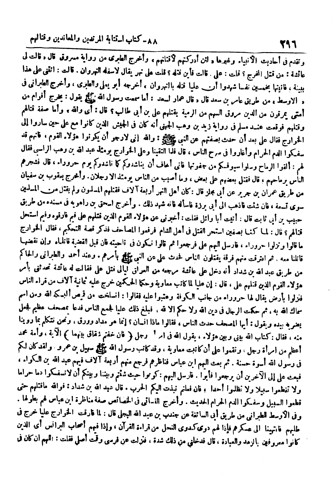 وَتَقَدَّمَ فِي أَحَادِيثِ الْأَنْبِيَاءِ وَغَيْرِهَا لَئِنْ أَدْرَكْتُهُمْ لَأَقْتُلَنَّهُمْ وَأَخْرَجَ الطَّبَرِيُّ مِنْ رِوَايَةِ مَسْرُوقٍ قَالَ قَالَت لي عَائِشَة من قتل الْمخْرج قُلْتُ عَلِيٌّ قَالَتْ فَأَيْنَ قَتَلَهُ قُلْتُ عَلَى نَهْرٍ يُقَالُ لِأَسْفَلِهِ النَّهْرَوَانُ قَالَتِ ائْتِنِي عَلَى هَذَا بِبَيِّنَةٍ فَأَتَيْتُهَا بِخَمْسِينَ نَفْسًا شَهِدُوا أَنَّ عَلِيًّا قَتَلَهُ بِالنَّهْرَوَانِ أَخْرَجَهُ أَبُو يَعْلَى وَالطَّبَرِيُّ وَأَخْرَجَ الطَّبَرَانِيُّ فِي الْأَوْسَطِ مِنْ طَرِيقِ عَامِرِ بْنِ سَعْدٍ قَالَ قَالَ عَمَّارٌ لِسَعْدٍ أَمَا سَمِعْتُ رَسُولَ اللَّهِ صَلَّى اللَّهُ عَلَيْهِ وَسَلَّمَ يَقُولُ يَخْرُجُ أَقْوَامٌ مِنْ أُمَّتِي يَمْرُقُونَ مِنَ الدِّينِ مُرُوقَ السَّهْمِ مِنَ الرَّمِيَّةِ يَقْتُلُهُمْ عَلِيُّ بْنُ أَبِي طَالِبٍ قَالَ إِي وَاللَّهِ وَأَمَّا صِفَةُ قِتَالِهِمْ وَقَتْلِهِمْ فَوَقَعَتْ عِنْدَ مُسْلِمٍ فِي رِوَايَةِ زَيْدِ بْنِ وَهْبٍ الْجُهَنِيِّ أَنَّهُ كَانَ فِي الْجَيْشِ الَّذِينَ كَانُوا مَعَ عَلِيٍّ حِينَ سَارُوا إِلَى الْخَوَارِجِ فَقَالَ عَلِيٌّ بَعْدَ أَنْ حَدَّثَ بِصِفَتِهِمْ عَنِ النَّبِيِّ صَلَّى اللَّهُ عَلَيْهِ وَسَلَّمَ وَاللَّهِ إِنِّي لَأَرْجُو أَنْ يَكُونُوا هَؤُلَاءِ الْقَوْمَ فَإِنَّهُمْ قَدْ سَفَكُوا الدَّمَ الْحَرَامَ وَأَغَارُوا فِي سَرْحِ النَّاسِ قَالَ فَلَمَّا الْتَقَيْنَا وَعَلَى الْخَوَارِجِ يَوْمئِذٍ عَبْدُ اللَّهِ بْنُ وَهْبٍ الرَّاسِبِيُّ فَقَالَ لَهُمْ أَلْقُوا الرِّمَاحَ وَسُلُّوا سُيُوفَكُمْ مِنْ جُفُونِهَا فَإِنِّي أَخَافُ أَنْ يُنَاشِدُوكُمْ كَمَا نَاشَدُوكُمْ يَوْمَ حَرُورَاءَ قَالَ فَشَجَرَهُمُ النَّاسُ بِرِمَاحِهِمْ قَالَ فَقُتِلَ بَعْضُهُمْ عَلَى بَعْضٍ وَمَا أُصِيبَ مِنَ النَّاسِ يَوْمئِذٍ إِلَّا رَجُلَانِ وَأَخْرَجَ يَعْقُوبُ بْنُ سُفْيَانَ مِنْ طَرِيقِ عِمْرَانَ بْنِ جَرِيرٍ عَنْ أَبِي مِجْلَزٍ قَالَ كَانَ أَهْلُ النَّهْرِ أَرْبَعَةَ آلَافٍ فَقَتَلَهُمُ الْمُسْلِمُونَ وَلَمْ يُقْتَلْ مِنَ الْمُسْلِمِينَ سِوَى تِسْعَةٍ فَإِنْ شِئْتَ فَاذْهَبْ إِلَى أَبِي بَرْزَةَ فَاسْأَلْهُ فَإِنَّهُ شَهِدَ ذَلِكَ وَأَخْرَجَ إِسْحَاقُ بْنُ رَاهَوَيْهِ فِي مَسْنَدِهِ مِنْ طَرِيقِ حَبِيبِ بْنِ أَبِي ثَابِتٍ قَالَ أَتَيْتُ أَبَا وَائِلٍ فَقُلْتُ أَخْبِرْنِي عَنْ هَؤُلَاءِ الْقَوْمِ الَّذِينَ قَتَلَهُمْ عَلِيٌّ فِيمَ فَارَقُوهُ وَفِيمَ اسْتَحَلَّ قِتَالَهُمْ قَالَ لَمَّا كُنَّا بِصِفِّينَ اسْتَحَرَّ الْقَتْلُ فِي أَهْلِ الشَّامِ فَرَفَعُوا الْمَصَاحِفَ فَذَكَرَ قِصَّةَ التَّحْكِيمِ فَقَالَ الْخَوَارِجُ مَا قَالُوا وَنَزَلُوا حَرُورَاءَ فَأَرْسَلَ إِلَيْهِمْ عَلِيٌّ فَرَجَعُوا ثُمَّ قَالُوا نَكُونُ فِي نَاحِيَتِهِ فَإِنْ قَبِلَ الْقَضِيَّةَ قَاتَلْنَاهُ وَإِنْ نَقَضَهَا قَاتَلْنَا مَعَهُ ثُمَّ افْتَرَقَتْ مِنْهُمْ فِرْقَةٌ يَقْتُلُونَ النَّاسَ فَحَدَّثَ عَلِيٌّ عَنِ النَّبِيِّ صَلَّى اللَّهُ عَلَيْهِ وَسَلَّمَ بِأَمْرِهِمْ وَعِنْدَ أَحْمَدَ وَالطَّبَرَانِيِّ وَالْحَاكِمِ مِنْ طَرِيقِ عَبْدِ اللَّهِ بْنِ شَدَّادٍ أَنَّهُ دَخَلَ عَلَى عَائِشَةَ مَرْجِعَهُ مِنَ الْعِرَاقِ لَيَالِيَ قُتِلَ عَلِيٌّ فَقَالَتْ لَهُ عَائِشَةُ تُحَدِّثُنِي بِأَمْرِ هَؤُلَاءِ الْقَوْمِ الَّذِينَ قَتَلَهُمْ عَلِيٌّ قَالَ إِنَّ عَلِيًّا لَمَّا كَاتَبَ مُعَاوِيَةَ وَحَكَّمَا الْحَكَمَيْنِ خَرَجَ عَلَيْهِ ثَمَانِيَةُ آلَافٍ مِنْ قُرَّاءِ النَّاسِ فَنَزَلُوا بِأَرْضٍ يُقَالُ لَهَا حَرُورَاءُ مِنْ جَانِبِ الْكُوفَةِ وَعَتَبُوا عَلَيْهِ فَقَالُوا انْسَلَخْتَ مِنْ قَمِيصٍ أَلْبَسَكَهُ اللَّهُ وَمِنِ اسْمٍ