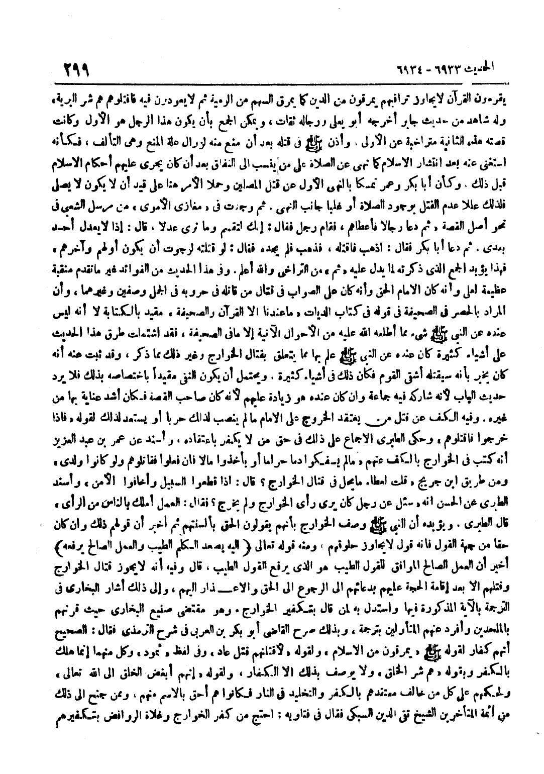 يقرؤون الْقُرْآنَ لَا يُجَاوِزُ تَرَاقِيَهُمْ يَمْرُقُونَ مِنَ الدِّينِ كَمَا يَمْرُقُ السَّهْمُ مِنَ الرَّمِيَّةِ ثُمَّ لَا يَعُودُونَ فِيهِ فَاقْتُلُوهُمْ هُمْ شَرُّ الْبَرِيَّةِ وَلَهُ شَاهِدٌ مِنْ حَدِيثِ جَابِرٍ أَخْرَجَهُ أَبُو يَعْلَى وَرِجَالُهُ ثِقَاتٌ وَيُمْكِنُ الْجَمْعُ بِأَنْ يَكُونَ هَذَا الرَّجُلُ هُوَ الْأَوَّلَ وَكَانَتْ قِصَّتُهُ هَذِهِ الثَّانِيَةُ متراخبة عَنِ الْأُولَى وَأَذِنَ صَلَّى اللَّهُ عَلَيْهِ وَسَلَّمَ فِي قَتْلِهِ بَعْدَ أَنْ مَنَعَ مِنْهُ لِزَوَالِ عِلَّةِ الْمَنْعِ وَهِيَ التَّأَلُّفُ فَكَأَنَّهُ اسْتَغْنَى عَنْهُ بَعْدَ انْتِشَارِ الْإِسْلَامِ كَمَا نَهَى عَنِ الصَّلَاةِ عَلَى مَنْ يُنْسَبُ إِلَى النِّفَاقِ بَعْدَ أَنْ كَانَ يَجْرِي عَلَيْهِمْ أَحْكَامُ الْإِسْلَامِ قَبْلَ ذَلِكَ وَكَأَنَّ أَبَا بَكْرٍ وَعُمَرَ تَمَسَّكَا بِالنَّهْيِ الْأَوَّلِ عَنْ قَتْلِ الْمُصَلِّينَ وَحَمَلَا الْأَمْرَ هُنَا عَلَى قَيْدِ أَنْ لَا يَكُونَ لَا يُصَلِّي فَلِذَلِكَ عَلَّلَا عَدَمَ الْقَتْلِ بِوُجُودِ الصَّلَاةِ أَوْ غَلَّبَا جَانِبَ النَّهْيِ ثُمَّ وَجَدْتُ فِي مَغَازِي الْأُمَوِيِّ مِنْ مُرْسَلِ الشَّعْبِيِّ فِي نَحْوِ أَصْلِ الْقِصَّةِ ثُمَّ دَعَا رِجَالًا فَأَعْطَاهُمْ فَقَامَ رَجُلٌ فَقَالَ انك لتقسم وَمَا نرى عدلا قَالَ إِذا لَا يَعْدِلُ أَحَدٌ بَعْدِي ثُمَّ دَعَا أَبَا بَكْرٍ فَقَالَ اذْهَبْ فَاقْتُلْهُ فَذَهَبَ فَلَمْ يَجِدْهُ فَقَالَ لَوْ قَتَلْتُهُ لَرَجَوْتُ أَنْ يَكُونَ أَوَّلَهُمْ وَآخِرَهُمْ فَهَذَا يُؤَيِّدُ الْجَمْعَ الَّذِي ذَكَرْتُهُ لِمَا يَدُلُّ عَلَيْهِ ثُمَّ مِنَ التَّرَاخِي وَاللَّهُ أَعْلَمُ وَفِي هَذَا الْحَدِيثِ مِنَ الْفَوَائِدِ غَيْرُ مَا تَقَدَّمَ مَنْقَبَةٌ عَظِيمَةٌ لِعَلِيٍّ وَأَنَّهُ كَانَ الْإِمَامَ الْحَقَّ وَأَنَّهُ كَانَ عَلَى الصَّوَابِ فِي قِتَالِ مَنْ قَاتَلَهُ فِي حُرُوبِهِ فِي الْجَمَلِ وَصِفِّينَ وَغَيْرِهِمَا وَأَنَّ الْمُرَادَ بِالْحَصْرِ فِي الصَّحِيفَةِ فِي قَوْلِهِ فِي كِتَابِ الدِّيَاتِ مَا عِنْدَنَا إِلَّا الْقُرْآنُ وَالصَّحِيفَةُ مُقَيَّدٌ بِالْكِتَابَةِ لَا أَنَّهُ لَيْسَ عِنْدَهُ عَنِ النَّبِيِّ صَلَّى اللَّهُ عَلَيْهِ وَسَلَّمَ شَيْءٌ مِمَّا أَطْلَعَهُ اللَّهُ عَلَيْهِ مِنَ الْأَحْوَالِ الْآتِيَةِ إِلَّا مَا فِي الصَّحِيفَةِ فَقَدِ اشْتَمَلَتْ طُرُقُ هَذَا الْحَدِيثِ عَلَى أَشْيَاءَ كَثِيرَةٍ كَانَ عِنْدَهُ عَنِ النَّبِيِّ صَلَّى اللَّهُ عَلَيْهِ وَسَلَّمَ عِلْمٌ بِهَا مِمَّا يَتَعَلَّقُ بِقِتَالِ الْخَوَارِجِ وَغَيْرِ ذَلِكَ مِمَّا ذُكِرَ وَقَدْ ثَبَتَ عَنْهُ أَنَّهُ كَانَ يُخْبِرُ بِأَنَّهُ سَيَقْتُلُهُ أَشْقَى الْقَوْمِ فَكَانَ ذَلِكَ فِي أَشْيَاءَ كَثِيرَةٍ وَيَحْتَمِلُ أَنْ يَكُونَ النَّفْيُ مُقَيَّدًا بِاخْتِصَاصِهِ بِذَلِكَ فَلَا يَرِدُ حَدِيثَ الْبَابِ لِأَنَّهُ شَارَكَهُ فِيهِ جَمَاعَةٌ وَإِنْ كَانَ عِنْدَهُ هُوَ زِيَادَةٌ عَلَيْهِمْ لِأَنَّهُ كَانَ صَاحِبَ الْقِصَّةِ فَكَانَ أَشَدَّ عِنَايَةً بِهَا مِنْ غَيْرِهِ وَفِيهِ الْكَفُّ عَنْ قَتْلِ مَنْ يَعْتَقِدُ الْخُرُوجَ عَلَى الْإِمَامِ مَا لَمْ يَنْصِبْ لِذَلِكَ حَرْبًا أَوْ يَسْتَعِدَّ لِذَلِكَ لِقَوْلِهِ فَإِذَا خَرَجُوا فَاقْتُلُوهُمْ وَحَكَى الطَّبَرِيُّ الْإِجْمَاعَ عَلَى ذَلِكَ فِي حَقِّ مَنْ لَا يُكَفَّرُ بِاعْتِقَادِهِ وَأَسْنَدَ عَنْ عُمَرَ بْنِ عَبْدِ الْعَزِيزِ أَنَّهُ كَتَبَ فِي الْخَوَارِجِ بِالْكَفِّ عَنْهُمْ مَا لَمْ يَسْفِكُوا دَمًا حَرَامًا أَوْ يَأْخُذُوا مَالًا فَإِنْ فَعَلُوا فَقَاتِلُوهُمْ وَلَوْ كَانُوا وَلَدي وَمن طَرِيق بن جُرَيْجٍ قُلْتُ لِعَطَاءٍ مَا يَحِلُّ فِي قِتَالِ الْخَوَارِج 