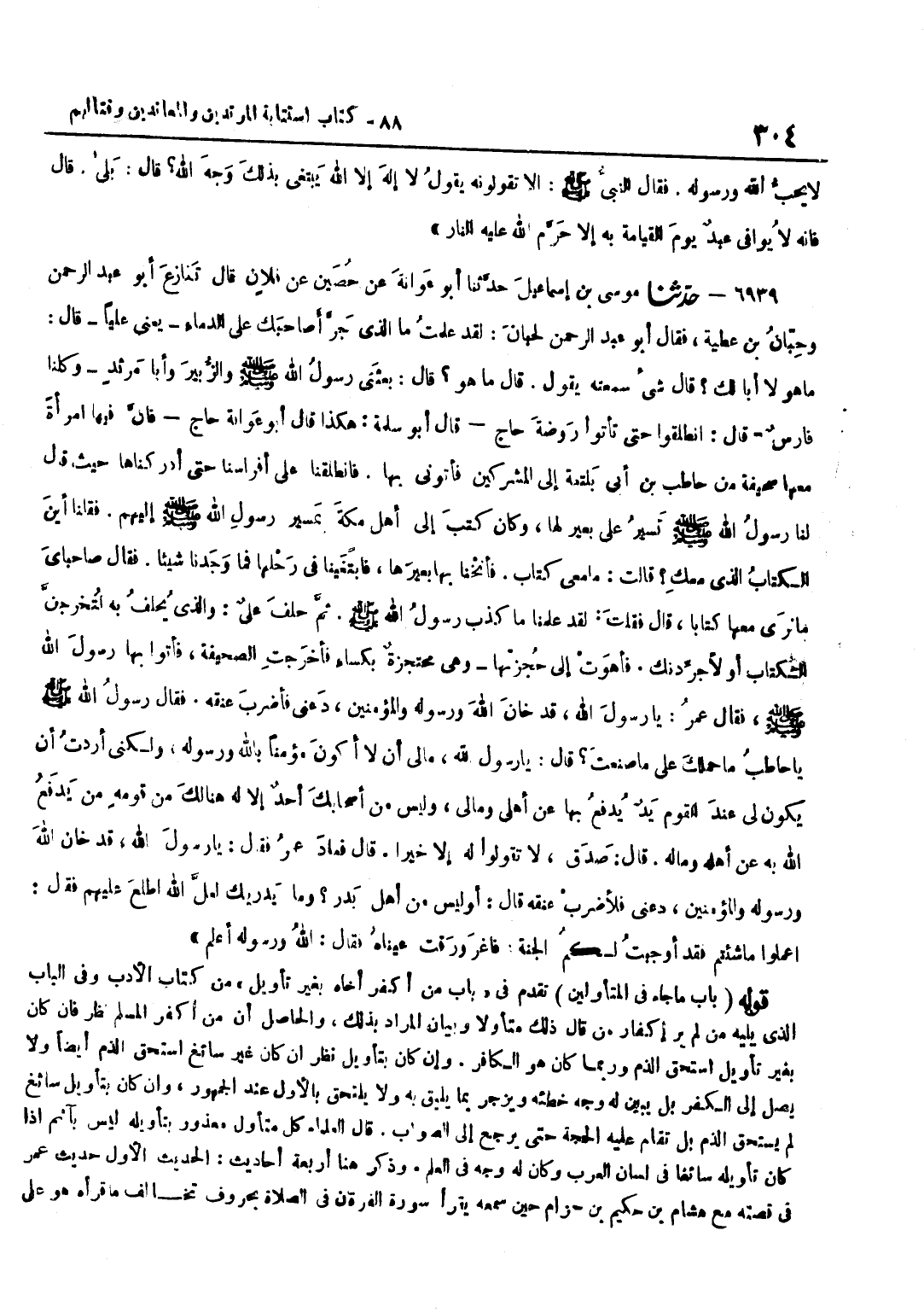 تَقَدَّمَ فِي بَابِ مَنْ أَكْفَرَ أَخَاهُ بِغَيْرِ تَأْوِيلٍ مِنْ كِتَابِ الْأَدَب وَفِي الْبَاب الَّذِي يَلِيهِ مَنْ لَمْ يَرَ إِكْفَارَ مَنْ قَالَ ذَلِكَ مُتَأَوِّلًا وَبَيَانُ الْمُرَادِ بِذَلِكَ وَالْحَاصِلُ أَنَّ مَنْ أَكْفَرَ الْمُسْلِمَ نُظِرَ فَإِنْ كَانَ بِغَيْرِ تَأْوِيلٍ اسْتَحَقَّ الذَّمَّ وَرُبَّمَا كَانَ هُوَ الْكَافِرَ وَإِنْ كَانَ بِتَأْوِيلٍ نُظِرَ إِنْ كَانَ غَيْرُ سَائِغٍ اسْتَحَقَّ الذَّمَّ أَيْضًا وَلَا يَصِلُ إِلَى الْكُفْرِ بَلْ يُبَيَّنُ لَهُ وَجْهُ خَطَئِهِ وَيُزْجَرُ بِمَا يَلِيقُ بِهِ وَلَا يَلْتَحِقُ بِالْأَوَّلِ عِنْدَ الْجُمْهُورِ وَإِنْ كَانَ بِتَأْوِيلٍ سَائِغٍ لَمْ يَسْتَحِقَّ الذَّمَّ بَلْ تُقَامُ عَلَيْهِ الْحُجَّةُ حَتَّى يَرْجِعَ إِلَى الصَّوَابِ قَالَ الْعُلَمَاءُ كُلُّ مُتَأَوِّلٍ مَعْذُورٌ بِتَأْوِيلِهِ لَيْسَ بِآثِمٍ إِذَا كَانَ تَأْوِيلُهُ سَائِغًا فِي لِسَانِ الْعَرَبِ وَكَانَ لَهُ وَجْهٌ فِي الْعِلْمِ وَذَكَرَ هُنَا أَرْبَعَةَ أَحَادِيثَ الْحَدِيثُ الْأَوَّلُ حَدِيثُ عُمَرَ فِي قِصَّتِهِ مَعَ هِشَامِ بْنِ حَكِيمِ بْنِ حِزَامٍ حِينَ سَمِعَهُ يَقْرَأُ سُورَةَ الْفُرْقَانِ فِي الصَّلَاةِ بِحُرُوفٍ تُخَالِفُ مَا قَرَأَهُ هُوَ على
