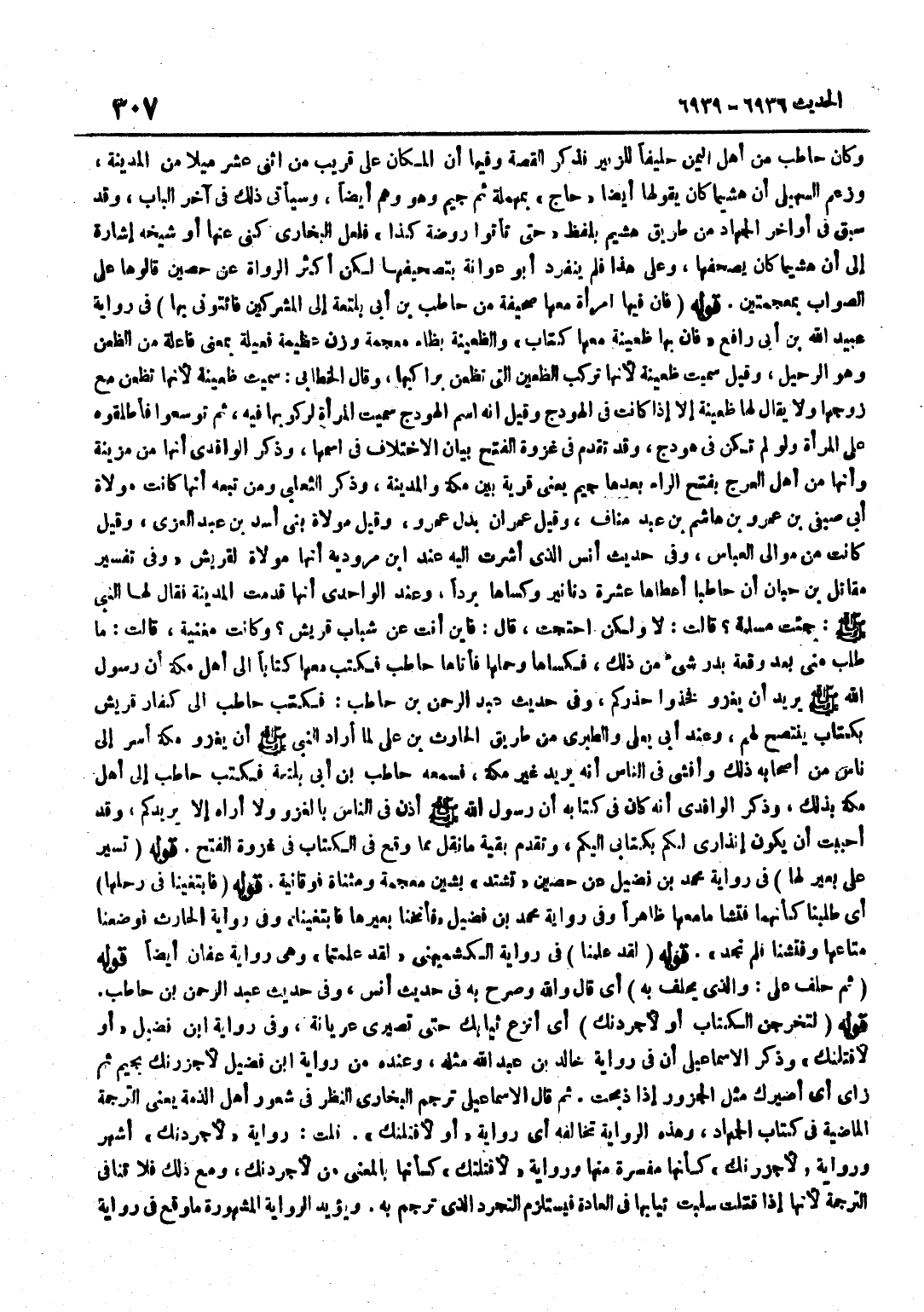 وَكَانَ حَاطِبٌ مِنْ أَهْلِ الْيَمَنِ حَلِيفًا لِلزُّبَيْرِ فَذَكَرَ الْقِصَّةَ وَفِيهَا أَنَّ الْمَكَانَ عَلَى قَرِيبٍ مِنِ اثْنَيْ عَشَرَ مِيلًا مِنَ الْمَدِينَةِ وَزَعَمَ السُّهَيْلِيُّ أَنَّ هُشَيْمًا كَانَ يَقُولُهَا أَيْضًا حَاجٍ بِمُهْمَلَةٍ ثُمَّ جِيمٍ وَهُوَ وَهْمٌ أَيْضًا وَسَيَأْتِي ذَلِكَ فِي آخِرِ الْبَابِ وَقَدْ سَبَقَ فِي أَوَاخِرِ الْجِهَادِ مِنْ طَرِيقِ هُشَيْمٍ بِلَفْظِ حَتَّى تَأْتُوا رَوْضَةَ كَذَا فَلَعَلَّ الْبُخَارِيَّ كَنَى عَنْهَا أَوْ شَيْخَهُ إِشَارَةٌ إِلَى أَنَّ هُشَيْمًا كَانَ يُصَحِّفُهَا وَعَلَى هَذَا فَلَمْ يَنْفَرِدْ أَبُو عَوَانَةَ بِتَصْحِيفِهَا لَكِنَّ أَكْثَرَ الرُّوَاةِ عَنْ حُصَيْنٍ قَالُوهَا عَلَى الصَّوَابِ بِمُعْجَمَتَيْنِ قَوْلُهُ فَإِنَّ فِيهَا امْرَأَةً مَعَهَا صَحِيفَةٌ مِنْ حَاطِبِ بْنِ أَبِي بَلْتَعَةَ إِلَى الْمُشْركين فائتوني بِهَا فِي رِوَايَةِ عُبَيْدِ اللَّهِ بْنِ أَبِي رَافِعٍ فَإِنَّ بِهَا ظَعِينَةً مَعَهَا كِتَابٌ وَالظَّعِينَةُ بِظَاءٍ مُعْجَمَةٍ وَزْنُ عَظِيمَةٍ فَعِيلَةٌ بِمَعْنَى فَاعِلَةٍ مِنَ الظَّعْنِ وَهُوَ الرَّحِيلُ وَقِيلَ سُمِّيَتْ ظَعِينَةً لِأَنَّهَا تَرْكَبُ الظَّعِينَ الَّتِي تَظْعَنُ بِرَاكِبِهَا وَقَالَ الْخَطَّابِيُّ سُمِّيَتْ ظَعِينَةً لِأَنَّهَا تَظْعَنُ مَعَ زَوْجِهَا وَلَا يُقَالُ لَهَا ظَعِينَةٌ إِلَّا إِذَا كَانَتْ فِي الْهَوْدَجِ وَقِيلَ إِنَّهُ اسْمُ الْهَوْدَجِ سُمِّيَتِ الْمَرْأَةُ لِرُكُوبِهَا فِيهِ ثُمَّ تَوَسَّعُوا فَأَطْلَقُوهُ عَلَى الْمَرْأَةِ وَلَوْ لَمْ تَكُنْ فِي هَوْدَجٍ وَقَدْ تَقَدَّمَ فِي غَزْوَةِ الْفَتْحِ بَيَانُ الِاخْتِلَافِ فِي اسْمِهَا وَذَكَرَ الْوَاقِدِيُّ أَنَّهَا مِنْ مُزَيْنَةَ وَأَنَّهَا مِنْ أَهْلِ الْعَرَجِ بِفَتْحِ الرَّاءِ بَعْدَهَا جِيمٌ يَعْنِي قَرْيَةً بَيْنَ مَكَّةَ وَالْمَدِينَةِ وَذَكَرَ الثَّعْلَبِيُّ وَمَنْ تَبِعَهُ أَنَّهَا كَانَتْ مَوْلَاةَ أَبِي صَيْفِيِّ بْنِ عَمْرِو بْنِ هَاشِمِ بْنِ عَبْدِ مَنَافٍ وَقِيلَ عِمْرَانُ بَدَلَ عَمْرٍو وَقِيلَ مَوْلَاةُ بَنِي أَسَدِ بْنِ عَبْدِ الْعُزَّى وَقِيلَ كَانَتْ مِنْ مَوَالِي الْعَبَّاسِ وَفِي حَدِيثِ أَنَسٍ الَّذِي أَشَرْتُ إِلَيْهِ عِنْدَ بن مَرْوُدَيْهِ أَنَّهَا مَوْلَاةٌ لِقُرَيْشٍ وَفِي تَفْسِيرِ مُقَاتِلِ بْنِ حِبَّانَ أَنَّ حَاطِبًا أَعْطَاهَا عَشَرَةَ دَنَانِيرَ وَكَسَاهَا بُرْدًا وَعِنْدَ الْوَاحِدِيِّ أَنَّهَا قَدِمَتِ الْمَدِينَةَ فَقَالَ لَهَا النَّبِيُّ صَلَّى اللَّهُ عَلَيْهِ وَسَلَّمَ جِئْتِ مُسْلِمَةً قَالَتْ لَا وَلَكِنِ احْتَجْتُ قَالَ فَأَيْنَ أَنْتِ عَنْ شَبَابِ قُرَيْشٍ وَكَانَتْ مُغَنِّيَةً قَالَتْ مَا طُلِبَ مِنِّي بَعْدَ وَقْعَةِ بَدْرٍ شَيْءٌ مِنْ ذَلِكَ فَكَسَاهَا وَحَمَلَهَا فَأَتَاهَا حَاطِبٌ فَكَتَبَ مَعَهَا كِتَابًا إِلَى أَهْلِ مَكَّةَ أَنَّ رَسُولَ اللَّهِ صَلَّى اللَّهُ عَلَيْهِ وَسَلَّمَ يُرِيدُ أَنْ يَغْزُوَ فَخُذُوا حِذْرَكُمْ وَفِي حَدِيثِ عَبْدِ الرَّحْمَنِ بْنِ حَاطِبٍ فَكَتَبَ حَاطِبٌ إِلَى كُفَّارِ قُرَيْشٍ بِكِتَابٍ يَنْتَصِحُ لَهُمْ وَعِنْدَ أَبِي يَعْلَى وَالطَّبَرِيِّ مِنْ طَرِيقِ الْحَارِثِ بْنِ عَلِيٍّ لَمَّا أَرَادَ النَّبِيُّ صَلَّى اللَّهُ عَلَيْهِ وَسَلَّمَ أَنْ يَغْزُوَ مَكَّةَ أَسَرَّ إِلَى نَاسٍ مِنْ أَصْحَابِهِ ذَلِكَ وَأَفْشَى فِي النَّاسِ أَنَّهُ يُرِيدُ غَيْرَ مَكَّةَ فَسَمِعَهُ حَاطِبُ بْنُ أَبِي بَلْتَعَةَ فَكَتَبَ حَاطِبٌ إِلَى أَهْلِ مَكَّةَ بِذَلِكَ وَذَكَرَ الْوَاقِدِيُّ أَنَّهُ كَانَ فِي كِتَابِهِ أَنَّ رَسُولَ اللَّهِ صَلَّى اللَّهُ عَلَيْهِ وَسَلَّمَ أَذَّنَ فِي النَّاسِ بِالْغَزْوِ وَلَا أُرَاهُ إِلَّا ي