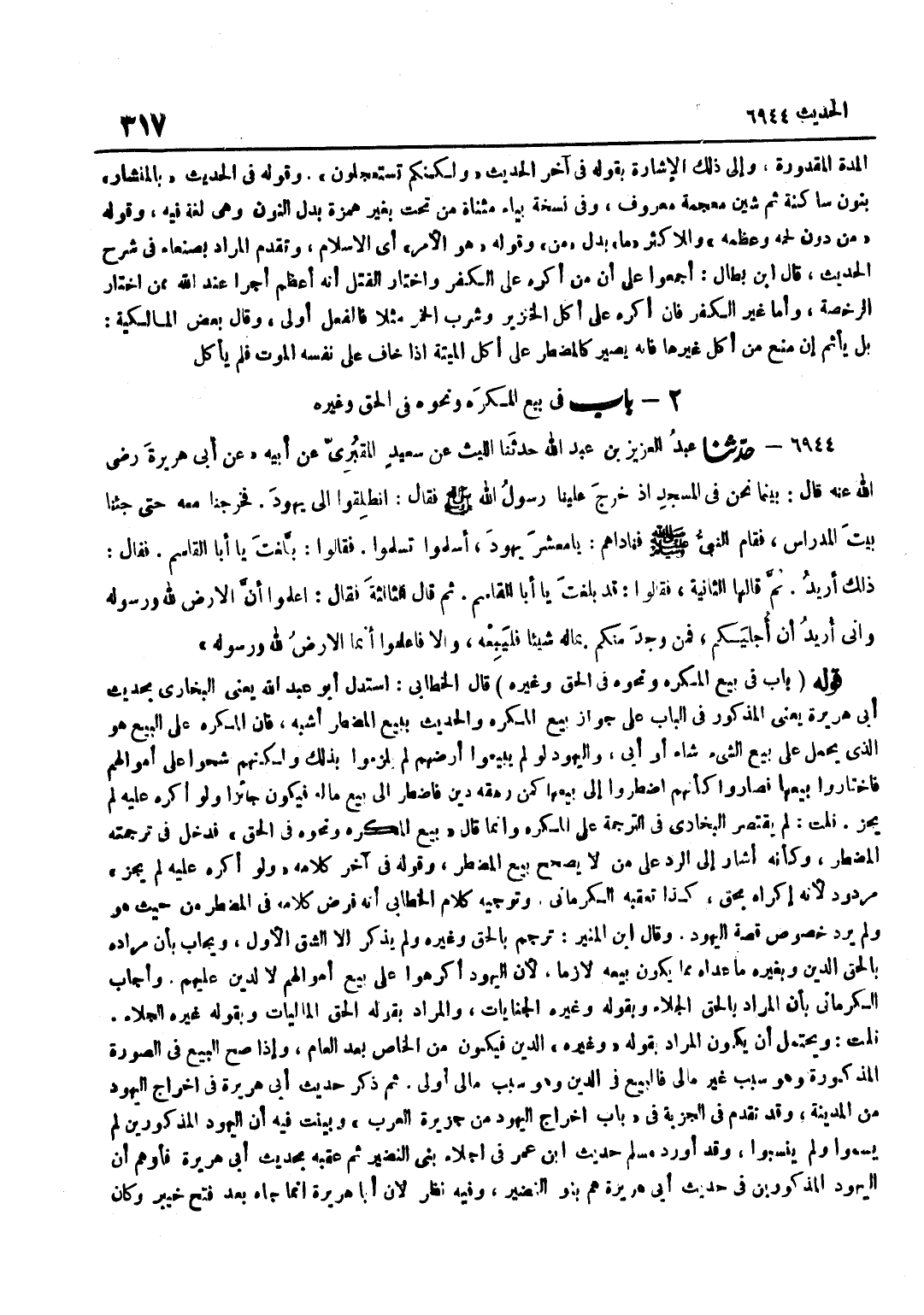 قَالَ الْخَطَّابِيُّ اسْتَدَلَّ أَبُو عَبْدِ اللَّهِ يَعْنِي الْبُخَارِيَّ بِحَدِيثِ أَبِي هُرَيْرَةَ يَعْنِي الْمَذْكُورَ فِي الْبَابِ عَلَى جَوَازِ بَيْعِ الْمُكْرَهِ وَالْحَدِيثُ بِبَيْعِ الْمُضْطَرِّ أَشْبَهُ فَإِنَّ الْمُكْرَهَ عَلَى الْبَيْعِ هُوَ الَّذِي يُحْمَلُ عَلَى بَيْعِ الشَّيْءِ شَاءَ أَوْ أَبَى وَالْيَهُودُ لَوْ لَمْ يَبِيعُوا أَرْضَهُمْ لَمْ يُلْزَمُوا بِذَلِكَ وَلَكِنَّهُمْ شَحُّوا عَلَى أَمْوَالِهِمْ فَاخْتَارُوا بَيْعَهَا فَصَارُوا كَأَنَّهُمُ اضْطُرُّوا إِلَى بَيْعِهَا كَمَنْ رَهِقَهُ دَيْنٌ فَاضْطُرَّ إِلَى بَيْعِ مَالَهُ فَيَكُونُ جَائِزًا وَلَوْ أُكْرِهَ عَلَيْهِ لَمْ يَجُزْ قُلْتُ لَمْ يَقْتَصِرِ الْبُخَارِيُّ فِي التَّرْجَمَةِ عَلَى الْمُكْرَهِ وَإِنَّمَا قَالَ بَيْعُ الْمُكْرَهِ وَنَحْوُهُ فِي الْحق فَدخل فِي تَرْجَمَتِهِ الْمُضْطَرُّ وَكَأَنَّهُ أَشَارَ إِلَى الرَّدِّ عَلَى مَنْ لَا يُصَحِّحُ بَيْعَ الْمُضْطَرِّ وَقَوْلُهُ فِي أخر كَلَامه وَلَو أُكْرِهَ عَلَيْهِ لَمْ يَجُزْ مَرْدُودٌ لِأَنَّهُ إِكْرَاهٌ بِحَقٍّ كَذَا تَعَقَّبَهُ الْكِرْمَانِيُّ وَتَوْجِيهُ كَلَامِ الْخَطَّابِيِّ أَنَّهُ فَرَضَ كَلَامَهُ فِي الْمُضْطَرِّ مِنْ حَيْثُ هُوَ وَلَمْ يُرِدْ خُصُوصَ قِصَّةِ الْيَهُودِ وَقَالَ بن الْمُنِيرِ تَرْجَمَ بِالْحَقِّ وَغَيْرِهِ وَلَمْ يَذْكُرْ إِلَّا الشِّقَّ الْأَوَّلَ وَيُجَابُ بِأَنَّ مُرَادَهُ بِالْحَقِّ الدَّيْنُ وَبِغَيْرِهِ مَا عَدَاهُ مِمَّا يَكُونُ بَيْعُهُ لَازِمًا لِأَنَّ الْيَهُودَ أُكْرِهُوا عَلَى بَيْعِ أَمْوَالِهِمْ لَا لِدَيْنٍ عَلَيْهِمْ وَأَجَابَ الْكِرْمَانِيُّ بِأَنَّ الْمُرَادَ بِالْحَقِّ الْجَلَاءُ وَبِقَوْلِهِ وَغَيْرِهِ الْجِنَايَاتُ وَالْمُرَادُ بِقَوْلِهِ الْحَقَّ الْمَالِيَّاتُ وَبِقَوْلِهِ غَيْرَهُ الْجَلَاءُ قُلْتُ وَيَحْتَمِلُ أَنْ يَكُونَ الْمُرَادُ بِقَوْلِهِ وَغَيْرِهِ الدَّيْنَ فَيَكُونُ مِنَ الْخَاصِّ بَعْدَ الْعَامِّ وَإِذَا صَحَّ الْبَيْعُ فِي الصُّورَةِ الْمَذْكُورَةِ وَهُوَ سَبَبٌ غَيْرُ مَالِيٍّ فَالْبَيْعُ فِي الدّين وَهُوَ سَبَب مَالِي أولى ثمَّ ذَكَرَ حَدِيثَ أَبِي هُرَيْرَةَ فِي إِخْرَاجِ الْيَهُودِ مِنَ الْمَدِينَةِ وَقَدْ تَقَدَّمَ فِي الْجِزْيَةِ فِي بَابِ إِخْرَاجِ الْيَهُودِ مِنْ جَزِيرَةِ الْعَرَبِ وَبَيَّنْتُ فِيهِ أَنَّ الْيَهُودَ الْمَذْكُورِينَ لَمْ يُسَمَّوْا وَلَمْ ينسبوا وَقد أورد مُسلم حَدِيث بن عُمَرَ فِي إِجْلَاءِ بَنِي النَّضِيرِ ثُمَّ عَقَّبَهُ بِحَدِيثِ أَبِي هُرَيْرَةَ فَأَوْهَمَ أَنَّ الْيَهُودَ الْمَذْكُورِينَ فِي حَدِيثِ أَبِي هُرَيْرَةَ هُمْ بَنُو النَّضِيرِ وَفِيهِ نَظَرٌ لِأَنَّ أَبَا هُرَيْرَةَ إِنَّمَا جَاءَ بَعْدَ فَتْحِ خَيْبَرَ وَكَانَ