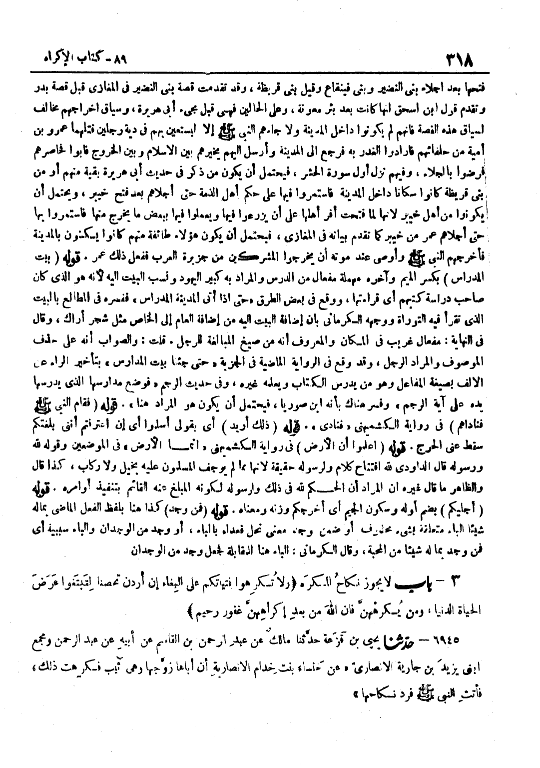[6944] قَوْلُهُ بَيْتُ الْمِدْرَاسِ بِكَسْرِ الْمِيمِ وَآخِرُهُ مُهْمَلَةٌ مِفْعَالٌ مِنَ الدَّرْسِ وَالْمُرَادُ بِهِ كَبِيرُ الْيَهُودِ وَنُسِبَ الْبَيْتُ إِلَيْهِ لِأَنَّهُ هُوَ الَّذِي كَانَ صَاحِبَ دِرَاسَةِ كُتُبِهِمْ أَيْ قِرَاءَتِهَا وَوَقَعَ فِي بَعْضِ الطُّرُقِ حَتَّى إِذَا أَتَى الْمَدِينَةَ الْمدَارِس فَفَسَّرَهُ فِي الْمَطَالِعِ بِالْبَيْتِ الَّذِي تُقْرَأُ فِيهِ التَّوْرَاةُ وَوَجَّهَهُ الْكِرْمَانِيُّ بِأَنَّ إِضَافَةَ الْبَيْتِ إِلَيْهِ مِنْ إِضَافَةِ الْعَامِّ إِلَى الْخَاصِّ مِثْلُ شَجَرِ أَرَاكٍ وَقَالَ فِي النِّهَايَةِ مِفْعَالٌ غَرِيبٌ فِي الْمَكَانِ وَالْمَعْرُوفُ أَنَّهُ مِنْ صِيَغِ الْمُبَالَغَةِ لِلرَّجُلِ قُلْتُ وَالصَّوَابُ أَنَّهُ عَلَى حَذْفِ الْمَوْصُوفِ وَالْمُرَادُ الرَّجُلُ وَقَدْ وَقَعَ فِي الرِّوَايَةِ الْمَاضِيَةِ فِي الْجِزْيَةِ حَتَّى جِئْنَا بَيْتَ الْمُدَارِسِ بِتَأْخِيرِ الرَّاءِ عَنِ الْأَلِفِ بِصِيغَةِ الْمُفَاعِلِ وَهُوَ مَنْ يَدْرُسُ الْكِتَابَ وَيُعَلِّمُهُ غَيْرَهُ وَفِي حَدِيثِ الرَّجْمِ فَوَضَعَ مُدَارِسُهَا الَّذِي يَدْرُسُهَا يَدَهُ عَلَى آيَةِ الرَّجْمِ وَفسّر هُنَاكَ بِأَنَّهُ بن صُورِيَّا فَيَحْتَمِلُ أَنْ يَكُونَ هُوَ الْمُرَادَ هُنَا قَوْلُهُ فَقَامَ النَّبِيُّ صَلَّى اللَّهُ عَلَيْهِ وَسَلَّمَ فَنَادَاهُمْ فِي رِوَايَةِ الْكُشْمِيهَنِيِّ فَنَادَى قَوْلُهُ ذَلِكَ أُرِيدَ أَيْ بِقَوْلِي أَسْلِمُوا أَيْ إِنِ اعْتَرَفْتُمْ أَنَّنِي بَلَّغْتُكُمْ سَقَطَ عَنِّيَ الْحَرَجُ قَوْلُهُ اعْلَمُوا أَنَّ الْأَرْضَ فِي رِوَايَةِ الْكُشْمِيهَنِيِّ إِنَّمَا الْأَرْضُ فِي الْمَوْضِعَيْنِ وَقَوْلُهُ لِلَّهِ وَرَسُولِهِ قَالَ الدَّاوُدِيُّ لِلَّهِ افْتِتَاحُ كَلَامٍ وَلِرَسُولِهِ حَقِيقَةٌ لِأَنَّهَا مِمَّا لَمْ يُوجِفِ الْمُسْلِمُونَ عَلَيْهِ بِخَيْلٍ وَلَا رِكَابٍ كَذَا قَالَ وَالظَّاهِرُ مَا قَالَ غَيْرُهُ أَنَّ الْمُرَادَ أَنَّ الْحُكْمَ لِلَّهِ فِي ذَلِكَ وَلِرَسُولِهِ لِكَوْنِهِ الْمُبَلِّغَ عَنْهُ الْقَائِمَ بِتَنْفِيذِ أَوَامِرِهِ قَوْلُهُ أُجْلِيكُمْ بِضَمِّ أَوَّلِهِ وَسُكُونِ الْجِيمِ أَيْ أُخْرِجُكُمْ وَزْنُهُ وَمَعْنَاهُ قَوْلُهُ فَمَنْ وَجَدَ كَذَا هُنَا بِلَفْظِ الْفِعْلِ الْمَاضِي بِمَالِهِ شَيْئًا الْبَاءُ مُتَعَلِّقَةٌ بِشَيْءٍ مَحْذُوفٍ أَوْ ضَمَّنَ وَجَدَ مَعْنَى نَحَلَ فَعَدَّاهُ بِالْبَاءِ أَوْ وَجَدَ مِنَ الْوِجْدَانِ وَالْبَاءُ سَبَبِيَّة أَي فَمن وجد بِمَالِه شَيْئًا مِنَ الْمَحَبَّةِ وَقَالَ الْكِرْمَانِيُّ الْبَاءُ هُنَا للمقابلة فَجعل وجد من الوجدان