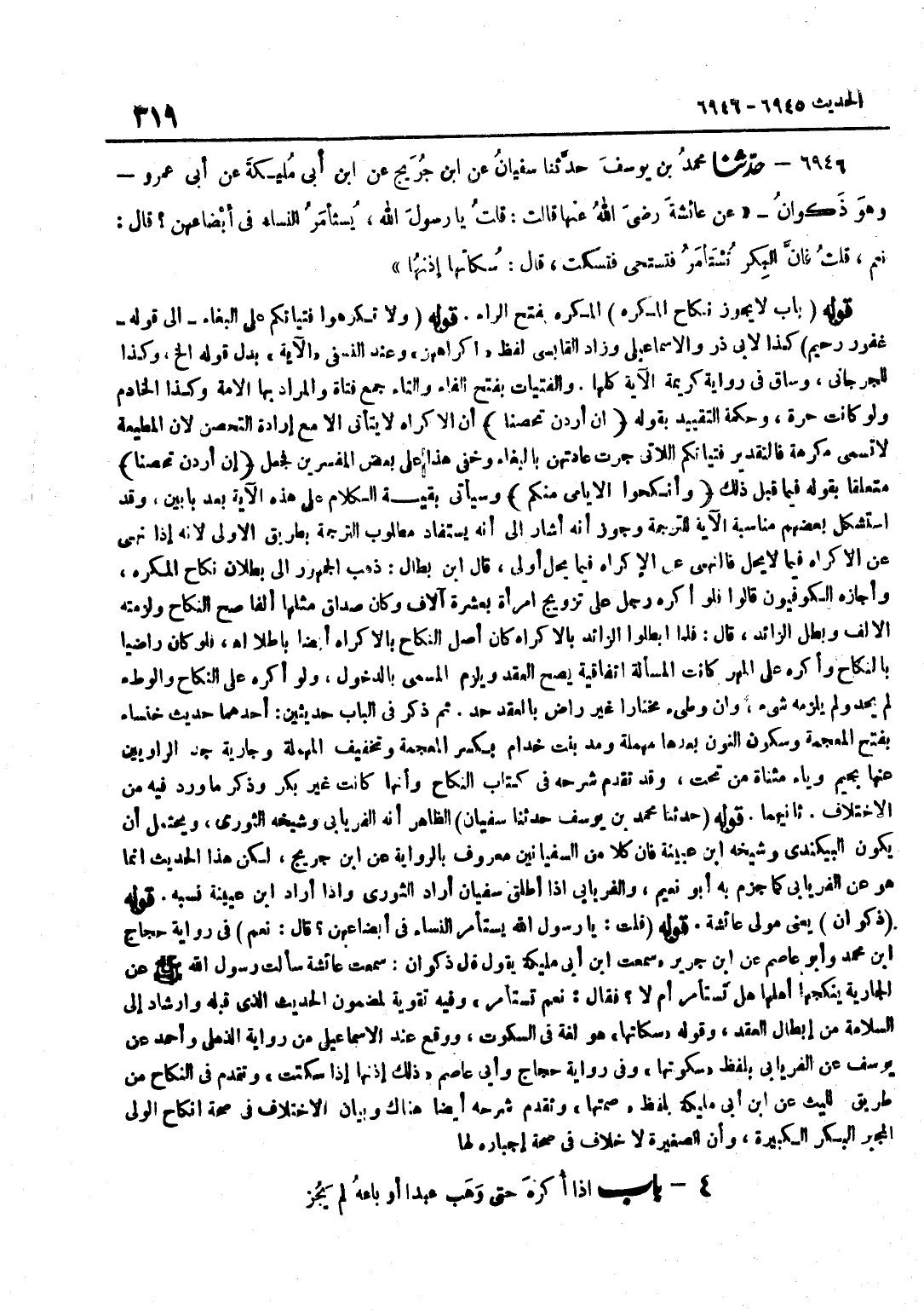 [6946] قَوْلُهُ حَدَّثَنَا مُحَمَّدُ بْنُ يُوسُفَ حَدَّثَنَا سُفْيَانُ الظَّاهِرُ أَنَّهُ الْفِرْيَابِيُّ وَشَيْخُهُ الثَّوْرِيُّ وَيَحْتَمِلُ أَنْ يكون البيكندي وَشَيْخه بن عُيَيْنَةَ فَإِنَّ كُلًّا مِنَ السُّفْيَانَيْنِ مَعْرُوفٌ بِالرِّوَايَةِ عَن بن جُرَيْجٍ لَكِنَّ هَذَا الْحَدِيثَ إِنَّمَا هُوَ عَنِ الْفِرْيَابِيِّ كَمَا جَزَمَ بِهِ أَبُو نُعَيْمٍ وَالْفِرْيَابِيُّ إِذَا أَطْلَقَ سُفْيَانَ أَرَادَ الثَّوْرِيَّ وَإِذَا أَرَادَ بن عُيَيْنَةَ نَسَبَهُ قَوْلُهُ ذَكْوَانُ يَعْنِي مَوْلَى عَائِشَةَ قَوْلُهُ قُلْتُ يَا رَسُولَ اللَّهِ يُسْتَأْمَرُ النِّسَاءُ فِي أَبْضَاعِهِنَّ قَالَ نَعَمْ فِي رِوَايَةِ حَجَّاجِ بن مُحَمَّد وَأَبُو عَاصِم عَن بن جرير سَمِعت بن أَبِي مُلَيْكَةَ يَقُولُ قَالَ ذَكْوَانُ سَمِعْتُ عَائِشَةَ سَأَلْتُ رَسُولَ اللَّهِ صَلَّى اللَّهُ عَلَيْهِ وَسَلَّمَ عَنْ الْجَارِيَةِ يَنْكِحُهَا أَهْلُهَا هَلْ تُسْتَأْمَرُ أَمْ لَا فَقَالَ نَعَمْ تُسْتَأْمَرُ وَفِيهِ تَقْوِيَةٌ لِمَضْمُونِ الْحَدِيثِ الَّذِي قَبْلَهُ وَإِرْشَادٌ إِلَى السَّلَامَةِ مِنْ إبِْطَال العقد وَقَوله سكاتها هُوَ لُغَةٌ فِي السُّكُوتِ وَوَقَعَ عِنْدَ الْإِسْمَاعِيلِيِّ مِنْ رِوَايَةِ الذُّهْلِيِّ وَأَحْمَدَ عَنْ يُوسُفَ عَنْ الْفِرْيَابِيِّ بِلَفْظِ سُكُوتُهَا وَفِي رِوَايَةِ حَجَّاجٍ وَأَبِي عَاصِمٍ ذَلِكَ إِذْنُهَا إِذَا سَكَتَتْ وَتَقَدَّمَ فِي النِّكَاحِ من طَرِيق اللَّيْث عَن بن أَبِي مُلَيْكَةَ بِلَفْظِ صَمْتُهَا وَتَقَدَّمَ شَرْحُهُ أَيْضًا هُنَاكَ وَبَيَانُ الِاخْتِلَافِ فِي صِحَّةِ إِنْكَاحِ الْوَلِيِّ الْمُجْبِرِ الْبِكْرَ الْكَبِيرَةَ وَأَنَّ الصَّغِيرَةَ لَا خِلَافَ فِي صِحَة اجباره لَهَا