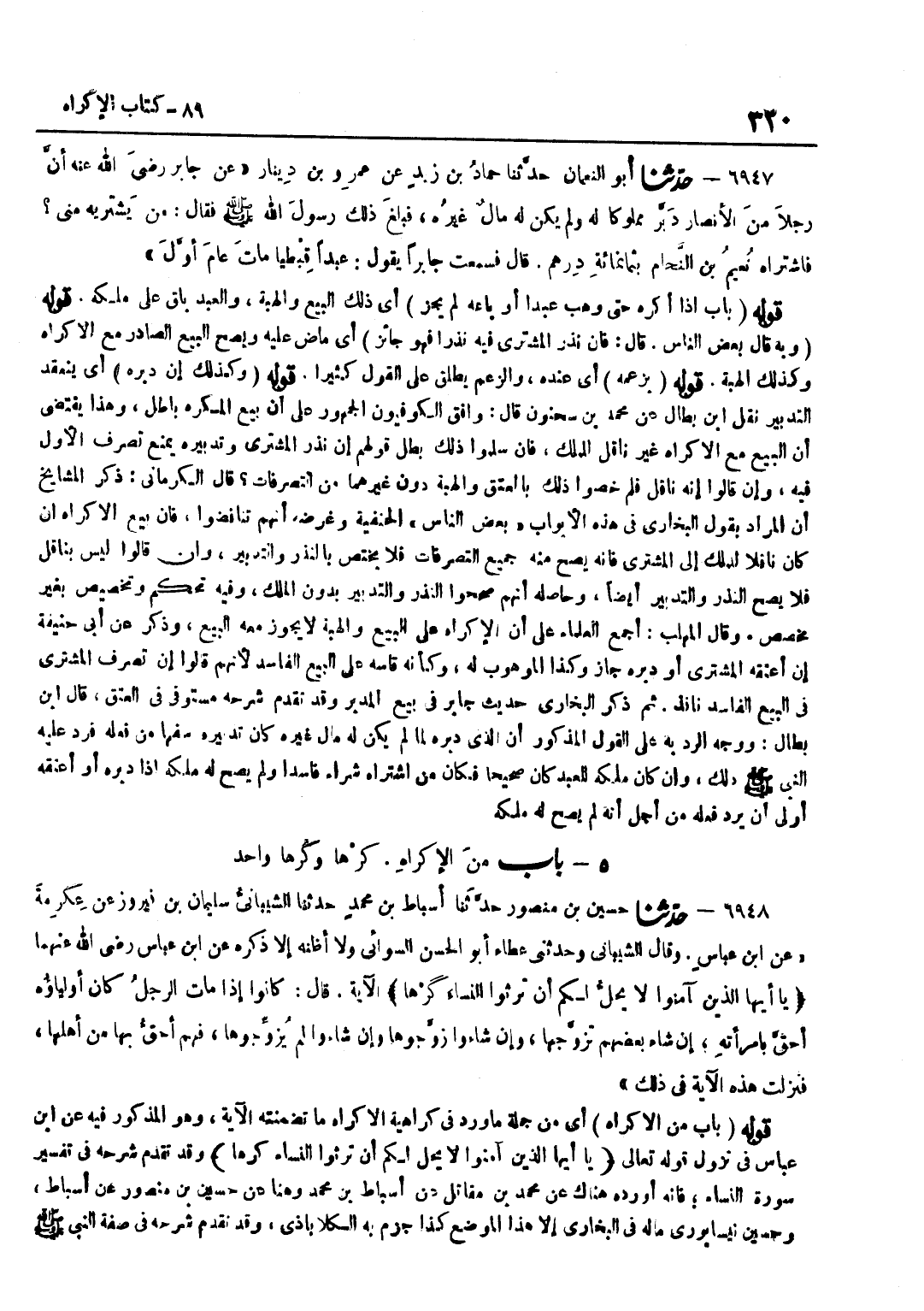 أَيْ ذَلِكَ الْبَيْعُ وَالْهِبَةُ وَالْعَبْدُ بَاقٍ عَلَى مِلْكِهِ قَوْلُهُ وَبِهِ قَالَ بَعْضُ النَّاسِ قَالَ فَإِنْ نَذَرَ الْمُشْتَرِي فِيهِ نَذْرًا فَهُوَ جَائِزٌ أَيْ مَاضٍ عَلَيْهِ وَيَصِحُّ الْبَيْعُ الصَّادِرُ مَعَ الْإِكْرَاهِ وَكَذَلِكَ الْهِبَةُ قَوْلُهُ بِزَعْمِهِ أَيْ عِنْدَهُ وَالزَّعْمُ يُطْلَقُ عَلَى الْقَوْلِ كَثِيرًا قَوْلُهُ وَكَذَلِكَ إِنْ دَبَّرَهُ أَيْ ينْعَقد التَّدْبِير نقل بن بَطَّالٍ عَنْ مُحَمَّدِ بْنِ سَحْنُونٍ قَالَ وَافَقَ الْكُوفِيُّونَ الْجُمْهُورَ عَلَى أَنَّ بَيْعَ الْمُكْرَهُ بَاطِلٌ وَهَذَا يَقْتَضِي أَنَّ الْبَيْعَ مَعَ الْإِكْرَاهِ غَيْرُ نَاقِلٍ لِلْمِلْكِ فَإِنْ سَلَّمُوا ذَلِكَ بَطَلَ قَوْلُهُمْ إِنَّ نَذْرَ الْمُشْتَرِي وَتَدْبِيرَهُ يَمْنَعُ تَصَرُّفَ الْأَوَّلِ فِيهِ وَإِنْ قَالُوا إِنَّهُ نَاقِلٌ فَلِمَ خَصُّوا ذَلِكَ بِالْعِتْقِ وَالْهِبَةِ دُونَ غَيْرِهِمَا مِنَ التَّصَرُّفَاتِ قَالَ الْكِرْمَانِيُّ ذَكَرَ الْمَشَايِخُ أَنَّ الْمُرَادَ بِقَوْلِ الْبُخَارِيِّ فِي هَذِهِ الْأَبْوَابِ بَعْضُ النَّاسِ الْحَنَفِيَّةُ وَغَرَضُهُ أَنَّهُمْ تَنَاقَضُوا فَإِنَّ بَيْعَ الْإِكْرَاهِ إِنْ كَانَ نَاقِلًا لِلْمِلْكِ إِلَى الْمُشْتَرِي فَإِنَّهُ يَصِحُّ مِنْهُ جَمِيعُ التَّصَرُّفَاتِ فَلَا يَخْتَصُّ بِالنَّذْرِ وَالتَّدْبِيرِ وَإِنْ قَالُوا لَيْسَ بِنَاقِلٍ فَلَا يَصِحُّ النَّذْرُ وَالتَّدْبِيرُ أَيْضًا وَحَاصِلُهُ أَنَّهُمْ صَحَّحُوا النَّذْرَ وَالتَّدْبِيرَ بِدُونِ الْمِلْكِ وَفِيهِ تَحَكُّمٌ وَتَخْصِيصٌ بِغَيْرِ مُخَصِّصٍ وَقَالَ الْمُهَلَّبُ أَجْمَعَ الْعُلَمَاءُ عَلَى أَنَّ الْإِكْرَاهَ على البيع وَالْهِبَة لَا يجوز مَعَهُ الْبَيْعُ وَذُكِرَ عَنْ أَبِي حَنِيفَةَ إِنْ أَعْتَقَهُ الْمُشْتَرِي أَوْ دَبَّرَهُ جَازَ وَكَذَا الْمَوْهُوبُ لَهُ وَكَأَنَّهُ قَاسَهُ عَلَى الْبَيْعِ الْفَاسِدِ لِأَنَّهُمْ قَالُوا إِنَّ تَصَرُّفَ الْمُشْتَرِي فِي الْبَيْعِ الْفَاسِدِ نَافِذٌ ثُمَّ ذَكَرَ الْبُخَارِيُّ حَدِيثَ جَابِرٍ فِي بَيْعِ الْمُدَبَّرِ وَقَدْ تَقَدَّمَ شَرْحُهُ مُسْتَوْفًى فِي الْعتْق قَالَ بن بَطَّالٍ وَوَجْهُ الرَّدِّ بِهِ عَلَى الْقَوْلِ الْمَذْكُورِ أَنَّ الَّذِي دَبَّرَهُ لَمَّا لَمْ يَكُنْ لَهُ مَال غَيره كَانَ تَدْبيره سفها من فعله فَرَدَّ عَلَيْهِ النَّبِيُّ صَلَّى اللَّهُ عَلَيْهِ وَسَلَّمَ ذَلِكَ وَإِنْ كَانَ مِلْكُهُ لِلْعَبْدِ كَانَ صَحِيحًا فَكَانَ مَنِ اشْتَرَاهُ شِرَاءً فَاسِدًا وَلَمْ يَصِحَّ لَهُ مِلْكُهُ إِذَا دَبَّرَهُ أَوْ أَعْتَقَهُ أَوْلَى أَنْ يَرُدَّ فِعْلَهُ مِنْ أَجْلِ أَنَّهُ لَمْ يَصح لَهُ ملكه قَوْلُهُ بَابٌ مِنَ الْإِكْرَاهِ أَيْ مِنْ جُمْلَةِ مَا وَرَدَ فِي كَرَاهِيَةِ الْإِكْرَاهِ مَا تَضَمَّنَتْهُ الْآيَة وَهُوَ الْمَذْكُور فِيهِ عَن بن عَبَّاسٍ فِي نُزُولِ قَوْلَهُ تَعَالَى يَا أَيُّهَا الَّذِينَ آمَنُوا لَا يَحِلُّ لَكُمْ أَنْ تَرِثُوا النِّسَاءَ كَرْهًا وَقَدْ تَقَدَّمَ شَرْحُهُ فِي تَفْسِيرِ سُورَةِ النِّسَاءِ فَإِنَّهُ أَوْرَدَهُ هُنَاكَ عَنْ مُحَمَّدِ بْنِ مُقَاتِلٍ عَنْ أَسْبَاطِ بْنِ مُحَمَّدٍ وَهُنَا عَنْ حُسَيْنِ بن مَنْصُور عَن أَسْبَاط وحسين نيسابوري مَاله فِي الْبُخَارِيِّ إِلَّا هَذَا الْمَوْضِعُ كَذَا جَزَمَ بِهِ الْكَلَابَاذِيُّ وَقَدْ تَقَدَّمَ شَرْحُهُ فِي صِفَةِ النَّبِيِّ صَلَّى اللَّهُ عَلَيْهِ وَسَلَّمَ