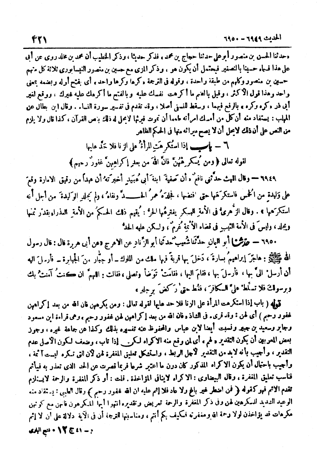 لقَوْله تَعَالَى وَمن يكرههن فَإِنَّ اللَّهَ مِنْ بَعْدِ إِكْرَاهِهِنَّ غَفُورٌ رَحِيمٌ أَيْ لَهُنَّ وَقَدْ قُرِئَ فِي الشَّاذِّ فَإِنَّ اللَّهَ مِنْ بَعْدِ إِكْرَاهِهِنَّ لَهُنَّ غَفُورٌ رَحِيمٌ وَهِي قِرَاءَة بن مَسْعُودٍ وَجَابِرٍ وَسَعِيدِ بْنِ جُبَيْرٍ وَنُسِبَتْ أَيْضًا لِابْنِ عَبَّاسٍ وَالْمَحْفُوظُ عَنْهُ تَفْسِيرُهُ بِذَلِكَ وَكَذَا عَنْ جَمَاعَةٍ غَيْرِهِ وَجَوَّزَ بَعْضُ الْمُعَرَّبِينَ أَنْ يَكُونَ التَّقْدِيرُ لَهُمْ أَيْ لِمَنْ وَقَعَ مِنْهُ الْإِكْرَاه لَكِن إِذا تَابَ وَضعف لكَون الأَصْل عدم التَّقْدِير وَأجِيب بِأَنَّهُ لابد مِنَ التَّقْدِيرِ لِأَجْلِ الرَّبْطِ وَاسْتُشْكِلَ تَعْلِيقُ الْمَغْفِرَةِ لَهُنَّ لِأَنَّ الَّتِي تُكْرَهُ لَيْسَتْ آثِمَةً وَأُجِيبَ بِاحْتِمَالِ أَنْ يَكُونَ الْإِكْرَاهُ الْمَذْكُورُ كَانَ دُونَ مَا اعْتُبِرَ شَرْعًا فَرُبَّمَا قَصَّرَتْ عَنِ الْحَدِّ الَّذِي تعذر بِهِ فيأثم فَنَاسَبَ تَعْلِيقَ الْمَغْفِرَةِ وَقَالَ الْبَيْضَاوِيُّ الْإِكْرَاهُ لَا يُنَافِي الْمُؤَاخَذَةَ قُلْتُ أَوْ ذِكْرُ الْمَغْفِرَةِ وَالرَّحْمَةِ لَا يَسْتَلْزِمُ تَقَدُّمَ الْإِثْمِ فَهُوَ كَقَوْلِهِ فَمَنِ اضْطُرَّ غَيْرَ بَاغٍ وَلَا عَادٍ فَلَا إِثْمَ عَلَيْهِ ان الله غَفُور رَحِيم وَقَالَ الطِّيبِيُّ يُسْتَفَادُ مِنْهُ الْوَعِيدُ الشَّدِيدُ لِلْمُكْرِهِينَ لَهُنَّ وَفِي ذِكْرِ الْمَغْفِرَةِ وَالرَّحْمَةِ تَعْرِيضٌ وَتَقْدِيرُهُ انْتَهُوا أَيُّهَا الْمُكْرِهُونَ فَإِنَّهُنَّ مَعَ كَوْنِهِنَّ مُكْرَهَاتٍ قَدْ يُؤَاخَذْنَ لَوْلَا رَحْمَةُ اللَّهِ وَمَغْفِرَتُهُ فَكَيْفَ بِكَمْ أَنْتُمْ وَمُنَاسَبَتُهَا لِلتَّرْجَمَةِ أَنَّ فِي الْآيَةِ دَلَالَةٌ عَلَى أَنْ لَا إِثْمَ