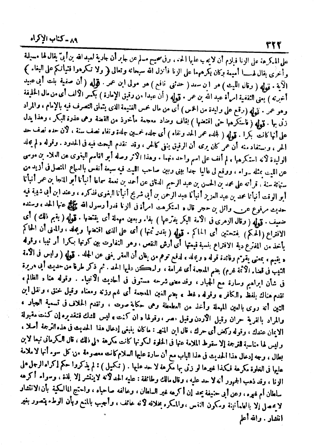 عَلَى الْمُكْرَهَةِ عَلَى الزِّنَا فَيَلْزَمُ أَنْ لَا يَجِبَ عَلَيْهَا الْحَدُّ وَفِي صَحِيحِ مُسْلِمٍ عَنْ جَابِرٍ أَنَّ جَارِيَةً لِعَبْدِ اللَّهِ بْنِ أُبَيٍّ يُقَالُ لَهَا مُسَيْلِمَةُ وَأُخْرَى يُقَالُ لَهَا أُمَيْمَةُ وَكَانَ يُكْرِهُهُمَا عَلَى الزِّنَا فَأَنْزَلَ اللَّهُ سُبْحَانَهُ وَتَعَالَى وَلَا تكْرهُوا فَتَيَاتكُم على الْبغاء الْآيَة قَوْله وَقَالَ اللَّيْث هُوَ بن سعد حَدثنِي نَافِع هُوَ مولى بن عُمَرَ قَوْلُهُ أَنَّ صَفِيَّةَ بِنْتَ أَبِي عُبَيْدٍ أَخْبَرَتْهُ يَعْنِي الثَّقَفِيَّةَ امْرَأَةَ عَبْدِ اللَّهِ بْنِ عُمَرَ قَوْلُهُ أَنَّ عَبْدًا مِنْ رَقِيقِ الْإِمَارَةِ بِكَسْرِ الْأَلِفِ أَيْ مِنْ مَالِ الْخَلِيفَةِ وَهُوَ عُمَرُ قَوْلُهُ وَقَعَ عَلَى وَلِيدَةٍ مِنَ الْخُمُسِ أَيْ مِنْ مَالِ خُمُسِ الْغَنِيمَةِ الَّذِي يَتَعَلَّقُ التَّصَرُّفُ فِيهِ بِالْإِمَامِ وَالْمُرَادُ زَنَى بِهَا قَوْلُهُ فَاسْتَكْرَهَهَا حَتَّى اقْتَضَّهَا بِقَافٍ وَضَادٍ مُعْجَمَةٍ مَأْخُوذٍ مِنَ الْقِضَّةٍ وَهِيَ عُذْرَةُ الْبِكْرِ وَهَذَا يَدُلُّ عَلَى أَنَّهَا كَانَتْ بِكْرًا قَوْلُهُ فَجَلَدَهُ عُمَرُ الْحَدَّ وَنَفَاهُ أَيْ جَلَدَهُ خَمْسِينَ جَلْدَةً وَنَفَاهُ نِصْفَ سَنَةٍ لِأَنَّ حَدَّهُ نِصْفُ حَدِّ الْحُرِّ وَيُسْتَفَادُ مِنْهُ أَنَّ عُمَرَ كَانَ يَرَى أَنَّ الرَّقِيقَ يُنْفَى كَالْحُرِّ وَقَدْ تَقَدَّمَ الْبَحْثُ فِيهِ فِي الْحُدُودِ وَقَوْلُهُ لَمْ يَجْلِدِ الْوَلِيدَةَ لِأَنَّهُ اسْتَكْرَهَهَا لَمْ أَقِفْ عَلَى اسْمٍ وَاحِدٍ مِنْهُمَا وَهَذَا الْأَثَرُ وَصَلَهُ أَبُو الْقَاسِمِ الْبَغَوِيُّ عَنِ الْعَلَاءِ بْنِ مُوسَى عَنِ اللَّيْثِ بِمِثْلِهِ سَوَاءً وَوَقَعَ لِي عَالِيًا جِدًّا بَيْنِي وَبَيْنَ صَاحِبِ اللَّيْثِ فِيهِ سَبْعَةُ أَنْفُسٍ بِالسَّمَاعِ الْمُتَّصِلِ فِي أَزْيَدَ مِنْ سِتِّمِائَةِ سَنَةٍ قَرَأْتُهُ عَلَى مُحَمَّدِ بْنِ الْحَسَنِ بْنِ عَبْدِ الرَّحِيمِ الدَّقَّاقِ عَنْ أَحْمَدَ بْنِ نِعْمَةَ سَمَاعًا أَنْبَأَنَا أَبُو الْمُنَجَّا بْنُ عُمَرَ أَنْبَأَنَا أَبُو الْوَقْتِ أَنْبَأَنَا مُحَمَّدُ بْنُ عَبْدِ الْعَزِيزِ أَنْبَأَنَا عَبْدُ الرَّحْمَنِ بْنُ أبي شُرَيْح أَنبأَنَا الْبَغَوِيّ فَذكره وَعند بن أَبِي شَيْبَةَ فِيهِ حَدِيثٌ مَرْفُوعٌ عَنْ وَائِلِ بْنِ حَجَرٍ قَالَ اسْتُكْرِهَتِ امْرَأَةٌ فِي الزِّنَا فَدَرَأَ رَسُولِ اللَّهِ صَلَّى اللَّهُ عَلَيْهِ وَسَلَّمَ عَنْهَا الْحَدَّ وَسَنَدُهُ ضَعِيفٌ قَوْلُهُ وَقَالَ الزُّهْرِيُّ فِي الْأَمَةِ الْبِكْرِ يَفْتَرِعُهَا بِفَاءٍ وَبِعَيْنٍ مُهْمَلَةٍ أَيْ يَقْتَضُّهَا قَوْلُهُ يُقِيمُ ذَلِكَ أَيِ الِافْتِرَاعَ الْحَكَمُ بِفَتْحَتَيْنِ أَيِ الْحَاكِمُ قَوْلُهُ بِقَدْرِ ثَمَنِهَا أَيْ عَلَى الَّذِي اقْتَضَّهَا وَيُجْلَدُ وَالْمَعْنَى أَنَّ الْحَاكِمَ يَأْخُذُ مِنَ الْمُفْتَرِعِ دِيَةَ الِافْتِرَاعِ بِنِسْبَةٍ قِيمَتُهَا أَيْ أَرْشُ النَّقْصِ وَهُوَ التَّفَاوُتُ بَيْنَ كَوْنِهَا بِكْرًا أَوْ ثَيِّبًا وَقَوْلُهُ يُقِيمُ بِمَعْنَى يُقَوِّمُ وَفَائِدَةُ قَوْلِهِ وَيُجْلَدُ لِدَفْعِ تَوَهُّمِ مَنْ يَظُنُّ أَنَّ الْعُقْرَ يُغْنِي عَنِ الْجَلْدِ قَوْلُهُ وَلَيْسَ فِي الْأَمَةِ الثَّيِّبِ فِي قَضَاءِ الْأَئِمَّةِ غُرْمٌ بِضَمِّ الْمُعْجَمَةِ أَيْ غَرَامَةٌ وَلَكِنْ عَلَيْهَا الْحَدُّ ثُمَّ ذَكَرَ طَرَفًا مِنْ حَدِيثِ أَبِي هُرَيْرَةَ فِي شَأْنِ إِبْرَاهِيمَ وَسَارَّةَ مَعَ الْجَبَّارِ وَقَدْ مَضَى شَرْحُهُ مُسْتَوْفًى فِي أَحَادِيثِ الْأَنْبِيَاءِ وَقَوله
