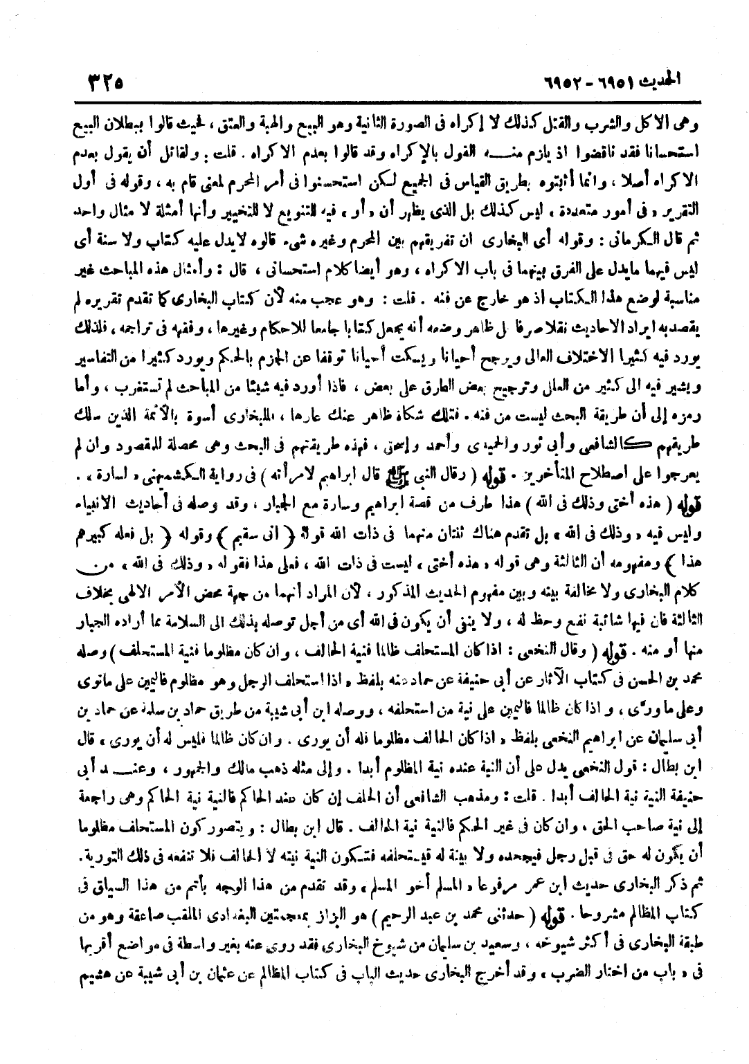 وَهِيَ الْأَكْلُ وَالشُّرْبُ وَالْقَتْلُ كَذَلِكَ لَا إِكْرَاهَ فِي الصُّورَةِ الثَّانِيَةِ وَهُوَ الْبَيْعُ وَالْهِبَةُ وَالْعِتْقُ فَحَيْثُ قَالُوا بِبُطْلَانِ الْبَيْعِ اسْتِحْسَانًا فَقَدْ نَاقَضُوا إِذْ يَلْزَمُ مِنْهُ الْقَوْلُ بِالْإِكْرَاهِ وَقَدْ قَالُوا بِعَدَمِ الْإِكْرَاهِ قُلْتُ وَلِقَائِلٍ أَنْ يَقُولَ بِعَدَمِ الْإِكْرَاهِ أَصْلًا وَإِنَّمَا أَثْبَتُوهُ بِطَرِيقِ الْقِيَاسِ فِي الْجَمِيعِ لَكِنِ اسْتَحْسَنُوا فِي أَمْرِ الْمَحْرَمِ لِمَعْنًى قَامَ بِهِ وَقَوْلُهُ فِي أَوَّلِ التَّقْرِيرِ فِي أُمُورٍ مُتَعَدِّدَةٍ لَيْسَ كَذَلِكَ بَلِ الَّذِي يَظْهَرُ أَنَّ أَوْ فِيهِ لِلتَّنْوِيعِ لَا لِلتَّخْيِيرِ وَأَنَّهَا أَمْثِلَةٌ لَا مِثَالٌ وَاحِدٌ ثُمَّ قَالَ الْكِرْمَانِيُّ وَقَوْلُهُ أَيِ الْبُخَارِيُّ إِنَّ تَفْرِيقَهُمْ بَيْنَ الْمَحْرَمِ وَغَيْرِهِ شَيْءٌ قَالُوهُ لَا يَدُلُّ عَلَيْهِ كِتَابٌ وَلَا سُنَّةٌ أَيْ لَيْسَ فِيهِمَا مَا يَدُلُّ عَلَى الْفَرْقِ بَيْنَهُمَا فِي بَابِ الْإِكْرَاهِ وَهُوَ أَيْضًا كَلَامٌ اسْتِحْسَانِيٌّ قَالَ وَأَمْثَالُ هَذِهِ الْمَبَاحِثِ غَيْرُ مُنَاسِبَةٍ لِوَضْعِ هَذَا الْكِتَابِ إِذْ هُوَ خَارِجٌ عَنْ فَنِّهِ قُلْتُ وَهُوَ عَجَبٌ مِنْهُ لِأَنَّ كِتَابَ الْبُخَارِيِّ كَمَا تَقَدَّمَ تَقْرِيرُهُ لَمْ يَقْصِدْ بِهِ إِيرَادَ الْأَحَادِيثِ نَقْلًا صِرْفًا بَلْ ظَاهِرُ وَضْعِهِ أَنَّهُ يُجْعَلُ كِتَابًا جَامِعًا لِلْأَحْكَامِ وَغَيْرِهَا وَفِقْهُهُ فِي تَرَاجِمِهِ فَلِذَلِكَ يُورِدِ فِيهِ كَثِيرًا الِاخْتِلَافَ الْعَالِيَ وَيُرَجِّحُ أَحْيَانًا وَيَسْكُتُ أَحْيَانًا تَوَقُّفًا عَنِ الْجَزْمِ بِالْحُكْمِ وَيُورِدُ كَثِيرًا مِنِ التَّفَاسِيرِ وَيُشِيرُ فِيهِ إِلَى كَثِيرٍ مِنِ الْعِلَلِ وَتَرْجِيحِ بَعْضِ الطُّرُقِ عَلَى بَعْضٍ فَإِذَا أَوْرَدَ فِيهِ شَيْئًا مِنَ الْمَبَاحِثِ لَمْ تُسْتَغْرَبْ وَأَمَّا رَمْزُهُ إِلَى أَنَّ طَرِيقَةَ الْبَحْثِ لَيْسَتْ مِنْ فَنِّهِ فَتِلْكَ شَكَاةٌ ظَاهِرٌ عَنْكَ عَارُهَا فَلِلْبُخَارِيِّ أُسْوَةٌ بِالْأَئِمَّةِ الَّذِينَ سَلَكَ طَرِيقَهُمْ كَالشَّافِعِيِّ وَأَبِي ثَوْرٍ وَالْحُمَيْدِيِّ وَأَحْمَدَ وَإِسْحَاقَ فَهَذِهِ طَرِيقَتُهُمْ فِي الْبَحْثِ وَهِيَ مُحَصِّلَةٌ لِلْمَقْصُودِ وَإِنْ لَمْ يَعْرُجُوا عَلَى اصْطِلَاحِ الْمُتَأَخِّرِينَ قَوْلُهُ وَقَالَ النَّبِيُّ صَلَّى اللَّهُ عَلَيْهِ وَسَلَّمَ قَالَ إِبْرَاهِيمُ لِامْرَأَتِهِ فِي رِوَايَةِ الْكُشْمِيهَنِيِّ لِسَارَّةَ قَوْلُهُ هَذِهِ أُخْتِي وَذَلِكَ فِي اللَّهِ هَذَا طَرَفٌ مِنْ قِصَّةِ إِبْرَاهِيمَ وَسَارَّةَ مَعَ الْجَبَّارِ وَقَدْ وَصَلَهُ فِي أَحَادِيثِ الْأَنْبِيَاءِ وَلَيْسَ فِيهِ وَذَلِكَ فِي اللَّهِ بَلْ تقدم هُنَاكَ اثْنَتَانِ مِنْهُمَا فِي ذَاتِ اللَّهِ قَوْلُهُ إِنِّي سَقِيمٌ وَقَوله بل فعله كَبِيرهمْ هَذَا وَمَفْهُومُهُ أَنَّ الثَّالِثَةَ وَهِيَ قَوْلُهُ هَذِهِ أُخْتِي لَيْسَتْ فِي ذَاتِ اللَّهِ فَعَلَى هَذَا فَقَوْلُهُ وَذَلِكَ فِي اللَّهِ مِنْ كَلَامِ الْبُخَارِيِّ وَلَا مُخَالَفَةَ بَيْنَهُ وَبَيْنَ مَفْهُومِ الْحَدِيثِ الْمَذْكُورِ لِأَنَّ الْمُرَادَ أَنَّهُمَا مِنْ جِهَةِ مَحْضِ الْأَمْرِ الْإِلَهِيِّ بِخِلَافِ الثَّالِثَةِ فَإِنَّ فِيهَا شَائِبَةَ نَفْعٍ وَحَظٍّ لَهُ وَلَا يَنْفِي أَنْ يَكُونَ فِي اللَّهِ أَيْ مِنْ أَجْلِ تَوَصُّلِهِ بِذَلِكَ إِلَى السَّلَامَةِ مِمَّا أَرَادَهُ الْجَبَّارُ مِنْهَا أَوْ مِنْهُ قَوْلُهُ وَقَالَ النَّخَعِيُّ إِذَا كَانَ الْمُسْتَحْلِفُ ظَالِمًا فَنِيَّةُ الْحَالِفِ وَإِنْ كَانَ مَظْلُومًا فَنِيَّةُ الْمُسْتَحْلِفِ وَصَلَهُ مُحَمَّدُ بْنُ الْحَسَنِ فِي كِتَ