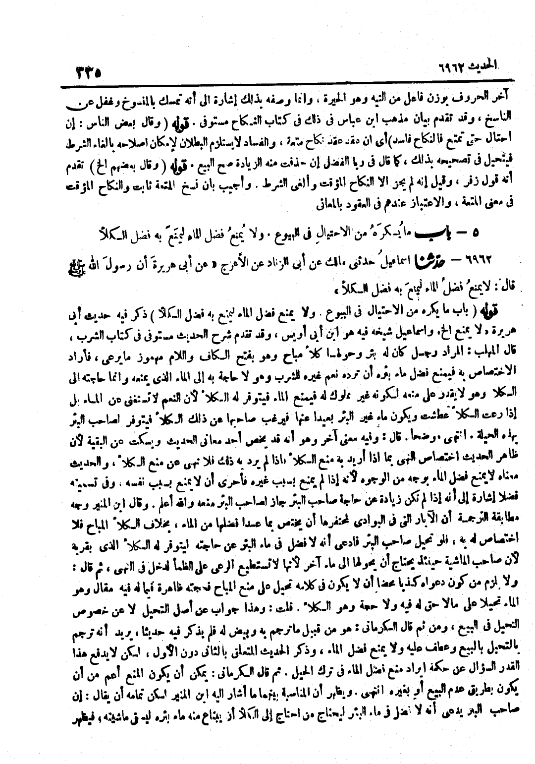 ذَكَرَ فِيهِ حَدِيثَ أَبِي هُرَيْرَةَ لَا يُمْنَعُ إِلَخْ وَإِسْمَاعِيلُ شَيْخُهُ فِيهِ هُوَ بن أَبِي أُوَيْسٍ وَقَدْ تَقَدَّمَ شَرْحُ الْحَدِيثِ مُسْتَوْفًى فِي كِتَابِ الشُّرْبِ قَالَ الْمُهَلَّبُ الْمُرَادُ رَجُلٌ كَانَ لَهُ بِئْرٌ وَحَوْلَهَا كَلَأٌ مُبَاحٌ وَهُوَ بِفَتْحِ الْكَافِ وَاللَّامِ مَهْمُوزٌ مَا يُرْعَى فَأَرَادَ الِاخْتِصَاصَ بِهِ فَيَمْنَعُ فَضْلَ مَاءِ بِئْرِهِ أَنْ تَرِدَهُ نَعَمُ غَيْرِهِ لِلشُّرْبِ وَهُوَ لَا حَاجَةَ بِهِ إِلَى الْمَاءِ الَّذِي يَمْنَعُهُ وَإِنَّمَا حَاجَتُهُ إِلَى الْكَلَإِ وَهُوَ لَا يَقْدِرُ عَلَى مَنْعِهِ لِكَوْنِهِ غَيْرَ مَمْلُوكٍ لَهُ فَيَمْنَعُ الْمَاءَ فَيَتَوَفَّرُ لَهُ الْكَلَأُ لِأَنَّ النَّعَمَ لَا تَسْتَغْنِي عَنِ الْمَاءِ بَلْ إِذَا رَعَتِ الْكَلَأَ عَطِشَتْ وَيَكُونُ مَاءُ غَيْرِ الْبِئْرِ بَعِيدًا عَنْهَا فَيَرْغَبُ صَاحِبُهَا عَنْ ذَلِكَ الْكَلَإِ فَيَتَوَفَّرُ لِصَاحِبِ الْبِئْرِ بِهَذِهِ الْحِيلَةِ انْتَهَى مُوَضَّحًا قَالَ وَفِيهِ مَعْنًى آخَرَ وَهُوَ أَنَّهُ قَدْ يَخُصُّ أَحَدَ مَعَانِي الْحَدِيثِ وَيَسْكُتُ عَنِ الْبَقِيَّةِ لِأَنَّ ظَاهِرَ الْحَدِيثِ اخْتِصَاصُ النَّهْيِ بِمَا إِذَا أُرِيدَ بِهِ مَنْعُ الْكَلَإِ فَإِذَا لَمْ يُرِدْ بِهِ ذَلِكَ فَلَا نَهْيَ عَنْ مَنْعِ الْكَلَإِ وَالْحَدِيثُ مَعْنَاهُ لَا يُمْنَعُ فَضْلُ الْمَاءِ بِوَجْهٍ مِنَ الْوُجُوهِ لِأَنَّهُ إِذَا لَمْ يُمْنَعْ بِسَبَبِ غَيْرِهِ فَأَحْرَى أَنْ لَا يُمْنَعَ بِسَبَبِ نَفْسِهِ وَفِي تَسْمِيَتِهِ فَضْلًا إِشَارَةٌ إِلَى أَنَّهُ إِذَا لَمْ تَكُنْ زِيَادَةً عَنْ حَاجَةِ صَاحِبِ الْبِئْرِ جَازَ لِصَاحِبِ الْبِئْرِ مَنْعُهُ وَالله أعلم وَقَالَ بن الْمُنِيرِ وَجْهُ مُطَابَقَةِ التَّرْجَمَةِ أَنَّ الْآبَارَ الَّتِي فِي الْبَوَادِي لِمُحْتَفِرِهَا أَنْ يَخْتَصَّ بِمَا عَدَا فَضْلَهَا مِنَ الْمَاءِ بِخِلَافِ الْكَلَإِ الْمُبَاحِ فَلَا اخْتِصَاصَ لَهُ بِهِ فَلَوْ تَحَيَّلَ صَاحِبُ الْبِئْرِ فَادَّعَى أَنَّهُ لَا فَضْلَ فِي مَاءِ الْبِئْرِ عَنْ حَاجَتِهِ لِيَتَوَفَّرَ لَهُ الْكَلَأُ الَّذِي بِقُرْبِهِ لِأَنَّ صَاحِبَ الْمَاشِيَةِ حِينَئِذٍ يَحْتَاجُ أَنْ يُحَوِّلَهَا إِلَى مَاءٍ آخَرَ لِأَنَّهَا لَا تَسْتَطِيعُ الرَّعْيَ عَلَى الظَّمَإِ لَدَخَلَ فِي النَّهْيِ ثُمَّ قَالَ وَلَا يَلْزَمُ مِنْ كَوْنِ دَعْوَاهُ كَذِبًا مَحْضًا أَنْ لَا يَكُونَ فِي كَلَامِهِ تَحَيُّلٌ عَلَى مَنْعِ الْمُبَاحِ فَحُجَّتُهُ ظَاهِرَةٌ فِيمَا لَهُ فِيهِ مَقَالٌ وَهُوَ الْمَاءُ تَحَيُّلًا عَلَى مَا لَا حَقَّ لَهُ فِيهِ وَلَا حُجَّةَ وَهُوَ الْكَلَأُ قُلْتُ وَهَذَا جَوَابٌ عَنْ أَصْلِ التَّحَيُّلِ لَا عَنْ خُصُوصِ التَّحَيُّلِ فِي الْبَيْعِ وَمِنْ ثَمَّ قَالَ الْكِرْمَانِيُّ هُوَ مِنْ قَبِيلِ مَا تَرْجَمَ بِهِ وَبَيَّضَ لَهُ فَلَمْ يَذْكُرْ فِيهِ حَدِيثًا يُرِيدُ أَنَّهُ تَرْجَمَ بِالتَّحَيُّلِ بِالْبَيْعِ وَعَطَفَ عَلَيْهِ وَلَا يُمْنَعُ فَضْلُ الْمَاءِ وَذَكَرَ الْحَدِيثَ الْمُتَعَلِّقَ بِالثَّانِي دُونَ الْأَوَّلِ لَكِنْ لَا يَدْفَعُ هَذَا الْقَدْرُ السُّؤَالَ عَنْ حِكْمَةِ إِيرَادِ مَنْعِ فَضْلِ الْمَاءِ فِي تَرْكِ الْحِيَلِ ثُمَّ قَالَ الْكِرْمَانِيُّ يُمْكِنُ أَنْ يَكُونَ الْمَنْعُ أَعَمَّ مِنْ أَنْ يَكُونَ بِطَرِيقِ عَدَمِ الْبَيْعِ أَوْ بِغَيْرِهِ انْتَهَى وَيَظْهَرُ أَنَّ الْمُنَاسَبَةَ بَيْنَهُمَا مَا أَشَارَ إِلَيْهِ بن الْمُنِيرِ لَكِنَّ تَمَامَهُ أَنْ يُقَالَ إِنَّ صَاحِبَ الْبِئْر يَدعِي أَنه لافضل فِي مَاءِ الْبِئْرِ لِيَحْتَاجَ مَنِ احْتَاجَ إِلَى الْكَلَإِ أَنْ يَبْتَاعَ مِنْهُ مَاءَ بِئْرِهِ لِيَسْقِيَ مَاشِيَته فَيظْهر