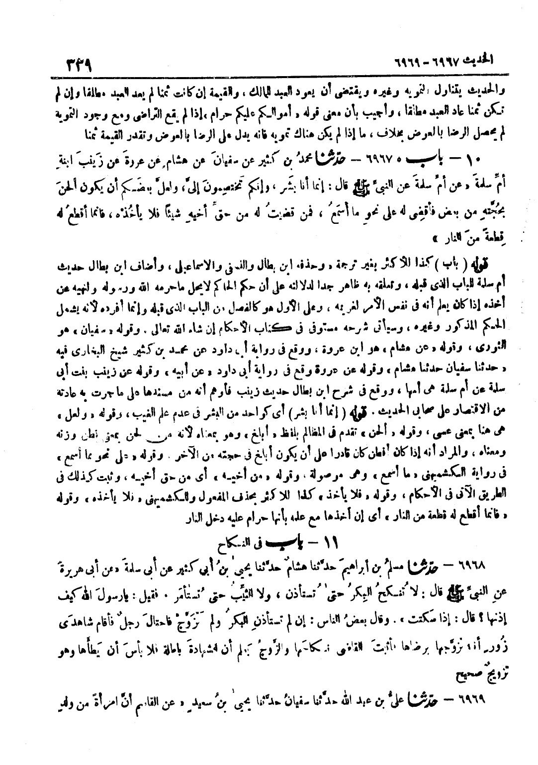 [6967] سُفْيَانُ هُوَ الثَّوْرِيُّ وَقَوْلُهُ عَن هِشَام هُوَ بن عُرْوَةَ وَوَقَعَ فِي رِوَايَةِ أَبِي دَاوُدَ عَنْ مُحَمَّدِ بْنِ كَثِيرٍ شَيْخِ الْبُخَارِيِّ فِيهِ حَدَّثَنَا سُفْيَانُ حَدَّثَنَا هِشَامٌ وَقَوْلُهُ عَنْ عُرْوَةَ وَقَعَ فِي رِوَايَةِ أَبِي دَاوُدَ عَنْ أَبِيهِ وَقَوْلُهُ عَنْ زَيْنَبَ بِنْتِ أَبِي سَلَمَةَ عَنْ أُمِّ سَلمَة هِيَ أمهَا وَوَقع فِي شرح بن بَطَّالٍ حَدِيثُ زَيْنَبَ فَأَوْهَمَ أَنَّهُ مِنْ مُسْنَدِهَا عَلَى مَا جَرَتْ بِهِ عَادَتُهُ مِنَ الِاقْتِصَارِ على صَحَابِيّ الحَدِيث قَوْله إِنَّمَا أَنَا بَشَرٌ أَيْ كَوَاحِدٍ مِنَ الْبَشَرِ فِي عَدَمِ عِلْمِ الْغَيْبِ وَقَوْلُهُ وَلَعَلَّ هِيَ هُنَا بِمَعْنَى عَسَى وَقَوْلُهُ أَلْحَنَ تَقَدَّمَ فِي الْمَظَالِمِ بِلَفْظِ أَبْلَغَ وَهُوَ بِمَعْنَاهُ لِأَنَّهُ مِنْ لَحِنَ بِمَعْنَى فَطِنَ وَزْنُهُ وَمَعْنَاهُ وَالْمُرَادُ أَنَّهُ إِذَا كَانَ أَفْطَنَ كَانَ قَادِرًا عَلَى أَنْ يَكُونَ أَبْلَغَ فِي حُجَّتِهِ مِنَ الْآخَرِ وَقَوْلُهُ على نَحْو مِمَّا أَسْمَعُ فِي رِوَايَةِ الْكُشْمِيهَنِيِّ مَا أَسْمَعُ وَهِيَ مَوْصُولَةٌ وَقَوْلُهُ مِنْ أَخِيهِ أَيْ مِنْ حَقِّ أَخِيهِ وَثَبَتَ كَذَلِكَ فِي الطَّرِيقِ الْآتِي فِي الْأَحْكَامِ وَقَوْلُهُ فَلَا يَأْخُذْ كَذَا لِلْأَكْثَرِ بِحَذْفِ الْمَفْعُولِ وَلِلْكُشْمِيهَنِيِّ فَلَا يَأْخُذْهُ وَقَوْلُهُ فَإِنَّمَا أَقْطَعُ لَهُ قِطْعَةً مِنَ النَّارِ أَيْ إِنْ أَخَذَهَا مَعَ عِلْمِهِ بِأَنَّهَا حَرَامٌ عَلَيْهِ دَخَلَ النَّارَ