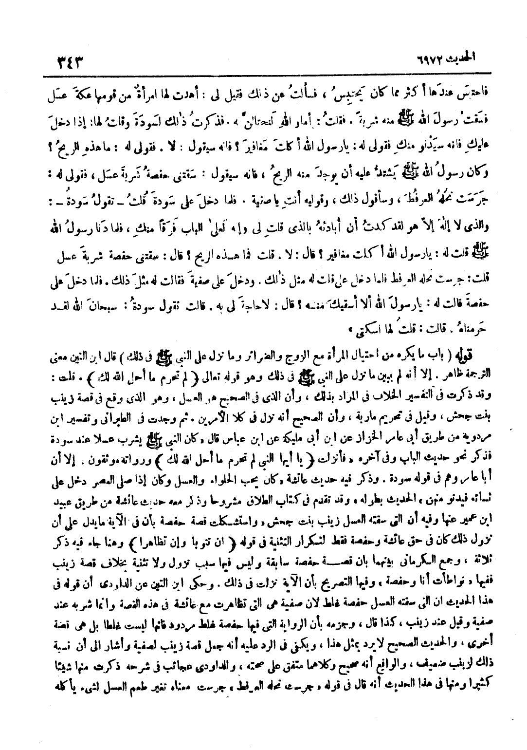 [6972] كَانَ يُحِبُّ الْحَلْوَاءَ وَالْعَسَلَ وَكَانَ إِذَا صَلَّى الْعَصْرَ دَخَلَ عَلَى نِسَائِهِ فَيَدْنُو مِنْهُنَّ الْحَدِيثَ بِطُولِهِ وَقَدْ تَقَدَّمَ فِي كِتَابِ الطَّلَاق مشروحا وَذكر مَعَه حَدِيث عَائِشَة من طَرِيقُ عُبَيْدِ بْنِ عُمَيْرٍ عَنْهَا وَفِيهِ أَنَّ الَّتِي سَقَتْهُ الْعَسَلَ زَيْنَبُ بِنْتُ جَحْشٍ وَاسْتُشْكِلَتْ قِصَّةُ حَفْصَةَ بِأَنَّ فِي الْآيَةِ مَا يَدُلُّ عَلَى أَنَّ نُزُولَ ذَلِكَ كَانَ فِي حَقِّ عَائِشَةَ وَحَفْصَةَ فَقَطْ لِتَكْرَارِ التَّثْنِيَةِ فِي قَوْلِهِ أَن تَتُوبَا وَإِن تظاهرا وَهُنَا جَاءَ فِيهِ ذِكْرُ ثَلَاثَةٍ وَجَمَعَ الْكِرْمَانِيُّ بَيْنَهُمَا بِأَنَّ قِصَّةَ حَفْصَةَ سَابِقَةٌ وَلَيْسَ فِيهَا سَبَبُ نُزُولٍ وَلَا تَثْنِيَةٌ بِخِلَافِ قِصَّةِ زَيْنَبَ فَفِيهَا تَوَاطَأْتُ أَنَا وَحَفْصَةُ وَفِيهَا التَّصْرِيحُ بِأَنَّ الْآيَة نزلت فِي ذَلِك وَحكى بن التِّينِ عَنِ الدَّاوُدِيِّ أَنَّ قَوْلَهُ فِي هَذَا الْحَدِيثِ إِنَّ الَّتِي سَقَتْهُ الْعَسَلَ حَفْصَةُ غَلَطٌ لِأَنَّ صَفِيَّةَ هِيَ الَّتِي تَظَاهَرَتْ مَعَ عَائِشَةَ فِي هَذِهِ الْقِصَّةِ وَإِنَّمَا شَرِبَهُ عِنْدَ صَفِيَّةَ وَقِيلَ عِنْدَ زَيْنَبَ كَذَا قَالَ وَجَزْمُهُ بِأَنَّ الرِّوَايَةَ الَّتِي فِيهَا حَفْصَةُ غَلَطٌ مَرْدُودٌ فَإِنَّهَا لَيْسَتْ غَلَطًا بَلْ هِيَ قِصَّةٌ أُخْرَى وَالْحَدِيثُ الصَّحِيحُ لَا يُرَدُّ بِمِثْلِ هَذَا وَيَكْفِي فِي الرَّدِّ عَلَيْهِ أَنَّهُ جَعَلَ قِصَّةَ زَيْنَبَ لِصَفِيَّةَ وَأَشَارَ إِلَى أَنَّ نِسْبَةَ ذَلِكَ لِزَيْنَبَ ضَعِيفٌ وَالْوَاقِعُ أَنَّهُ صَحِيحٌ وَكِلَاهُمَا مُتَّفَقٌ عَلَى صِحَّتِهِ وَلِلدَّاوُدِيِّ عَجَائِبُ فِي شَرْحِهِ ذَكَرْتُ مِنْهَا شَيْئًا كَثِيرًا وَمِنْهَا فِي هَذَا الْحَدِيثِ أَنَّهُ قَالَ فِي قَوْلِهِ جَرَسَتْ نَحْلُهُ الْعُرْفُطَ جَرَسَتْ مَعْنَاهُ تَغَيَّرَ طَعْمُ الْعَسَلِ لِشَيْءٍ يَأْكُلُهُ