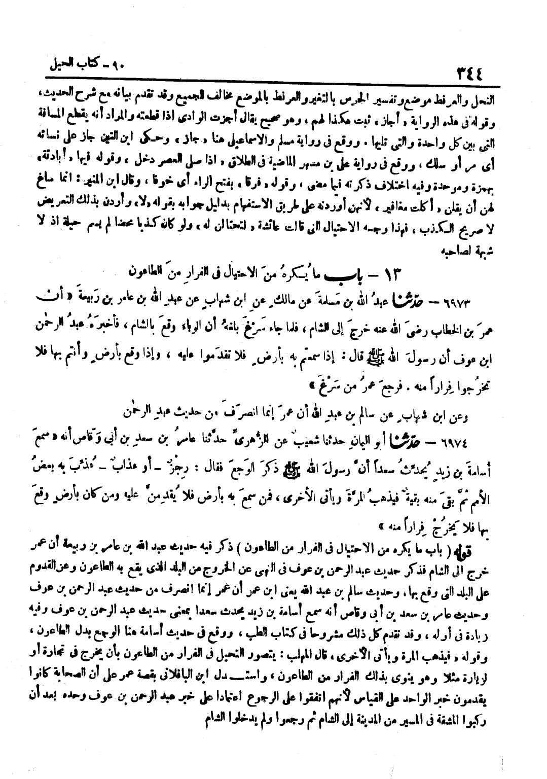 ذَكَرَ فِيهِ حَدِيثَ عَبْدِ اللَّهِ بْنِ عَامِرِ بْنِ رَبِيعَةَ أَنَّ عُمَرَ خَرَجَ إِلَى الشَّامِ فَذَكَرَ حَدِيثَ عَبْدِ الرَّحْمَنِ بْنِ عَوْفٍ فِي النَّهْيِ عَنِ الْخُرُوجِ مِنَ الْبَلَدِ الَّذِي يَقَعُ بِهِ الطَّاعُونُ وَعَنِ الْقُدُومِ عَلَى الْبَلَدِ الَّتِي وَقَعَ بِهَا وَحَدِيثُ سَالِمِ بن عبد الله يَعْنِي بن عُمَرَ أَنَّ عُمَرَ إِنَّمَا انْصَرَفَ مِنْ حَدِيثِ عَبْدِ الرَّحْمَنِ بْنِ عَوْفٍ وَحَدِيثِ عَامِرِ بْنِ سَعْدِ بْنِ أَبِي وَقَّاصٍ أَنَّهُ سَمِعَ أُسَامَةَ بْنَ زَيْدٍ يُحَدِّثُ سَعْدًا بِمَعْنَى حَدِيثِ عَبْدِ الرَّحْمَنِ بْنِ عَوْفٍ وَفِيهِ زِيَادَةٌ فِي أَوَّلِهِ وَقَدْ تَقَدَّمَ كُلُّ ذَلِكَ مَشْرُوحًا فِي كِتَابِ الطِّبِّ وَوَقَعَ فِي حَدِيثِ أُسَامَةَ هُنَا الْوَجَعُ بَدَلَ الطَّاعُونِ وَقَوْلُهُ