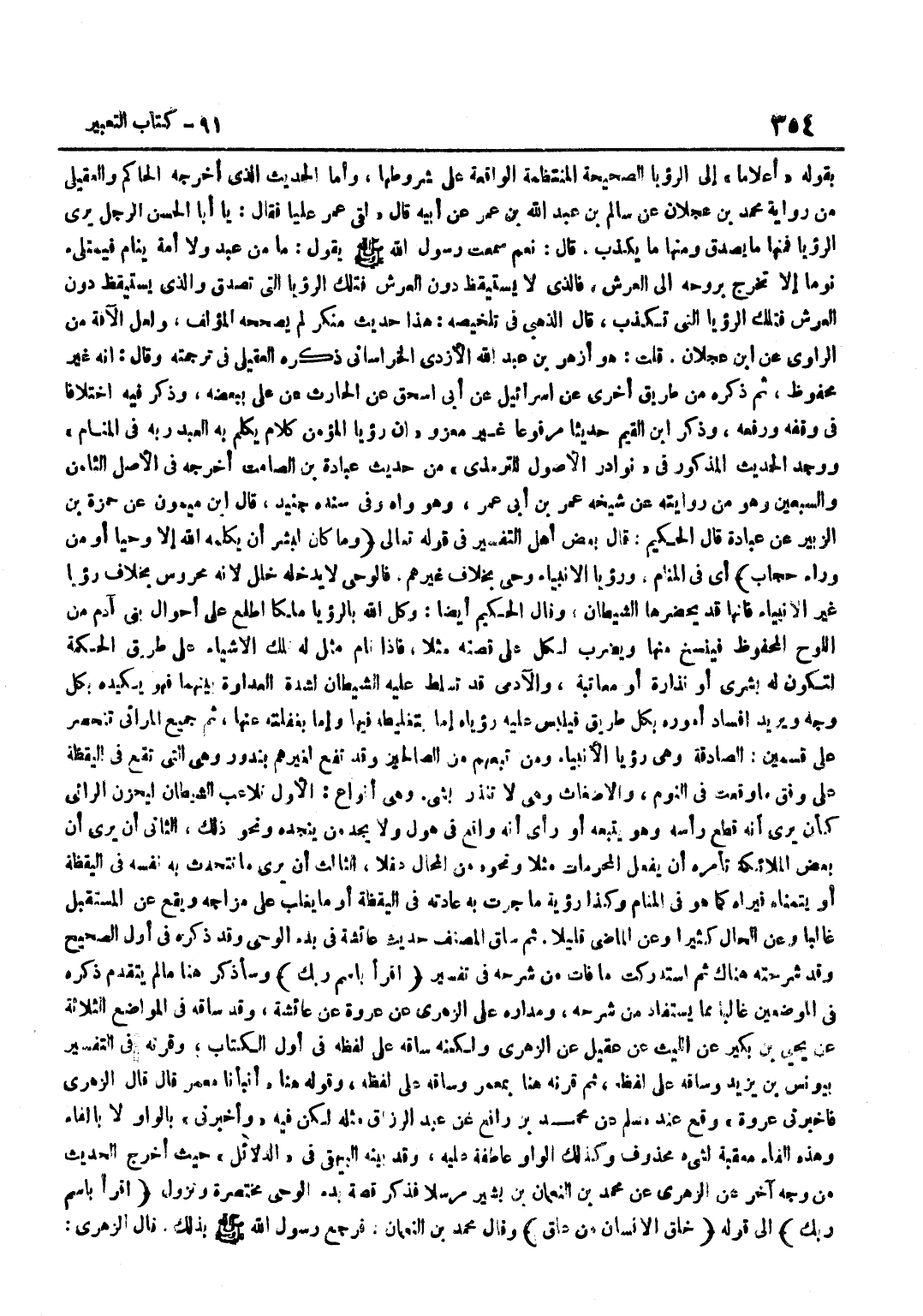 بِقَوْلِهِ أَعْلَامًا إِلَى الرُّؤْيَا الصَّحِيحَةِ الْمُنْتَظِمَةِ الْوَاقِعَةِ عَلَى شُرُوطِهَا وَأَمَّا الْحَدِيثُ الَّذِي أَخْرَجَهُ الْحَاكِمُ وَالْعُقَيْلِيُّ مِنْ رِوَايَةِ مُحَمَّدِ بْنِ عَجْلَانَ عَنْ سَالِمِ بْنِ عَبْدِ اللَّهِ بْنِ عُمَرَ عَنْ أَبِيهِ قَالَ لَقِيَ عُمَرُ عَلِيًّا فَقَالَ يَا أَبَا الْحَسَنِ الرَّجُلُ يَرَى الرُّؤْيَا فَمِنْهَا مَا يَصْدُقُ وَمِنْهَا مَا يَكْذِبُ قَالَ نَعَمْ سَمِعْتُ رَسُولَ اللَّهِ صَلَّى اللَّهُ عَلَيْهِ وَسَلَّمَ يَقُول مَا مِنْ عَبْدٍ وَلَا أَمَةٍ يَنَامُ فَيَمْتَلِئُ نَوْمًا إِلَّا تَخْرُجُ بِرُوحِهِ إِلَى الْعَرْشِ فَالَّذِي لَا يَسْتَيْقِظُ دُونَ الْعَرْشِ فَتِلْكَ الرُّؤْيَا الَّتِي تَصْدُقُ وَالَّذِي يَسْتَيْقِظُ دُونَ الْعَرْشِ فَتِلْكَ الرُّؤْيَا الَّتِي تَكْذِبُ قَالَ الذَّهَبِيُّ فِي تَلْخِيصِهِ هَذَا حَدِيثٌ مُنْكَرٌ لَمْ يُصَحِّحْهُ الْمُؤَلِّفُ وَلَعَلَّ الْآفَةَ من الرَّاوِي عَن بن عَجْلَانَ قُلْتُ هُوَ أَزْهَرُ بْنُ عَبْدِ اللَّهِ الْأَزْدِيّ الخرساني ذَكَرَهُ الْعُقَيْلِيُّ فِي تَرْجَمَتِهِ وَقَالَ إِنَّهُ غَيْرُ مَحْفُوظٍ ثُمَّ ذَكَرَهُ مِنْ طَرِيقٍ أُخْرَى عَنْ إِسْرَائِيلَ عَنْ أَبِي إِسْحَاقَ عَنِ الْحَارِثِ عَنْ عَلِيٍّ بِبَعْضِهِ وَذَكَرَ فِيهِ اخْتِلَافًا فِي وَقْفِهِ وَرَفعه وَذكر بن الْقَيِّمِ حَدِيثًا مَرْفُوعًا غَيْرَ مَعْزُوٍّ إِنَّ رُؤْيَا الْمُؤْمِنِ كَلَامٌ يُكَلِّمُ بِهِ الْعَبْدَ رَبُّهُ فِي الْمَنَامِ وَوُجِدَ الْحَدِيثُ الْمَذْكُورُ فِي نَوَادِرِ الْأُصُولِ لِلتِّرْمِذِيِّ مِنْ حَدِيثِ عُبَادَةَ بْنِ الصَّامِتِ أَخْرَجَهُ فِي الْأَصْلِ الثَّامِنِ وَالسَّبْعِينَ وَهُوَ مِنْ رِوَايَتِهِ عَنْ شَيْخِهِ عُمَرَ بْنِ أَبِي عُمَرَ وَهُوَ واه وَفِي سَنَده جُنَيْد قَالَ بن مَيْمُونٍ عَنْ حَمْزَةَ بْنِ الزُّبَيْرِ عَنْ عُبَادَةَ قَالَ الْحَكِيمُ قَالَ بَعْضُ أَهْلِ التَّفْسِيرِ فِي قَوْلِهِ تَعَالَى وَمَا كَانَ لِبَشَرٍ أَنْ يُكَلِّمَهُ اللَّهُ إِلَّا وَحْيًا أَوْ مِنْ وَرَاءِ حِجَابٍ أَيْ فِي الْمَنَامِ وَرُؤْيَا الْأَنْبِيَاءِ وَحْيٌ بِخِلَافِ غَيْرِهِمْ فَالْوَحْيُ لَا يَدْخُلُهُ خَلَلٌ لِأَنَّهُ مَحْرُوسٌ بِخِلَافِ رُؤْيَا غَيْرِ الْأَنْبِيَاءِ فَإِنَّهَا قَدْ يَحْضُرُهَا الشَّيْطَانُ وَقَالَ الْحَكِيمُ أَيْضًا وَكَّلَ اللَّهُ بِالرُّؤْيَا ملكا اطلع على أَحْوَال بني آدم مِنَ اللَّوْحِ الْمَحْفُوظِ فَيَنْسَخُ مِنْهَا وَيَضْرِبُ لِكُلٍّ عَلَى قِصَّتِهِ مَثَلًا فَإِذَا نَامَ مَثَّلَ لَهُ تِلْكَ الْأَشْيَاءَ عَلَى طَرِيقِ الْحِكْمَةِ لِتَكُونَ لَهُ بُشْرَى أَوْ نِذَارَةً أَوْ مُعَاتَبَةً وَالْآدَمِيُّ قَدْ تَسَلَّطَ عَلَيْهِ الشَّيْطَانُ لِشِدَّةِ الْعَدَاوَةِ بَيْنَهُمَا فَهُوَ يَكِيدُهُ بِكُلِّ وَجْهٍ وَيُرِيدُ إِفْسَادَ أُمُورِهِ بِكُلِّ طَرِيقٍ فَيَلْبِسُ عَلَيْهِ رُؤْيَاهُ إِمَّا بِتَغْلِيطِهِ فِيهَا وَإِمَّا بِغَفْلَتِهِ عَنْهَا ثُمَّ جَمِيعُ الْمَرَائِي تَنْحَصِرُ عَلَى قِسْمَيْنِ الصَّادِقَةِ وَهِيَ رُؤْيَا الْأَنْبِيَاءِ وَمَنْ تَبِعَهُمْ مِنَ الصَّالِحِينَ وَقَدْ تَقَعُ لِغَيْرِهِمْ بِنُدُورٍ وَهِيَ الَّتِي تَقَعُ فِي الْيَقَظَةِ عَلَى وَفْقِ مَا وَقَعَتْ فِي النَّوْمِ وَالْأَضْغَاثِ وَهِيَ لَا تُنْذِرُ بِشَيْءٍ وَهِيَ أَنْوَاعٌ الْأَوَّلُ تَلَاعُبُ الشَّيْطَانِ لِيُحْزِنَ الرَّائِيَ كَأَنْ يَرَى أَنَّهُ قَطَعَ رَأْسَهُ وَهُوَ يَتْبَعُهُ أَوْ رَأَى أَنَّهُ وَاقِعٌ فِي هَوْلٍ وَلَا يَجِدُ مَنْ يُنْجِدُهُ وَنَحْوَ ذَلِكَ الثَّانِي أَنْ يَرَى أَنَّ بَعْضَ الْمَلَائِكَةِ تَأْمُرُهُ أَنْ يَفْعَلَ الْمُحَرَّمَاتِ مَثَلًا وَنَحْوَهُ مِنَ الْمُحَالِ عَقْلًا ا