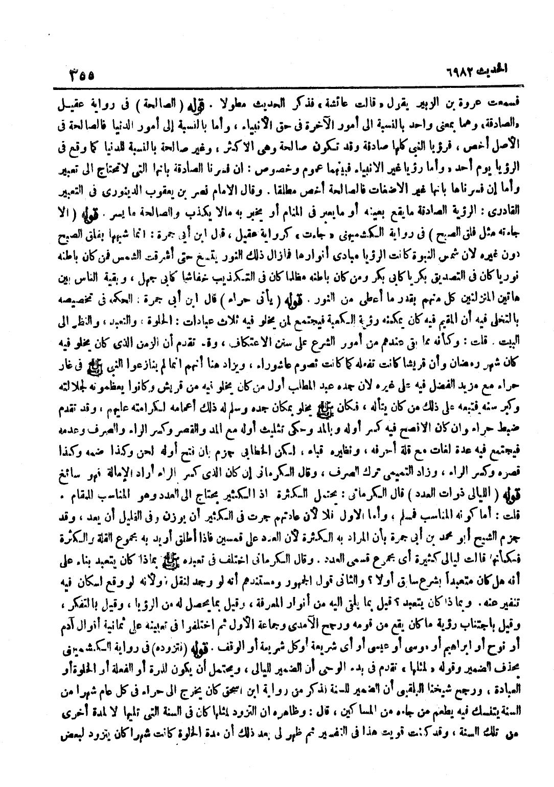 فَسَمِعْتُ عُرْوَةَ بْنَ الزُّبَيْرِ يَقُولُ قَالَتْ عَائِشَةُ فَذَكَرَ الْحَدِيثَ مُطَوَّلًا قَوْلُهُ الصَّالِحَةُ فِي رِوَايَةِ عُقَيْلٍ الصَّادِقَةُ وَهُمَا بِمَعْنًى وَاحِدٍ بِالنِّسْبَةِ إِلَى أُمُورِ الْآخِرَةِ فِي حَقِّ الْأَنْبِيَاءِ وَأَمَّا بِالنِّسْبَةِ إِلَى أُمُورِ الدُّنْيَا فَالصَّالِحَةُ فِي الْأَصْلِ أَخَصُّ فَرُؤْيَا النَّبِيِّ كُلُّهَا صَادِقَةٌ وَقَدْ تَكُونُ صَالِحَةً وَهِيَ الْأَكْثَرُ وَغَيْرَ صَالِحَةٍ بِالنِّسْبَةِ لِلدُّنْيَا كَمَا وَقَعَ فِي الرُّؤْيَا يَوْمَ أُحُدٍ وَأَمَّا رُؤْيَا غَيْرِ الْأَنْبِيَاءِ فَبَيْنَهُمَا عُمُومٌ وَخُصُوصٌ إِنْ فَسَّرْنَا الصَّادِقَةَ بِأَنَّهَا الَّتِي لَا تَحْتَاجُ إِلَى تَعْبِيرٍ وَأَمَّا إِنْ فَسَّرْنَاهَا بِأَنَّهَا غَيْرُ الْأَضْغَاثِ فَالصَّالِحَةُ أَخَصُّ مُطْلَقًا وَقَالَ الْإِمَامُ نَصْرُ بْنُ يَعْقُوبَ الدَّيْنَوَرِيُّ فِي التَّعْبِيرِ الْقَادِرِيِّ الرُّؤْيَةُ الصَّادِقَةُ مَا يَقَعُ بِعَيْنِهِ أَوْ مَا يُعَبَّرُ فِي الْمَنَامِ أَوْ يُخْبَرُ بِهِ مَا لَا يَكْذِبُ وَالصَّالِحَةُ مَا يَسُرُّ قَوْلُهُ إِلَّا جَاءَتْهُ مِثْلَ فَلَقِ الصُّبْحِ فِي رِوَايَةِ الْكُشْمِيهَنِيِّ جَاءَتْ كَرِوَايَةِ عُقَيْلٍ قَالَ بن أبي جَمْرَة إِنَّمَا شَبَّهَهَا بِفَلَقِ الصُّبْحِ دُونَ غَيْرِهِ لِأَنَّ شَمْسَ النُّبُوَّةِ كَانَتِ الرُّؤْيَا مَبَادِيَ أَنْوَارِهَا فَمَا زَالَ ذَلِكَ النُّورُ يَتَّسِعُ حَتَّى أَشْرَقَتِ الشَّمْسُ فَمَنْ كَانَ بَاطِنُهُ نُورِيًّا كَانَ فِي التَّصْدِيقِ بَكْرِيًّا كَأَبِي بَكْرٍ وَمَنْ كَانَ بَاطِنُهُ مُظْلِمًا كَانَ فِي التَّكْذِيبِ خُفَّاشًا كَأَبِي جَهْلٍ وَبَقِيَّةُ النَّاسِ بَيْنَ هَاتَيْنِ الْمَنْزِلَتَيْنِ كُلٌّ مِنْهُمْ بِقَدْرِ مَا أُعْطِيَ مِنَ النُّورِ قَوْلُهُ يَأْتِي حِرَاءً قَالَ بن أبي جَمْرَة الْحِكْمَةُ فِي تَخْصِيصِهِ بِالتَّخَلِّي فِيهِ أَنَّ الْمُقِيمَ فِيهِ كَانَ يُمْكِنُهُ رُؤْيَةَ الْكَعْبَةِ فَيَجْتَمِعُ لِمَنْ يَخْلُو فِيهِ ثَلَاثُ عِبَادَاتٍ الْخَلْوَةُ وَالتَّعَبُّدُ وَالنَّظَرُ إِلَى الْبَيْتِ قُلْتُ وَكَأَنَّهُ مِمَّا بَقِيَ عِنْدَهُمْ مِنْ أُمُورِ الشَّرْعِ عَلَى سُنَنِ الِاعْتِكَافِ وَقَدْ تَقَدَّمَ أَنَّ الزَّمَنَ الَّذِي كَانَ يَخْلُو فِيهِ كَانَ شَهْرَ رَمَضَانَ وَأَنَّ قُرَيْشًا كَانَتْ تَفْعَلُهُ كَمَا كَانَتْ تَصُومُ عَاشُورَاءَ وَيُزَادُ هُنَا أَنَّهُمْ إِنَّمَا لَمْ يُنَازِعُوا النَّبِيِّ صَلَّى اللَّهُ عَلَيْهِ وَسَلَّمَ فِي غَارٍ حِرَاءٍ مَعَ مَزِيدِ الْفَضْلِ فِيهِ عَلَى غَيْرِهِ لِأَنَّ جَدَّهُ عَبْدَ الْمُطَّلِبِ أَوَّلُ مَنْ كَانَ يَخْلُو فِيهِ مِنْ قُرَيْشٍ وَكَانُوا يُعَظِّمُونَهُ لِجَلَالَتِهِ وَكِبَرِ سِنِّهِ فَتَبِعَهُ عَلَى ذَلِكَ مَنْ كَانَ يَتَأَلَّهُ فَكَانَ صَلَّى اللَّهُ عَلَيْهِ وَسَلَّمَ يَخْلُو بِمَكَانِ جَدِّهِ وَسَلَّمَ لَهُ ذَلِكَ أَعْمَامُهُ لِكَرَامَتِهِ عَلَيْهِمْ وَقَدْ تَقَدَّمَ ضَبْطُ حِرَاءٍ وَإِنْ كَانَ الْأَفْصَحُ فِيهِ كَسْرُ أَوَّلِهِ وَبِالْمَدِّ وَحُكِيَ تَثْلِيثُ أَوَّلِهِ مَعَ الْمَدِّ وَالْقَصْرِ وَكَسْرِ الرَّاءِ وَالصَّرْفِ وَعَدَمِهِ فَيَجْتَمِعُ فِيهِ عِدَّةُ لُغَاتٍ مَعَ قِلَّةِ أَحْرُفِهِ وَنَظِيرُهُ قَبَاءَ لَكِنَّ الْخَطَّابِيَّ جَزَمَ بِأَنَّ فَتْحَ أَوَّلِهِ لَحْنٌ وَكَذَا ضمه وَكَذَا قصره وَكَسْرُ الرَّاءِ وَزَادَ التَّمِيمِيُّ تَرْكَ الصَّرْفِ وَقَالَ الْكِرْمَانِيُّ إِنْ كَانَ الَّذِي كَسَرَ الرَّاءَ أَرَادَ الْإِمَالَةَ فَهُوَ سَائِغٌ قَوْلُهُ اللَّيَالِيَ ذَوَاتَ الْعَدَدِ قَالَ الْكِرْمَانِيُّ يَحْتَمِلُ الْكَثْرَةُ إِذِ الْكَثِيرُ يَحْتَاجُ إِلَى الْعَدَدِ