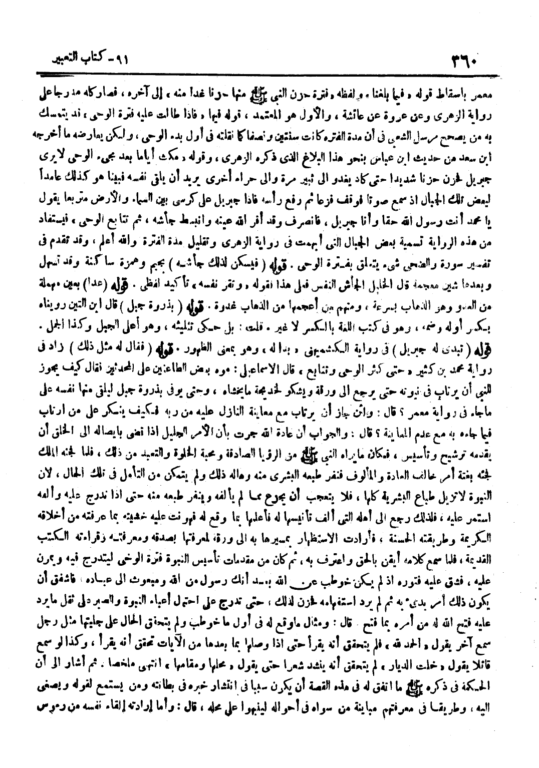 مَعْمَرٍ بِإِسْقَاطِ قَوْلِهِ فِيمَا بَلَغَنَا وَلَفْظُهُ فَتْرَةً حَزِنَ النَّبِيُّ صَلَّى اللَّهُ عَلَيْهِ وَسَلَّمَ مِنْهَا حُزْنًا غَدَا مِنْهُ إِلَى آخِرِهِ فَصَارَ كُلُّهُ مدرجا على رِوَايَة الزُّهْرِيّ وَعَن عُرْوَةَ عَنْ عَائِشَةَ وَالْأَوَّلُ هُوَ الْمُعْتَمَدُ قَوْلُهُ فِيهَا فَإِذَا طَالَتْ عَلَيْهِ فَتْرَةُ الْوَحْيِ قَدْ يَتَمَسَّكُ بِهِ مَنْ يُصَحِّحُ مُرْسَلَ الشَّعْبِيِّ فِي أَنَّ مُدَّةَ الْفَتْرَةِ كَانَتْ سَنَتَيْنِ وَنِصْفًا كَمَا نَقَلْتُهُ فِي أَوَّلِ بَدْءِ الْوَحْيِ وَلَكِنْ يُعَارِضُهُ مَا أخرجه بن سعد من حَدِيث بن عَبَّاسٍ بِنَحْوِ هَذَا الْبَلَاغِ الَّذِي ذَكَرَهُ الزُّهْرِيُّ وَقَوْلُهُ مَكَثَ أَيَّامًا بَعْدَ مَجِيءِ الْوَحْيِ لَا يَرَى جِبْرِيلَ فَحَزِنَ حُزْنًا شَدِيدًا حَتَّى كَادَ يَغْدُو إِلَى ثَبِيرٍ مَرَّةً وَإِلَى حِرَاءٍ أُخْرَى يُرِيدُ أَنْ يُلْقِيَ نَفْسَهُ فَبَيْنَا هُوَ كَذَلِكَ عَامِدًا ليعض تِلْكَ الْجِبَالِ إِذْ سَمِعَ صَوْتًا فَوَقَفَ فَزِعًا ثُمَّ رَفَعَ رَأْسَهُ فَإِذَا جِبْرِيلُ عَلَى كُرْسِيٍّ بَيْنَ السَّمَاءِ وَالْأَرْضِ مُتَرَبِّعًا يَقُولُ يَا مُحَمَّدُ أَنْتَ رَسُولُ اللَّهِ حَقًّا وَأَنَا جِبْرِيلُ فَانْصَرَفَ وَقَدْ أَقَرَّ اللَّهُ عَيْنَهُ وَانْبَسَطَ جَأْشُهُ ثُمَّ تَتَابَعَ الْوَحْيُ فَيُسْتَفَادُ مِنْ هَذِهِ الرِّوَايَةِ تَسْمِيَةُ بَعْضِ الْجِبَالِ الَّتِي أُبْهِمَتْ فِي رِوَايَةِ الزُّهْرِيِّ وَتَقْلِيلُ مُدَّةِ الْفَتْرَةِ وَاللَّهُ أَعْلَمُ وَقَدْ تَقَدَّمَ فِي تَفْسِيرِ سُورَةِ وَالضُّحَى شَيْءٌ يَتَعَلَّقُ بِفَتْرَةِ الْوَحْيِ قَوْلُهُ فَيَسْكُنُ لِذَلِكَ جَأْشُهُ بِجِيمٍ وَهَمْزَةٍ سَاكِنَةٍ وَقَدْ تُسَهَّلُ وَبَعْدَهَا شِينٌ مُعْجَمَةٌ قَالَ الْخَلِيلُ الْجَأْشُ النَّفْسُ فَعَلَى هَذَا فَقَوْلُهُ وَتَقَرُّ نَفْسُهُ تَأْكِيدٌ لَفْظِيٌّ قَوْلُهُ عَدَا بِعَيْنٍ مُهْمَلَةٍ مِنَ الْعَدْوِ وَهُوَ الذَّهَابُ بِسُرْعَةٍ وَمِنْهُمْ مَنْ أَعْجَمَهَا مِنَ الذَّهَابِ غُدْوَةً قَوْلُهُ بِذِرْوَةِ جَبَلٍ قَالَ بن التِّينِ رُوِّينَاهُ بِكَسْرِ أَوَّلِهِ وَضَمِّهِ وَهُوَ فِي كُتُبِ اللُّغَةِ بِالْكَسْرِ لَا غَيْرَ قُلْتُ بَلْ حُكِيَ تَثْلِيثُهُ وَهُوَ أَعْلَى الْجَبَلِ وَكَذَا الْجَمَلُ قَوْلُهُ تَبَدَّى لَهُ جِبْرِيلُ فِي رِوَايَةِ الْكُشْمِيهَنِيِّ بَدَا لَهُ وَهُوَ بِمَعْنَى الظُّهُورِ قَوْلُهُ فَقَالَ لَهُ مِثْلَ ذَلِكَ زَادَ فِي رِوَايَةِ مُحَمَّدِ بْنِ كَثِيرٍ حَتَّى كَثُرَ الْوَحْيُ وَتَتَابَعَ قَالَ الْإِسْمَاعِيلِيُّ مَوَّهَ بَعْضُ الطَّاعِنِينَ عَلَى الْمُحَدِّثِينَ فَقَالَ كَيْفَ يَجُوزُ لِلنَّبِيِّ أَنْ يَرْتَابَ فِي نُبُوَّتِهِ حَتَّى يَرْجِعَ إِلَى وَرَقَةَ وَيَشْكُو لِخَدِيجَةَ مَا يَخْشَاهُ وَحَتَّى يُوفِيَ بِذِرْوَةِ جَبَلٍ لِيُلْقِيَ مِنْهَا نَفْسَهُ عَلَى مَا جَاءَ فِي رِوَايَةِ مَعْمَرٍ قَالَ وَلَئِنْ جَازَ أَنْ يَرْتَابَ مَعَ مُعَايَنَةِ النَّازِلِ عَلَيْهِ مِنْ رَبِّهِ فَكَيْفَ يُنْكَرُ عَلَى مَنِ ارْتَابَ فِيمَا جَاءَهُ بِهِ مَعَ عَدَمِ الْمُعَايَنَةِ قَالَ وَالْجَوَابُ أَنَّ عَادَةَ اللَّهِ جَرَتْ بِأَنَّ الْأَمْرَ الْجَلِيلَ إِذَا قُضِيَ بِإِيصَالِهِ إِلَى الْخَلْقِ أَنْ يَقْدَمَهُ تَرْشِيحٌ وَتَأْسِيسٌ فَكَانَ مَا يَرَاهُ النَّبِيُّ صَلَّى اللَّهُ عَلَيْهِ وَسَلَّمَ مِنَ الرُّؤْيَا الصَّادِقَةِ وَمَحَبَّةِ الْخَلْوَةِ وَالتَّعَبُّدِ مِنْ ذَلِكَ فَلَمَّا فَجِئَهُ الْمَلَكُ فَجِئَهُ بَغْتَةً أَمْرٌ خَالَفَ الْعَادَةَ وَالْمَأْلُوفَ فَنَفَرَ طَبْعُهُ الْبَشَرِيُّ مِنْهُ وَهَالَهُ ذَلِكَ وَلَمْ يَتَمَكَّنْ مِنَ التَّأَمُّلِ فِي تِلْكَ الْحَالِ لِأَنَّ النُ