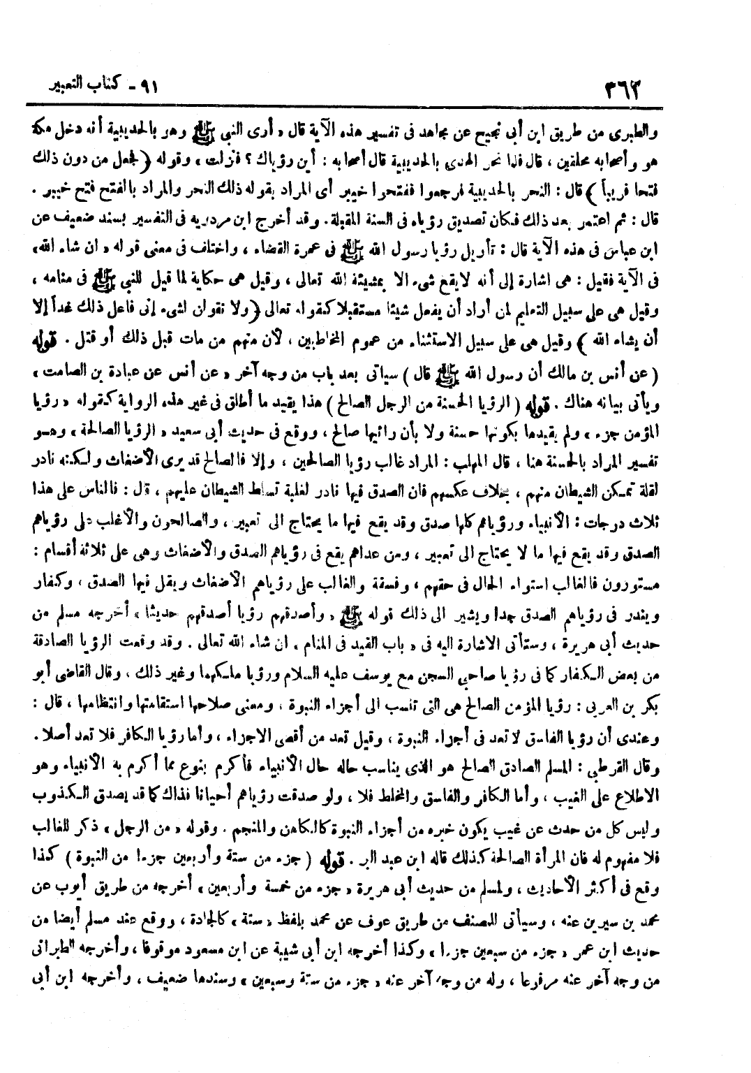 والطبري من طَرِيق بن أَبِي نَجِيحٍ عَنْ مُجَاهِدٍ فِي تَفْسِيرِ هَذِهِ الْآيَةِ قَالَ أَرَى النَّبِيَّ صَلَّى اللَّهُ عَلَيْهِ وَسَلَّمَ وَهُوَ بِالْحُدَيْبِيَةِ أَنَّهُ دَخَلَ مَكَّةَ هُوَ وَأَصْحَابُهُ مُحَلِّقِينَ قَالَ فَلَمَّا نَحَرَ الْهَدْيَ بِالْحُدَيْبِيَةِ قَالَ أَصْحَابُهُ أَيْنَ رُؤْيَاكَ فَنَزَلَتْ وَقَوْلُهُ فَجَعَلَ من دون ذَلِك فتحا قَرِيبا قَالَ النَّحْرُ بِالْحُدَيْبِيَةِ فَرَجَعُوا فَفَتَحُوا خَيْبَرَ أَيِ الْمُرَادُ بِقَوْلِهِ ذَلِكَ النَّحْرُ وَالْمُرَادُ بِالْفَتْحِ فَتْحُ خَيْبَرَ قَالَ ثُمَّ اعْتَمَرَ بَعْدَ ذَلِكَ فَكَانَ تَصْدِيقُ رُؤْيَاهُ فِي السَّنَةِ الْمُقْبِلَةِ وَقَدْ أَخْرَجَ بن مرْدَوَيْه فِي التَّفْسِير بِسَنَد ضَعِيف عَن بن عَبَّاسٍ فِي هَذِهِ الْآيَةِ قَالَ تَأْوِيلُ رُؤْيَا رَسُول الله صلى الله عَلَيْهِ وَسلم فِي عُمْرَةِ الْقَضَاءِ وَاخْتُلِفَ فِي مَعْنَى قَوْلِهِ إِنْ شَاءَ اللَّهُ فِي الْآيَةِ فَقِيلَ هِيَ إِشَارَةٌ إِلَى أَنَّهُ لَا يَقَعُ شَيْءٌ إِلَّا بِمَشِيئَةِ اللَّهِ تَعَالَى وَقِيلَ هِيَ حِكَايَةٌ لِمَا قِيلَ لِلنَّبِيِّ صَلَّى اللَّهُ عَلَيْهِ وَسَلَّمَ فِي مَنَامِهِ وَقِيلَ هِيَ عَلَى سَبِيلِ التَّعْلِيمِ لِمَنْ أَرَادَ أَنْ يَفْعَلَ شَيْئًا مُسْتَقْبَلًا كَقَوْلِهِ تَعَالَى وَلَا تَقُولَنَّ لِشَيْءٍ إِنِّي فَاعِلٌ ذَلِكَ غَدًا إِلَّا أَن يَشَاء الله وَقِيلَ هِيَ عَلَى سَبِيلِ الِاسْتِثْنَاءِ مِنْ عُمُومِ الْمُخَاطَبِينَ لِأَنَّ مِنْهُمْ مَنْ مَاتَ قَبْلَ ذَلِكَ أَوْ قُتِلَ