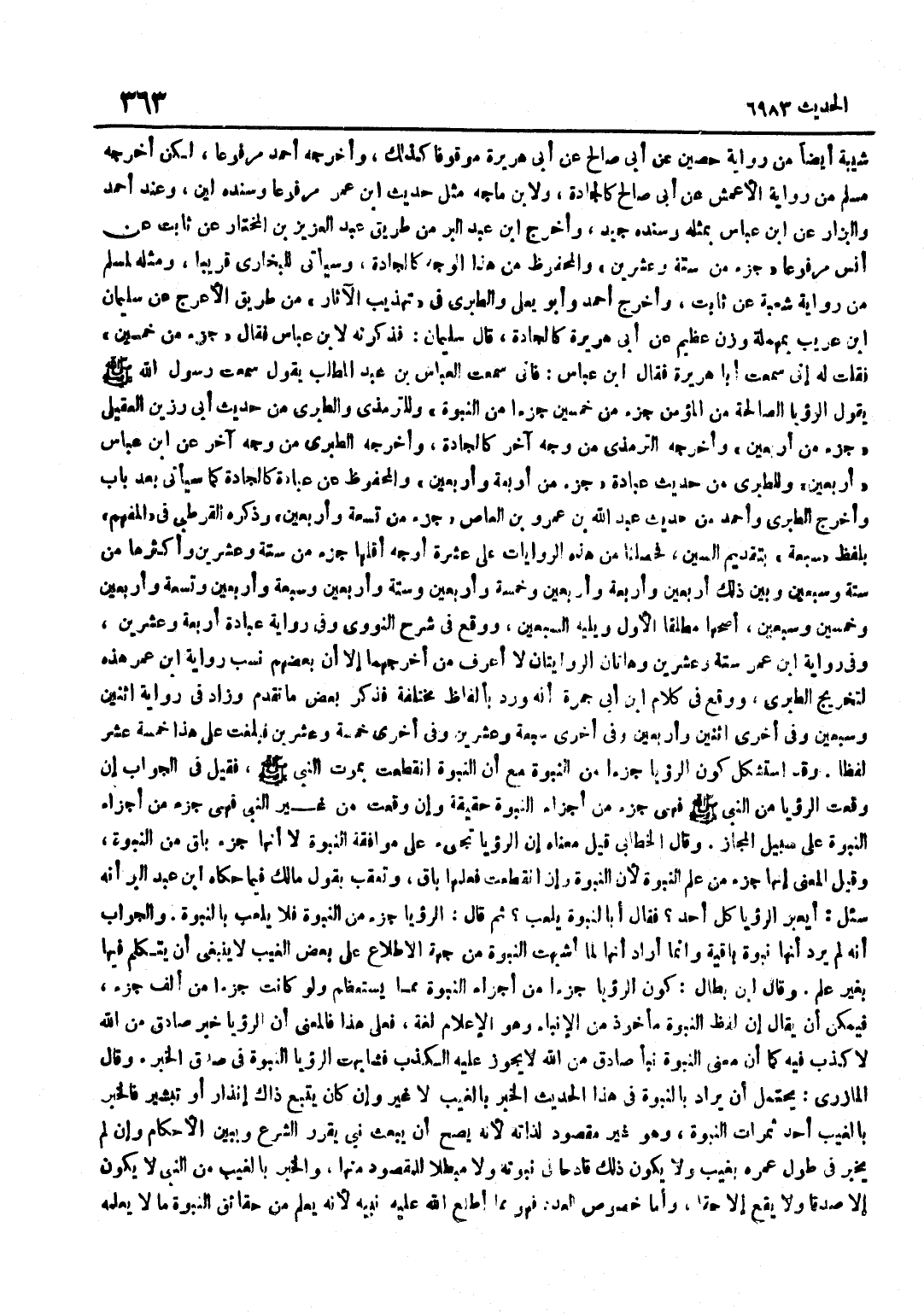 شَيْبَةَ أَيْضًا مِنْ رِوَايَةِ حُصَيْنٍ عَنْ أَبِي صَالِحٍ عَنْ أَبِي هُرَيْرَةَ مَوْقُوفًا كَذَلِكَ وَأَخْرَجَهُ أَحْمَدُ مَرْفُوعًا لَكِنْ أَخْرَجَهُ مُسْلِمٌ مِنْ رِوَايَةِ الْأَعْمَشِ عَنْ أَبِي صَالِحٍ كَالْجَادَّةِ وَلِابْنِ مَاجَهْ مثل حَدِيث بن عُمَرَ مَرْفُوعًا وَسَنَدُهُ لَيِّنٌ وَعِنْدَ أَحْمَدَ وَالْبَزَّارِ عَن بن عَبَّاس بِمثلِهِ وَسَنَده جيد وَأخرج بن عَبْدِ الْبَرِّ مِنْ طَرِيقِ عَبْدِ الْعَزِيزِ بْنِ الْمُخْتَارِ عَنْ ثَابِتٍ عَنْ أَنَسٍ مَرْفُوعًا جُزْءٌ مِنْ سِتَّةٍ وَعِشْرِينَ وَالْمَحْفُوظُ مِنْ هَذَا الْوَجْهِ كَالْجَادَّةِ وَسَيَأْتِي لِلْبُخَارِيِّ قَرِيبًا وَمِثْلُهُ لِمُسْلِمٍ مِنْ رِوَايَةِ شُعْبَةَ عَنْ ثَابِتٍ وَأَخْرَجَ أَحْمَدُ وَأَبُو يَعْلَى وَالطَّبَرِيُّ فِي تَهْذِيبِ الْآثَارِ مِنْ طَرِيقِ الْأَعْرَجِ عَنْ سُلَيْمَانَ بْنِ عَرِيبٍ بِمُهْمَلَةٍ وَزْنُ عَظِيم عَن أَبِي هُرَيْرَةَ كَالْجَادَّةِ قَالَ سُلَيْمَانُ فَذَكَرْتُهُ لِابْنِ عَبَّاسٍ فَقَالَ جُزْءٌ مِنْ خَمْسِينَ فَقُلْتُ لَهُ أَنِّي سَمِعت أَبَا هُرَيْرَة فَقَالَ بن عَبَّاسٍ فَإِنِّي سَمِعْتُ الْعَبَّاسَ بْنَ عَبْدِ الْمُطَّلِبِ يَقُولُ سَمِعْتُ رَسُولَ اللَّهِ صَلَّى اللَّهُ عَلَيْهِ وَسَلَّمَ يَقُولُ الرُّؤْيَا الصَّالِحَةُ مِنَ الْمُؤْمِنِ جُزْءٌ مِنْ خَمْسِينَ جُزْءًا مِنَ النُّبُوَّةِ وَلِلتِّرْمِذِيِّ وَالطَّبَرِيِّ مِنْ حَدِيثِ أَبِي رَزِينٍ الْعُقَيْلِيِّ جُزْءٌ مِنْ أَرْبَعِينَ وَأخرجه التِّرْمِذِيُّ مِنْ وَجْهٍ آخَرَ كَالْجَادَّةِ وَأَخْرَجَهُ الطَّبَرِيُّ من وَجه آخر عَن بن عَبَّاسٍ أَرْبَعِينَ وَلِلطَّبَرِيِّ مِنْ حَدِيثِ عُبَادَةَ جُزْءٌ مِنْ أَرْبَعَةٍ وَأَرْبَعِينَ وَالْمَحْفُوظُ عَنْ عُبَادَةَ كَالْجَادَّةِ كَمَا سَيَأْتِي بَعْدَ بَابٍ وَأَخْرَجَ الطَّبَرِيُّ وَأَحْمَدُ مِنْ حَدِيثِ عَبْدِ اللَّهِ بْنِ عَمْرِو بْنِ الْعَاصِ جُزْءٌ مِنْ تِسْعَةٍ وَأَرْبَعِينَ وَذَكَرَهُ الْقُرْطُبِيُّ فِي الْمُفْهِمِ بِلَفْظِ سَبْعَةٍ بِتَقْدِيمِ السِّينِ فَحَصَلْنَا مِنْ هَذِهِ الرِّوَايَاتِ عَلَى عَشَرَةِ أَوْجُهٍ أَقَلُّهَا جُزْءٌ مِنْ سِتَّةٍ وَعِشْرِينَ وَأَكْثَرُهَا مِنْ سِتَّةٍ وَسَبْعِينَ وَبَيْنَ ذَلِكَ أَرْبَعِينَ وَأَرْبَعَةٍ وَأَرْبَعِينَ وَخَمْسَةٍ وَأَرْبَعِينَ وَسِتَّةٍ وَأَرْبَعِينَ وَسَبْعَةٍ وَأَرْبَعِينَ وَتِسْعَةٍ وَأَرْبَعِينَ وَخَمْسِينَ وَسَبْعِينَ أَصَحُّهَا مُطْلَقًا الْأَوَّلُ وَيَلِيهِ السَّبْعِينَ وَوَقَعَ فِي شَرْحِ النَّوَوِيِّ وَفِي رِوَايَةِ عُبَادَةَ أَرْبَعَة وَعشْرين وَفِي رِوَايَة بن عُمَرَ سِتَّةٍ وَعِشْرِينَ وَهَاتَانِ الرِّوَايَتَانِ لَا أَعْرِفُ مَنْ أَخْرَجَهُمَا إِلَّا أَنَّ بَعْضَهُمْ نَسَبَ رِوَايَةَ بن عُمَرَ هَذِهِ لِتَخْرِيجِ الطَّبَرِيِّ وَوَقَعَ فِي كَلَامِ بن أَبِي جَمْرَةَ أَنَّهُ وَرَدَ بِأَلْفَاظٍ مُخْتَلِفَةٍ فَذَكَرَ بَعْضَ مَا تَقَدَّمَ وَزَادَ فِي رِوَايَةٍ اثْنَيْنِ وَسَبْعِينَ وَفِي أُخْرَى اثْنَيْنِ وَأَرْبَعِينَ وَفِي أُخْرَى سَبْعَةٍ وَعِشْرِينَ وَفِي أُخْرَى خَمْسَةٍ وَعِشْرِينَ فَبَلَغَتْ عَلَى هَذَا خَمْسَةَ عَشَرَ لَفْظًا وَقَدْ اسْتُشْكِلَ كَوْنُ الرُّؤْيَا جُزْءًا مِنَ النُّبُوَّةِ مَعَ أَنَّ النُّبُوَّةَ انْقَطَعَتْ بِمَوْتِ النَّبِيِّ صَلَّى اللَّهُ عَلَيْهِ وَسَلَّمَ فَقِيلَ فِي الْجَوَابِ إِنْ وَقَعَتِ الرُّؤْيَا مِنَ النَّبِيِّ صَلَّى اللَّهُ عَلَيْهِ وَسَلَّمَ فَهِيَ جُزْءٌ مِنْ أَجْزَاءِ النُّبُوَّةِ حَقِيقَةً وَإِنْ وَقَعَتْ مِنْ غَيْرِ النَّبِيِّ فَهِيَ جُزْءٌ مِنْ أَجْزَاءِ النُّبُوَّةِ عَلَى سَبِيلِ الْمَجَازِ وَقَالَ الْخَطَّابِيُّ قِيلَ مَعْنَاهُ أَنَّ ال