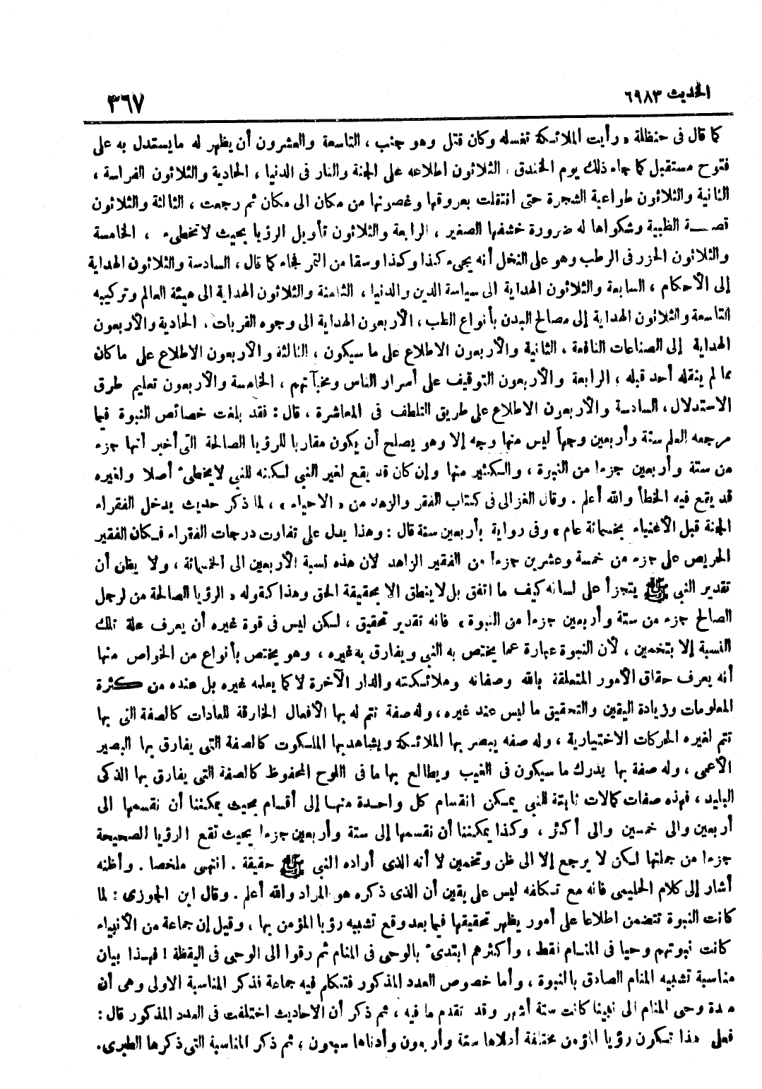 كَمَا قَالَ فِي حَنْظَلَةَ رَأَيْتُ الْمَلَائِكَةَ تُغَسِّلُهُ وَكَانَ قُتِلَ وَهُوَ جُنُبٌ التَّاسِعَةُ وَالْعِشْرُونَ أَنْ يَظْهَرَ لَهُ مَا يَسْتَدِلُّ بِهِ عَلَى فُتُوحِ مُسْتَقْبَلٍ كَمَا جَاءَ ذَلِكَ يَوْمُ الْخَنْدَقِ الثَّلَاثُونَ اطِّلَاعُهُ عَلَى الْجَنَّةِ وَالنَّارِ فِي الدُّنْيَا الْحَادِيَةُ وَالثَّلَاثُونَ الْفِرَاسَةُ الثَّانِيَةُ وَالثَّلَاثُونَ طَوَاعِيَةُ الشَّجَرَةِ حَتَّى انْتَقَلَتْ بِعُرُوقِهَا وَغُصُونِهَا مِنْ مَكَانٍ إِلَى مَكَانٍ ثُمَّ رَجَعَتْ الثَّالِثَةُ وَالثَّلَاثُونَ قِصَّةُ الظَّبْيَةِ وَشَكْوَاهَا لَهُ ضَرُورَةَ خِشْفِهَا الصَّغِيرِ الرَّابِعَةُ وَالثَّلَاثُونَ تَأْوِيلُ الرُّؤْيَا بِحَيْثُ لَا تُخْطِئُ الْخَامِسَةُ وَالثَّلَاثُونَ الْحَزْرُ فِي الرُّطَبِ وَهُوَ عَلَى النَّخْلِ أَنَّهُ يَجِيءُ كَذَا وَكَذَا وَسْقًا مِنَ التَّمْرِ فَجَاءَ كَمَا قَالَ السَّادِسَةُ وَالثَّلَاثُونَ الْهِدَايَةُ إِلَى الْأَحْكَامِ السَّابِعَةُ وَالثَّلَاثُونَ الْهِدَايَةُ إِلَى سِيَاسَةِ الدِّينِ وَالدُّنْيَا الثَّامِنَةُ وَالثَّلَاثُونَ الْهِدَايَةُ إِلَى هَيْئَةِ الْعَالَمِ وَتَرْكِيبِهِ التَّاسِعَةُ وَالثَّلَاثُونَ الْهِدَايَةُ إِلَى مَصَالِحِ الْبَدَنِ بِأَنْوَاعِ الطِّبِّ الْأَرْبَعُونَ الْهِدَايَةُ إِلَى وُجُوهِ الْقُرُبَاتِ الْحَادِيَةُ وَالْأَرْبَعُونَ الْهِدَايَةُ إِلَى الصِّنَاعَاتِ النَّافِعَةِ الثَّانِيَةُ وَالْأَرْبَعُونَ الِاطِّلَاعُ عَلَى مَا سَيَكُونُ الثَّالِثَةُ وَالْأَرْبَعُونَ الِاطِّلَاعُ عَلَى مَا كَانَ مِمَّا لَمْ يَنْقُلْهُ أَحَدٌ قَبْلَهُ الرَّابِعَةُ وَالْأَرْبَعُونَ التَّوْقِيفُ عَلَى أَسْرَارِ النَّاسِ وَمُخَبَّآتِهِمْ الْخَامِسَةُ وَالْأَرْبَعُونَ تَعْلِيمُ طُرُقِ الِاسْتِدْلَالِ السَّادِسَةُ وَالْأَرْبَعُونَ الِاطِّلَاعُ عَلَى طَرِيقِ التَّلَطُّفِ فِي الْمُعَاشَرَةِ قَالَ فَقَدْ بَلَغَتْ خَصَائِصُ النُّبُوَّةِ فِيمَا مَرْجِعُهُ الْعِلْمُ سِتَّةً وَأَرْبَعِينَ وَجْهًا لَيْسَ مِنْهَا وَجْهٌ إِلَّا وَهُوَ يَصْلُحُ أَنْ يَكُونَ مُقَارِبًا لِلرُّؤْيَا الصَّالِحَةِ الَّتِي أَخْبَرَ أَنَّهَا جُزْءٌ مِنْ سِتَّةٍ وَأَرْبَعِينَ جُزْءًا مِنَ النُّبُوَّةِ وَالْكَثِيرُ مِنْهَا وَإِنْ كَانَ قَدْ يَقَعُ لِغَيْرِ النَّبِيِّ لَكِنَّهُ لِلنَّبِيِّ لَا يُخْطِئُ أَصْلًا وَلِغَيْرِهِ قَدْ يَقَعُ فِيهِ الْخَطَأُ وَاللَّهُ أَعْلَمُ وَقَالَ الْغَزَالِيُّ فِي كِتَابِ الْفَقْرِ وَالزُّهْدِ مِنَ الْإِحْيَاءِ لَمَّا ذَكَرَ حَدِيثَ يَدْخُلُ الْفُقَرَاءُ الْجَنَّةَ قَبْلَ الْأَغْنِيَاءِ بِخَمْسِمِائَةِ عَامٍ وَفِي رِوَايَةٍ بِأَرْبَعِينَ سَنَةً قَالَ وَهَذَا يَدُلُّ عَلَى تَفَاوُتِ دَرَجَاتِ الْفُقَرَاءِ فَكَانَ الْفَقِيرُ الْحَرِيصُ عَلَى جُزْءٍ مِنْ خَمْسَةٍ وَعِشْرِينَ جُزْءًا مِنَ الْفَقِيرِ الزَّاهِدِ لِأَنَّ هَذِهِ نِسْبَةُ الْأَرْبَعِينَ إِلَى الْخَمْسمِائَةِ وَلَا يُظَنُّ أَنَّ تَقْدِيرَ النَّبِيِّ صَلَّى اللَّهُ عَلَيْهِ وَسلم يتَجَزَّأ على لِسَانه كَيفَ مَا اتَّفَقَ بَلْ لَا يَنْطِقُ إِلَّا بِحَقِيقَةِ الْحَقِّ وَهَذَا كَقَوْلِهِ الرُّؤْيَا الصَّالِحَةُ مِنَ الرَّجُلِ الصَّالِحِ جُزْء من سِتَّة وَأَرْبَعين جُزْءا من النُّبُوَّة فَإِنَّهُ تَقْدِيرُ تَحْقِيقٍ لَكِنْ لَيْسَ فِي قُوَّةِ غَيْرِهِ أَنْ يَعْرِفَ عِلَّةَ تِلْكَ النِّسْبَةِ إِلَّا بِتَخْمِينٍ لِأَنَّ النُّبُوَّةَ عِبَارَةٌ عَمَّا يَخْتَصُّ بِهِ النَّبِيُّ وَيُفَارِقُ بِهِ غَيْرَهُ وَهُوَ يَخْتَصُّ بِأَنْوَاعٍ مِنَ الْخَوَاصِّ مِنْهَا أَنَّهُ يَعْرِفُ حِقَاقَ الْأُمُورِ الْمُتَعَلِّقَةِ بِاللَّهِ وَصِفَاتِهِ وَمَلَائِكَتِهِ وَالد