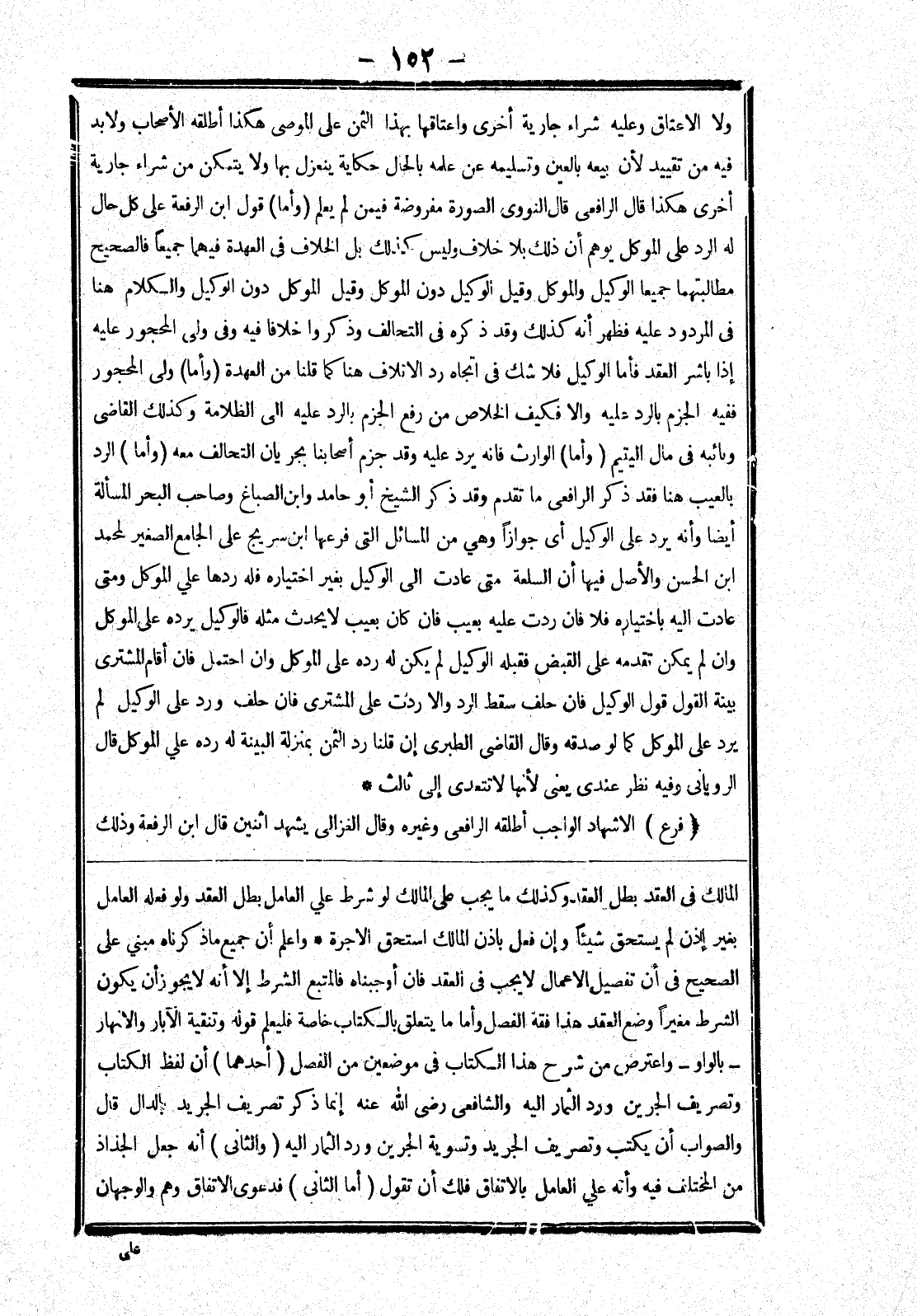 المالك في العقد بطل العقد وكذلك ما يجب على المالك لو شرط على العامل بطل العقد ولو فعله العامل بغير إذن لم يستحق شيئا وإن فعل باذن المالك استحق الاجرة * واعلم أن جميع ما ذكرناه مبني على الصحيح في أن تفصيل الاعمال لا يجب في العقد فان أوجبناه فالمتبع الشرط إلا أنه لا يجوز أن يكون الشرط مغيرا وضع العقد هذا فقه الفصل وأما ما يتعلق بالكتاب خاصة فليعلم قوله وتنقية الابار والانهار بالواو واعترض من شرح هذا الكتاب في موضعين من الفصل (أحدهما) أن لفظ الكتاب وتصريف الجرين ورد الثمار إليه والشافعي رضى الله عنه إنما ذكر تصريف الجريد بالدال قال والصواب أن يكتب وتصريف الجريد وتسوية الجرين ورد الثمار إليه (والثانى) أنه جعل الجذاذ من المختلف فيه وأنه على العامل بالاتفاق فلك أن تقول (أما الثاني) فدعوى الاتفاق وهم والوجهان