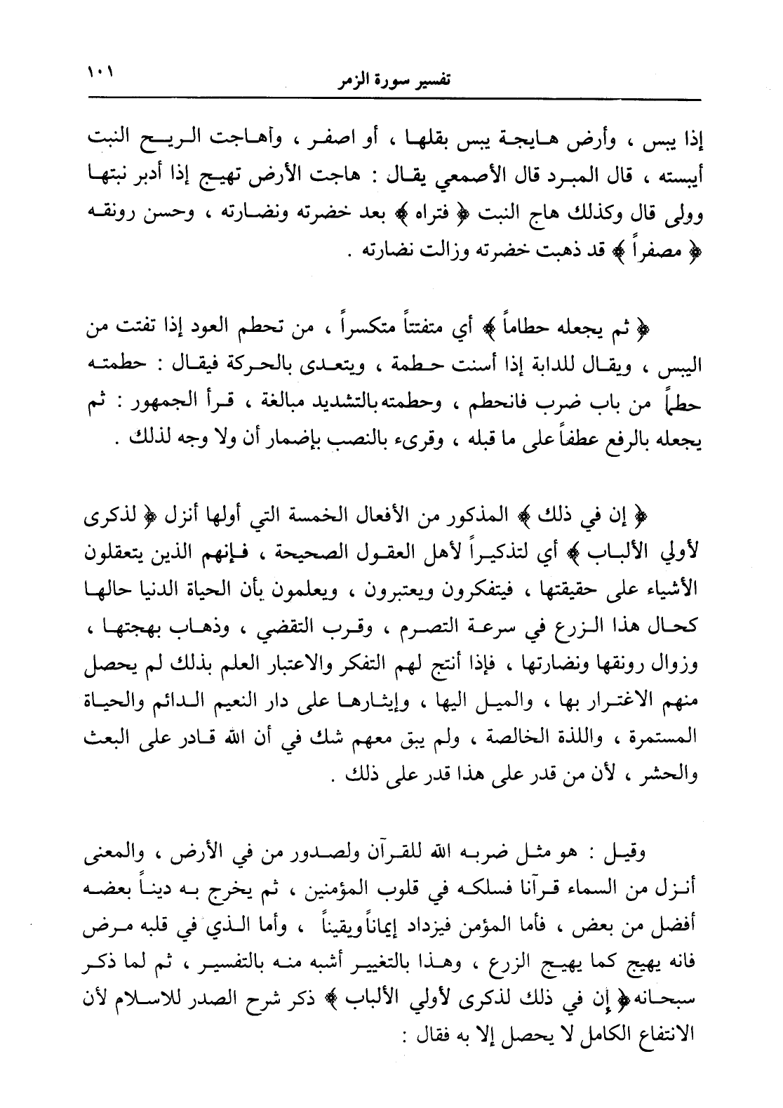 وقيل: هو مثل ضربه الله للقرآن ولصدور من في الأرض، والمعنى أنزل من السماء قرآنا فسلكه في قلوب المؤمنين، ثم يخرج به ديناً بعضه أفضل من بعض، فأما المؤمن فيزداد إيماناً ويقيناً، وأما الذي في قلبه مرض فإنه يهيج كما يهيج الزرع، وهذا بالتغيير أشبه منه بالتفسير، ثم لما ذكر سبحانه (إن في ذلك لذكرى لأولي الألباب) ذكر شرح الصدر للإسلام لأن الانتفاع الكامل لا يحصل إلا به فقال: