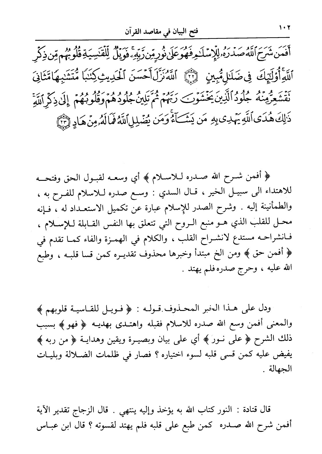 أَفَمَنْ شَرَحَ اللَّهُ صَدْرَهُ لِلْإِسْلَامِ فَهُوَ عَلَى نُورٍ مِنْ رَبِّهِ فَوَيْلٌ لِلْقَاسِيَةِ قُلُوبُهُمْ مِنْ ذِكْرِ اللَّهِ أُولَئِكَ فِي ضَلَالٍ مُبِينٍ (22) اللَّهُ نَزَّلَ أَحْسَنَ الْحَدِيثِ كِتَابًا مُتَشَابِهًا مَثَانِيَ تَقْشَعِرُّ مِنْهُ جُلُودُ الَّذِينَ يَخْشَوْنَ رَبَّهُمْ ثُمَّ تَلِينُ جُلُودُهُمْ وَقُلُوبُهُمْ إِلَى ذِكْرِ اللَّهِ ذَلِكَ هُدَى اللَّهِ يَهْدِي بِهِ مَنْ يَشَاءُ وَمَنْ يُضْلِلِ اللَّهُ فَمَا لَهُ مِنْ هَادٍ (23)