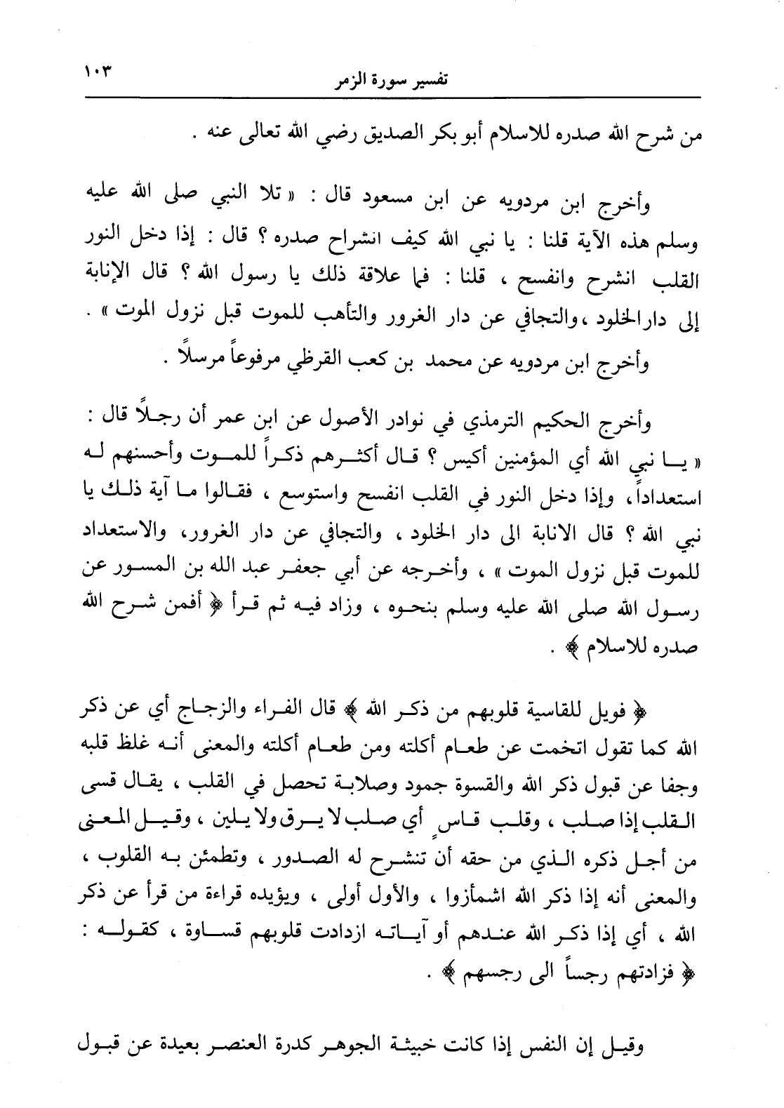 وأخرج الحكيم الترمذي في نوادر الأصول عن ابن عمر أن رجلاً قال: " يا نبي الله أي المؤمنين أكيس؟ قال أكثرهم ذكراً للموت وأحسنهم له استعداداً، وإذا دخل النور في القلب انفسح واستوسع، فقالوا ما آية ذلك يا نبي الله؟ قال الإنابة إلى دار الخلود، والتجافي عن دار الغرور، والاستعداد للموت قبل نزول الموت "، وأخرجه عن أبي جعفر عبد الله بن المسور عن رسول الله صلى الله عليه وسلم بنحوه، وزاد فيه ثم قرأ (أفمن شرح الله صدره للإسلام).