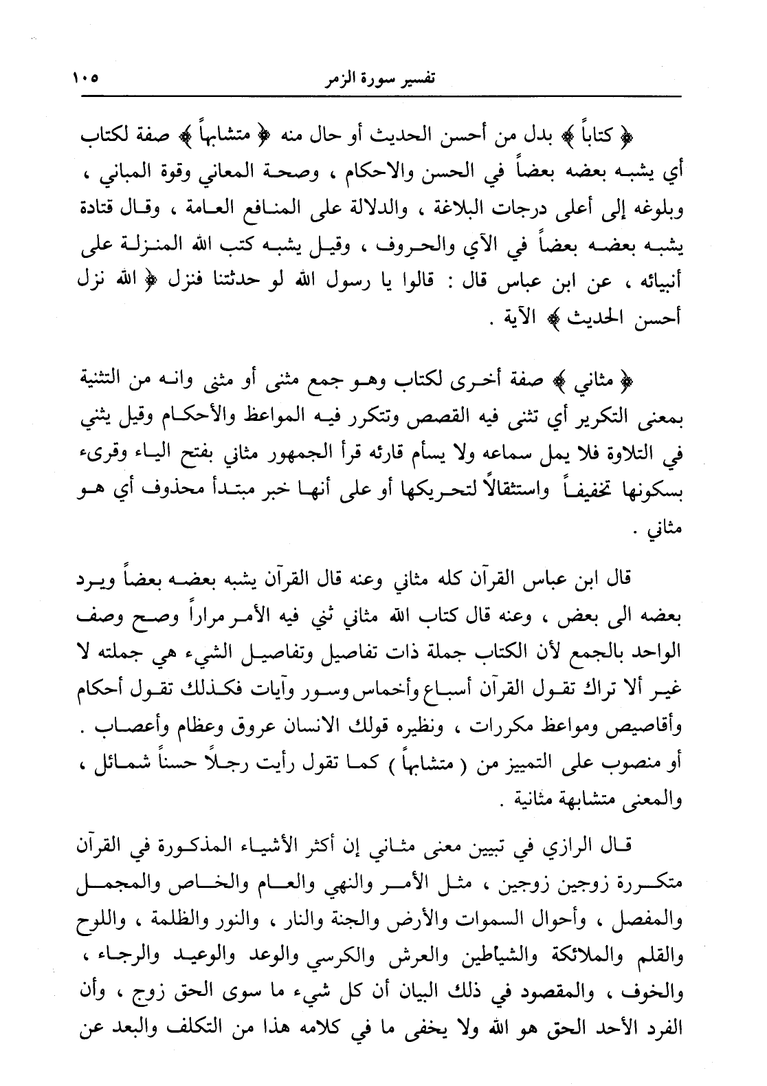 (كتاباً) بدل من أحسن الحديث أو حال منه (متشابهاً) صفة لكتاب أي يشبه بعضه بعضاً في الحسن والإحكام، وصحة المعاني وقوة المباني، وبلوغه إلى أعلى درجات البلاغة، والدلالة على المنافع العامة، وقال قتادة يشبه بعضه بعضاً في الآي والحروف، وقيل يشبه كتب الله المنزلة على أنبيائه، عن ابن عباس قال: قالوا يا رسول الله لو حدثتنا فنزل (الله نزل أحسن الحديث) الآية.