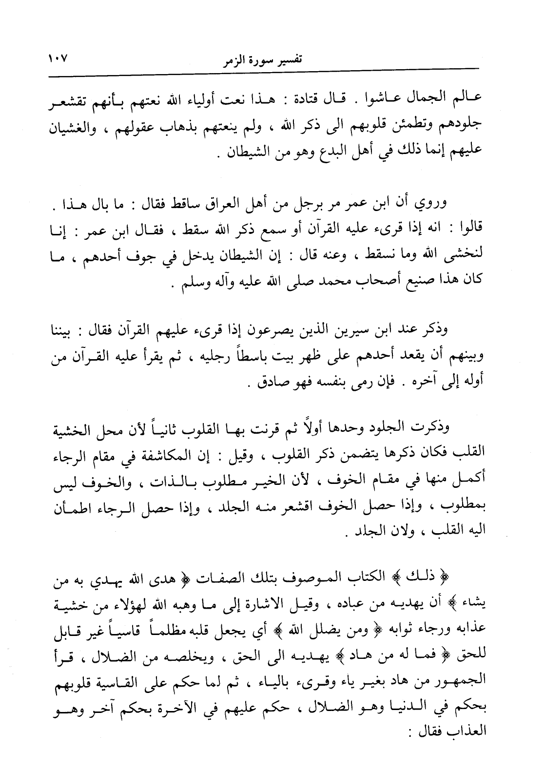 عالم الجمال عاشوا. قال قتادة: هذا نعت أولياء الله نعتهم بأنهم تقشعر جلودهم وتطمئن قلوبهم إلى ذكر الله، ولم ينعتهم بذهاب عقولهم، والغشيان عليهم إنما ذلك في أهل البدع وهو من الشيطان.