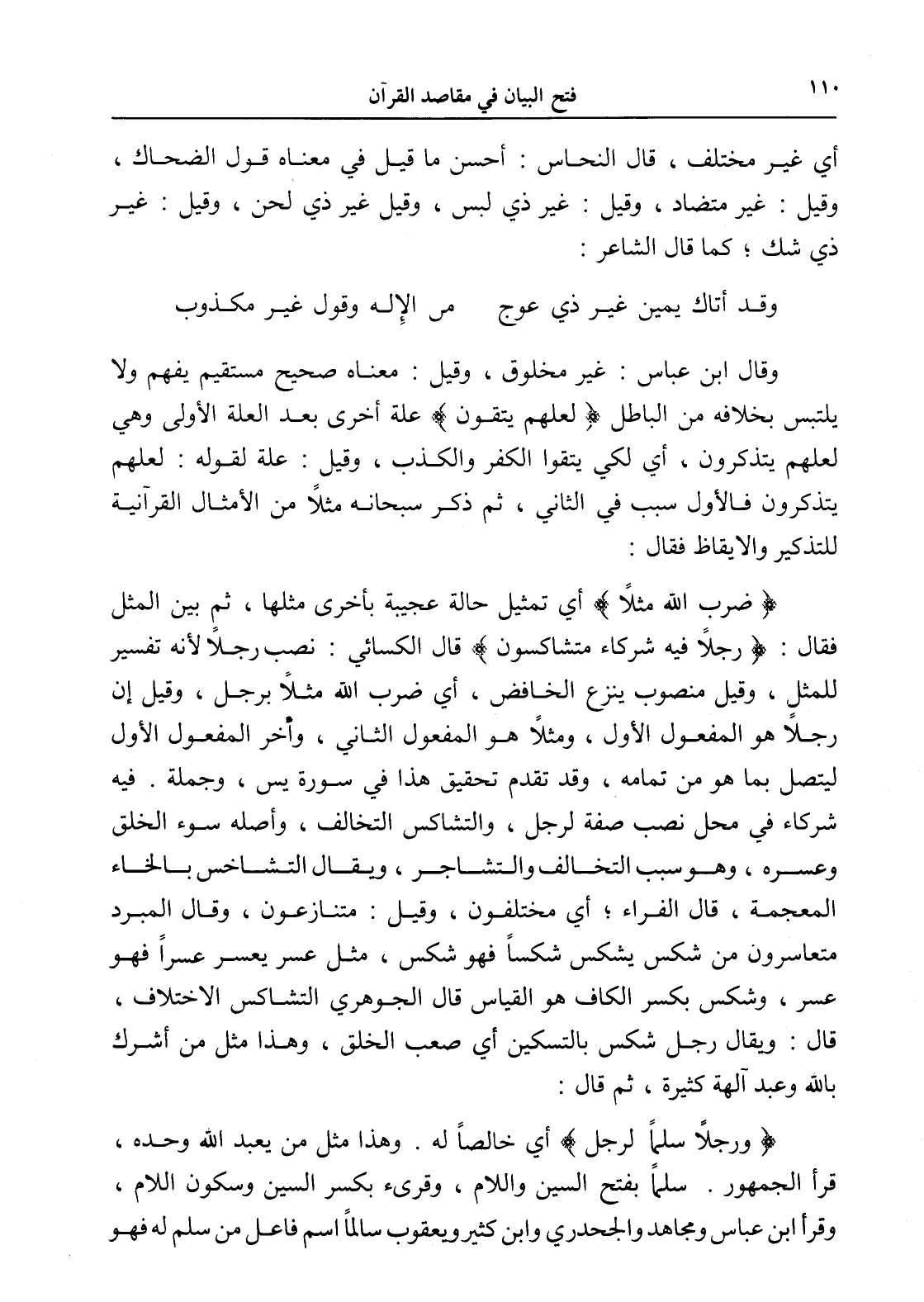 وقال ابن عباس: غير مخلوق، وقيل: معناه صحيح مستقيم يفهم ولا يلتبس بخلافه من الباطل (لعلهم يتقون) علة أخرى بعد العلة الأولى وهي لعلهم يتذكرون، أي لكي يتاقوا الكفر والكذب، وقيل: علة لقوله: لعلهم يتذكرون فالأول سبب في الثاني، ثم ذكر سبحانه مثلاً من الأمثال القرآنية للتذكير والإيقاظ فقال: