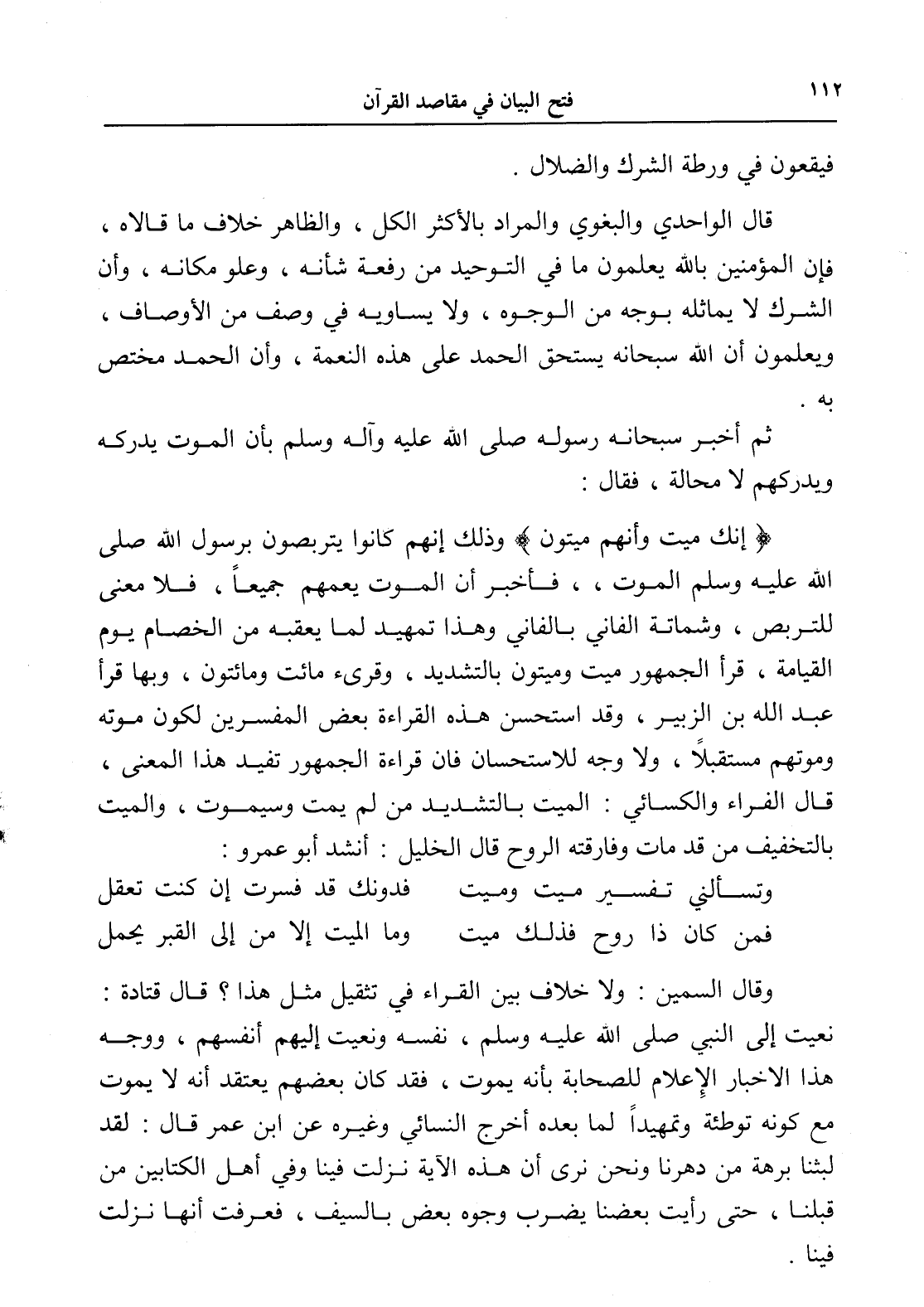(إنك ميت وإنهم ميتون) وذلك إنهم كانوا يتربصون برسول الله صلى الله عليه وسلم الموت، فأخبر أن الموت يعمهم جميعاً، فلا معنى للتربص، وشماتة الفاني بالفاني وهذا تمهيد لما يعقبه من الخصام يوم القيامة، قرأ الجمهور ميت وميتون بالتشديد، وقرىء مائت ومائتون، وبها قرأ عبد الله بن الزبير، وقد استحسن هذه القراءة بعض المفسرين لكون موته وموتهم مستقبلاً، ولا وجه للاستحسان فإن قراءة الجمهور تفيد هذا المعنى، قال الفراء والكسائي: الميت بالتشديد من لم يمت وسيموت، والميت بالتخفيف من قد مات وفارقته الروح قال الخليل: أنشد أبو عمرو: