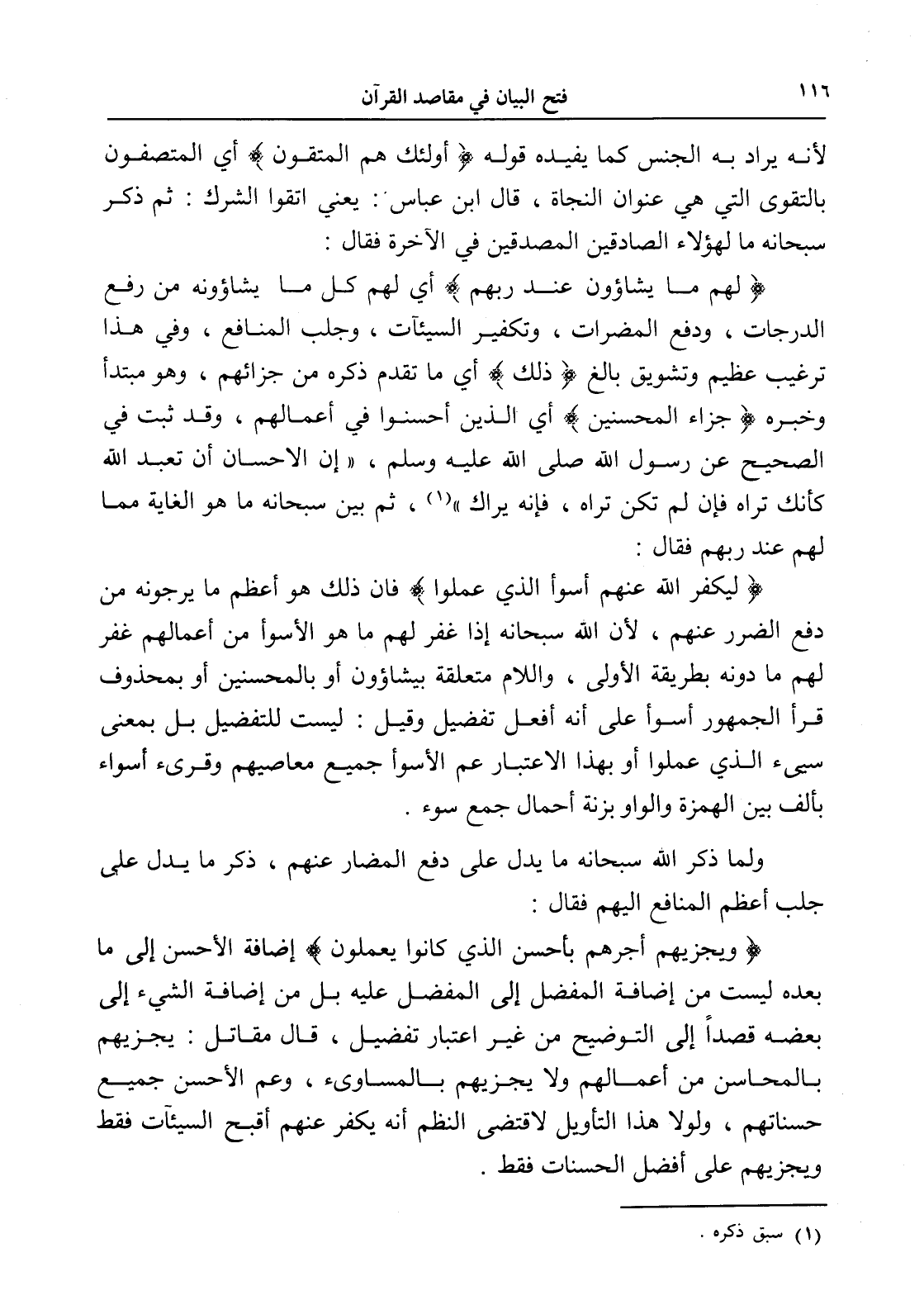 (لهم ما يشاؤون عند ربهم) أي لهم كل ما يشاؤونه من رفع الدرجات، ودفع المضرات، وتكفير السيئات، وجلب المنافع، وفي هذا ترغيب عظيم وتشويق بالغ (ذلك) أي ما تقدم ذكره من جزائهم، وهو مبتدأ وخبره (جزاء المحسنين) أي الذين أحسنوا في أعمالهم، وقد ثبت في الصحيح عن رسول الله صلى الله عليه وسلم، " إن الإحسان أن تعبد الله كأنك تراه فإن لم تكن تراه، فإنه يراك " (¬1)، ثم بين سبحانه ما هو الغاية مما لهم عند ربهم فقال: