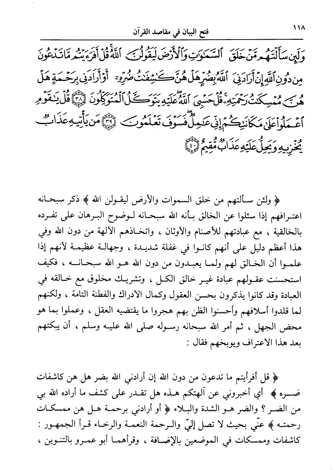 وَلَئِنْ سَأَلْتَهُمْ مَنْ خَلَقَ السَّمَاوَاتِ وَالْأَرْضَ لَيَقُولُنَّ اللَّهُ قُلْ أَفَرَأَيْتُمْ مَا تَدْعُونَ مِنْ دُونِ اللَّهِ إِنْ أَرَادَنِيَ اللَّهُ بِضُرٍّ هَلْ هُنَّ كَاشِفَاتُ ضُرِّهِ أَوْ أَرَادَنِي بِرَحْمَةٍ هَلْ هُنَّ مُمْسِكَاتُ رَحْمَتِهِ قُلْ حَسْبِيَ اللَّهُ عَلَيْهِ يَتَوَكَّلُ الْمُتَوَكِّلُونَ (38) قُلْ يَا قَوْمِ اعْمَلُوا عَلَى مَكَانَتِكُمْ إِنِّي عَامِلٌ فَسَوْفَ تَعْلَمُونَ (39) مَنْ يَأْتِيهِ عَذَابٌ يُخْزِيهِ وَيَحِلُّ عَلَيْهِ عَذَابٌ مُقِيمٌ (40)