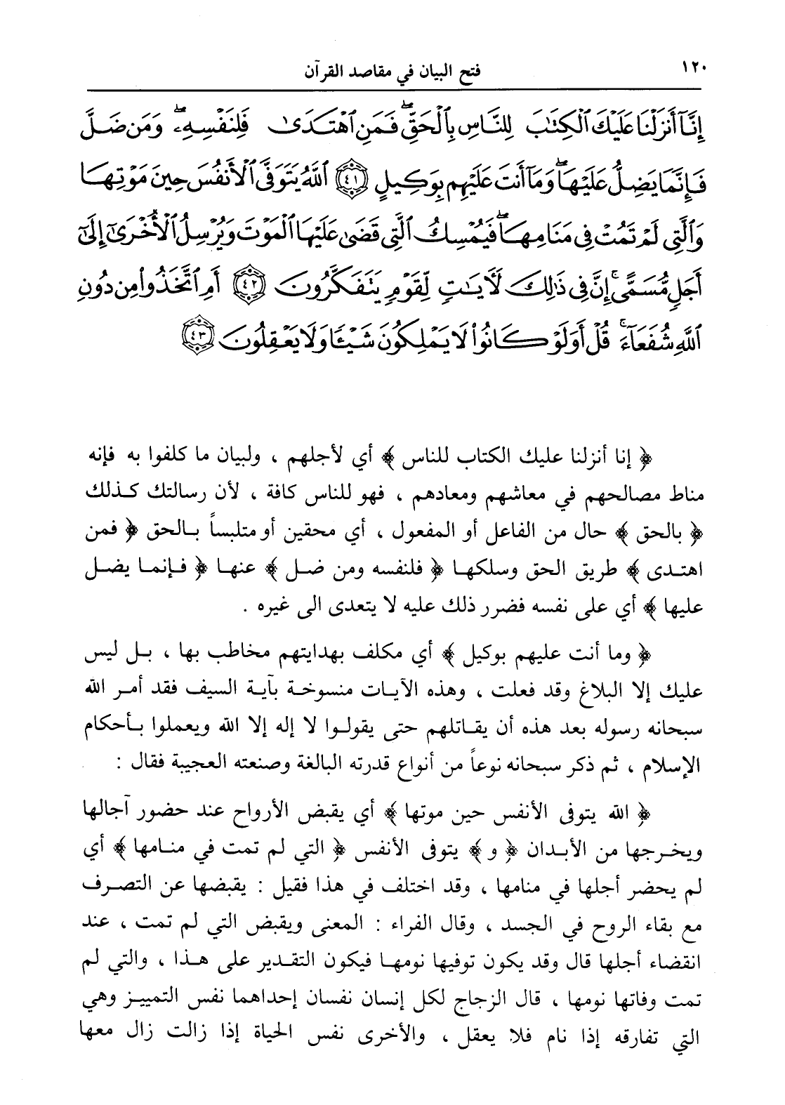 إِنَّا أَنْزَلْنَا عَلَيْكَ الْكِتَابَ لِلنَّاسِ بِالْحَقِّ فَمَنِ اهْتَدَى فَلِنَفْسِهِ وَمَنْ ضَلَّ فَإِنَّمَا يَضِلُّ عَلَيْهَا وَمَا أَنْتَ عَلَيْهِمْ بِوَكِيلٍ (41) اللَّهُ يَتَوَفَّى الْأَنْفُسَ حِينَ مَوْتِهَا وَالَّتِي لَمْ تَمُتْ فِي مَنَامِهَا فَيُمْسِكُ الَّتِي قَضَى عَلَيْهَا الْمَوْتَ وَيُرْسِلُ الْأُخْرَى إِلَى أَجَلٍ مُسَمًّى إِنَّ فِي ذَلِكَ لَآيَاتٍ لِقَوْمٍ يَتَفَكَّرُونَ (42) أَمِ اتَّخَذُوا مِنْ دُونِ اللَّهِ شُفَعَاءَ قُلْ أَوَلَوْ كَانُوا لَا يَمْلِكُونَ شَيْئًا وَلَا يَعْقِلُونَ (43)