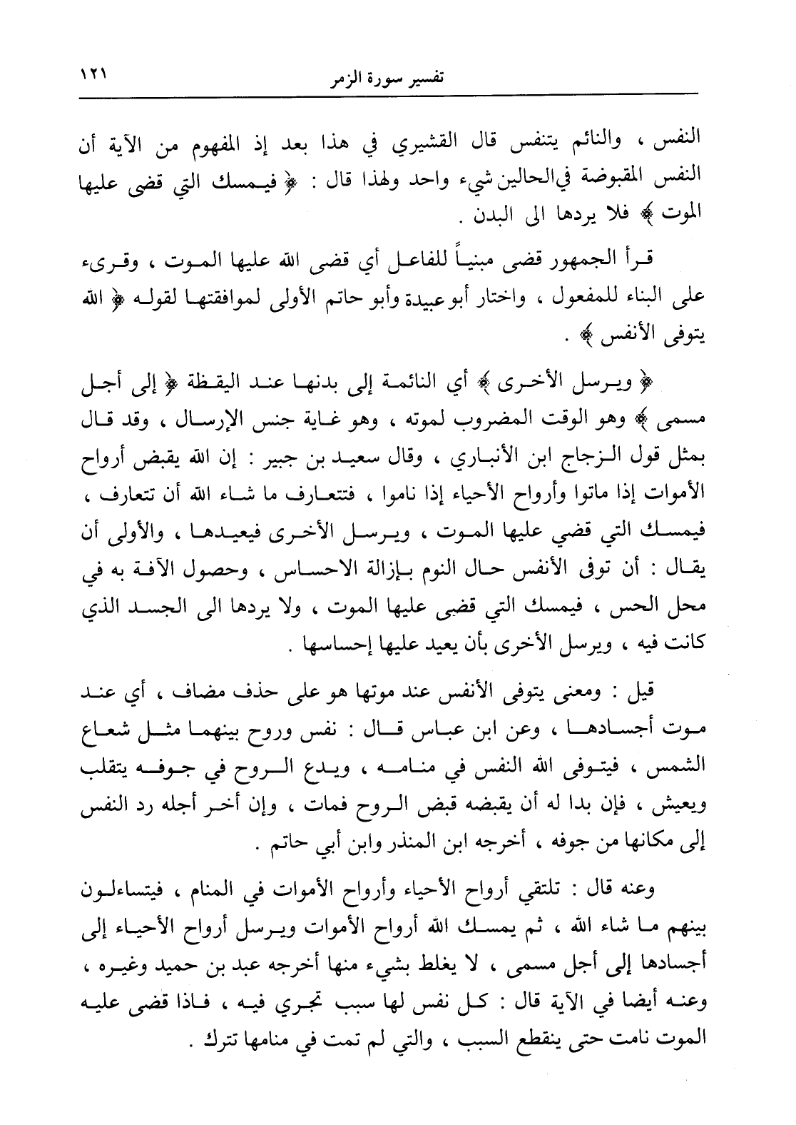 قيل: ومعنى يتوفى الأنفس عند موتها هو على حذف مضاف، أي عند موت أجسادها، وعن ابن عباس قال: نفس وروح بينهما مثل شعاع الشمس، فيتوفى الله النفس في منامه، ويدع الروح في جوفه يتقلب ويعيش، فإن بدا له أن يقبضه قبض الروح فمات، وإن أخر أجله رد النفس إلى مكانها من جوفه، أخرجه ابن المنذر وابن أبي حاتم.