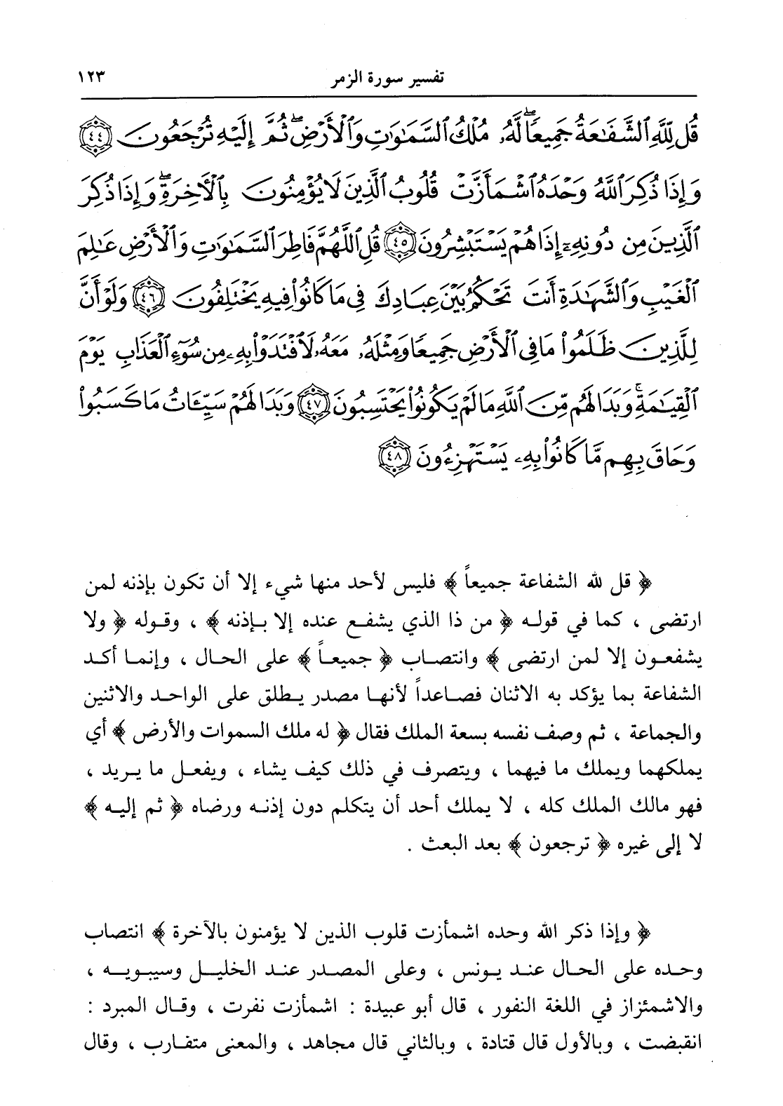 قُلْ لِلَّهِ الشَّفَاعَةُ جَمِيعًا لَهُ مُلْكُ السَّمَاوَاتِ وَالْأَرْضِ ثُمَّ إِلَيْهِ تُرْجَعُونَ (44) وَإِذَا ذُكِرَ اللَّهُ وَحْدَهُ اشْمَأَزَّتْ قُلُوبُ الَّذِينَ لَا يُؤْمِنُونَ بِالْآخِرَةِ وَإِذَا ذُكِرَ الَّذِينَ مِنْ دُونِهِ إِذَا هُمْ يَسْتَبْشِرُونَ (45) قُلِ اللَّهُمَّ فَاطِرَ السَّمَاوَاتِ وَالْأَرْضِ عَالِمَ الْغَيْبِ وَالشَّهَادَةِ أَنْتَ تَحْكُمُ بَيْنَ عِبَادِكَ فِي مَا كَانُوا فِيهِ يَخْتَلِفُونَ (46) وَلَوْ أَنَّ لِلَّذِينَ ظَلَمُوا مَا فِي الْأَرْضِ جَمِيعًا وَمِثْلَهُ مَعَهُ لَافْتَدَوْا بِهِ مِنْ سُوءِ الْعَذَابِ يَوْمَ الْقِيَامَةِ وَبَدَا لَهُمْ مِنَ اللَّهِ مَا لَمْ يَكُونُوا يَحْتَسِبُونَ (47) وَبَدَا لَهُمْ سَيِّئَاتُ مَا كَسَبُوا وَحَاقَ بِهِمْ مَا كَانُوا بِهِ يَسْتَهْزِئُونَ (48)