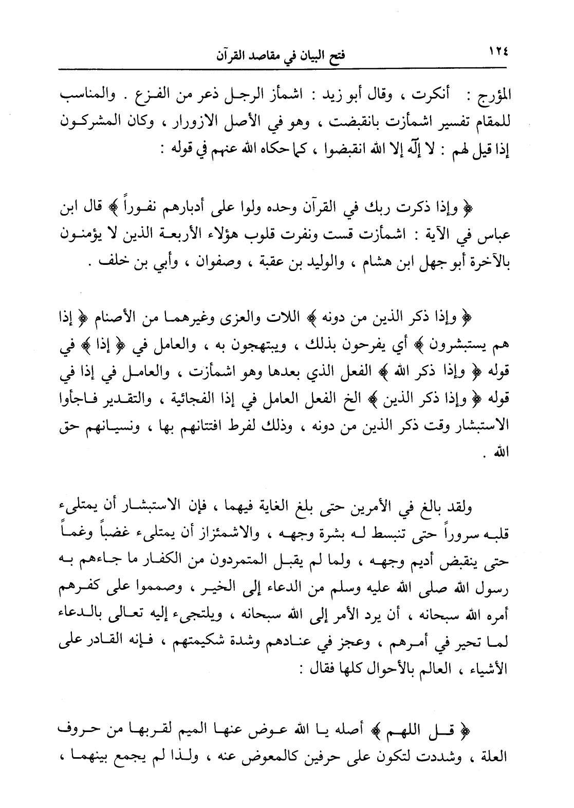 المؤرج: أنكرت، وقال أبو زيد: اشمأز الرجل ذعر من الفزع. والمناسب للمقام تفسير اشمأزت بانقبضت، وهو في الأصل الازورار، وكان المشركون إذا قيل لهم: لا إله إلا الله انقبضوا، كما حكاه الله عنهم في قوله: