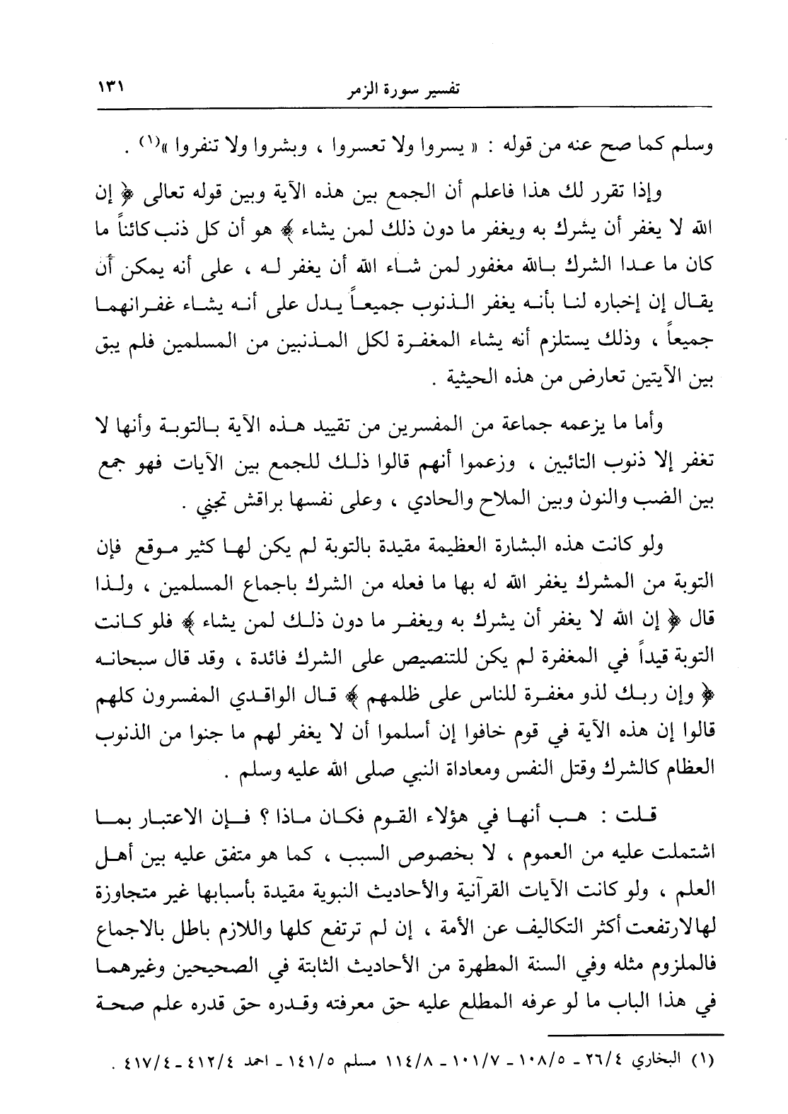 ولو كانت هذه البشارة العظيمة مقيدة بالتوبة لم يكن لها كثير موقع فإن التوبة من المشرك يغفر الله له بها ما فعله من الشرك بإجماع المسلمين، ولذا قال (إن الله لا يغفر أن يشرك به ويغفر ما دون ذلك لمن يشاء) فلو كانت التوبة قيداً في المغفرة لم يكن للتنصيص على الشرك فائدة، وقد قال سبحانه (وإن ربك لذو مغفرة للناس على ظلمهم) قال الواقدي المفسرون كلهم قالوا إن هذه الآية في قوم خافوا إن أسلموا أن لا يغفر لهم ما جنوا من الذنوب العظام كالشرك وقتل النفس ومعاداة النبي صلى الله عليه وسلم.