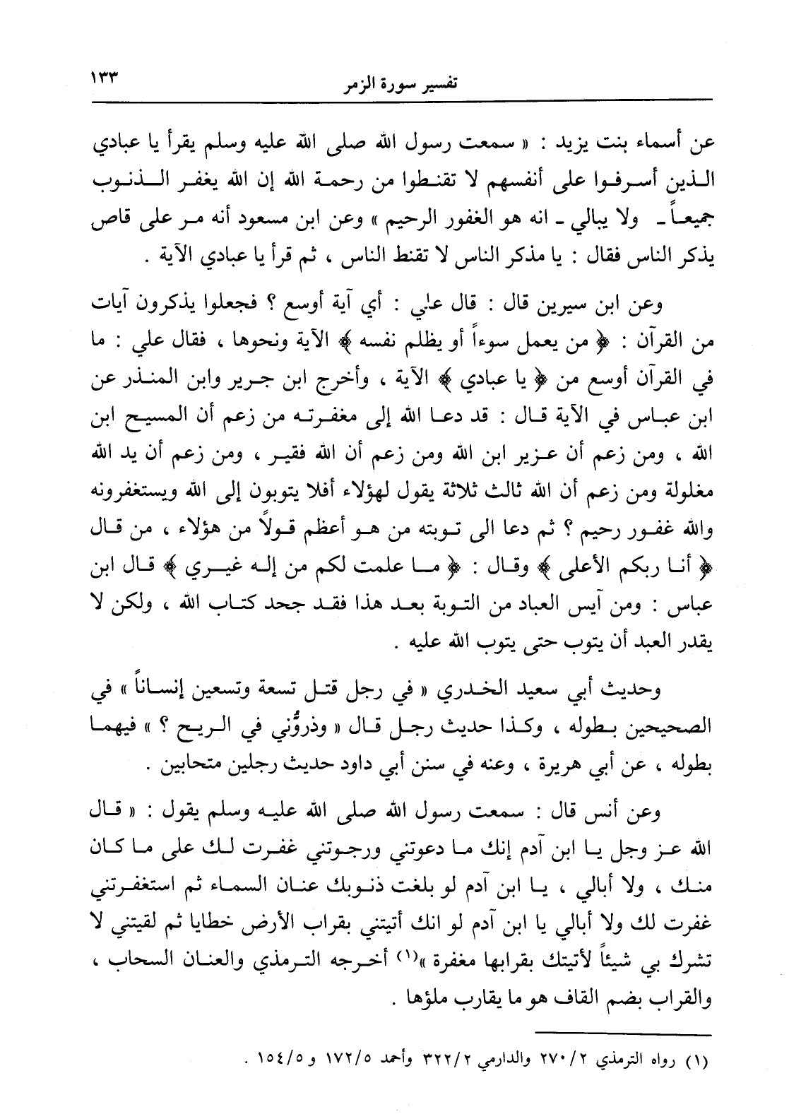 عن أسماء بنت يزيد: " سمعت رسول الله صلى الله عليه وسلم يقرأ يا عبادي الذين أسرفوا على أنفسهم لا تقنطوا من رحمة الله إن الله يغفر الذنوب جمعاً -ولا يبالي- إنه هو الغفور الرحيم " وعن ابن مسعود أنه مر على قاص يذكر الناس فقال: يا مذكر الناس لا تقنط الناس، ثم قرأ يا عبادي الآية.