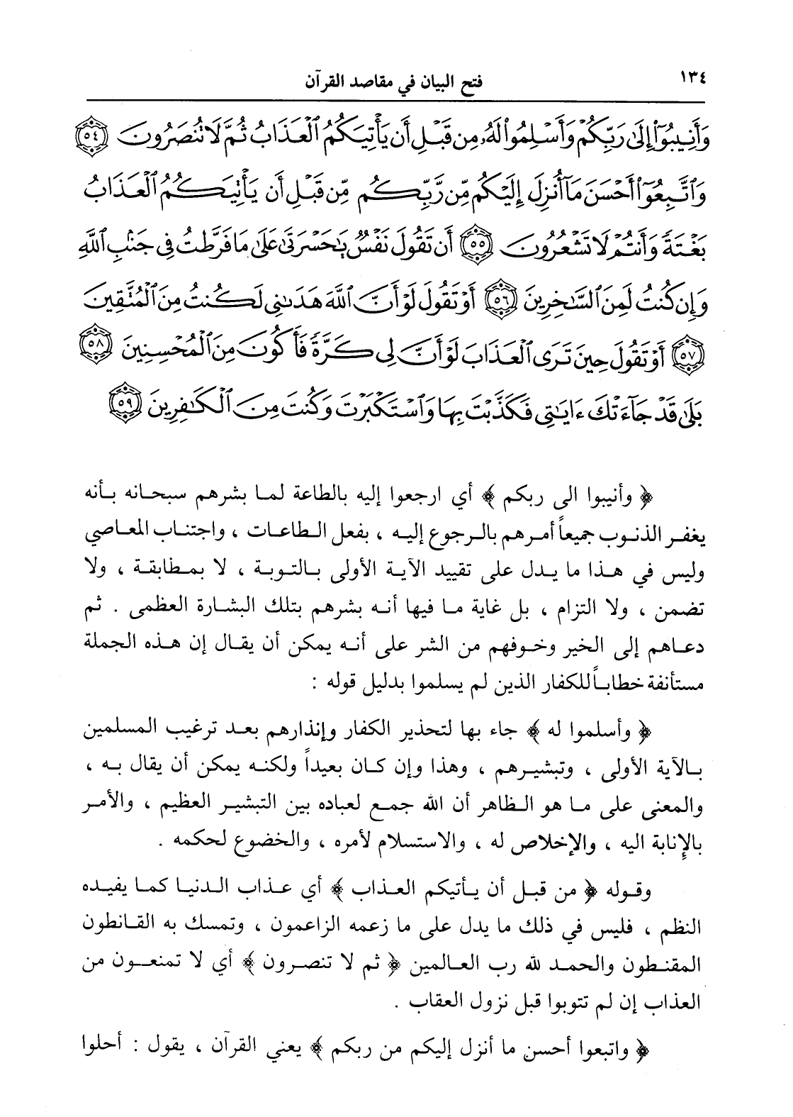وَأَنِيبُوا إِلَى رَبِّكُمْ وَأَسْلِمُوا لَهُ مِنْ قَبْلِ أَنْ يَأْتِيَكُمُ الْعَذَابُ ثُمَّ لَا تُنْصَرُونَ (54) وَاتَّبِعُوا أَحْسَنَ مَا أُنْزِلَ إِلَيْكُمْ مِنْ رَبِّكُمْ مِنْ قَبْلِ أَنْ يَأْتِيَكُمُ الْعَذَابُ بَغْتَةً وَأَنْتُمْ لَا تَشْعُرُونَ (55) أَنْ تَقُولَ نَفْسٌ يَا حَسْرَتَا عَلَى مَا فَرَّطْتُ فِي جَنْبِ اللَّهِ وَإِنْ كُنْتُ لَمِنَ السَّاخِرِينَ (56) أَوْ تَقُولَ لَوْ أَنَّ اللَّهَ هَدَانِي لَكُنْتُ مِنَ الْمُتَّقِينَ (57) أَوْ تَقُولَ حِينَ تَرَى الْعَذَابَ لَوْ أَنَّ لِي كَرَّةً فَأَكُونَ مِنَ الْمُحْسِنِينَ (58) بَلَى قَدْ جَاءَتْكَ آيَاتِي فَكَذَّبْتَ بِهَا وَاسْتَكْبَرْتَ وَكُنْتَ مِنَ الْكَافِرِينَ (59)