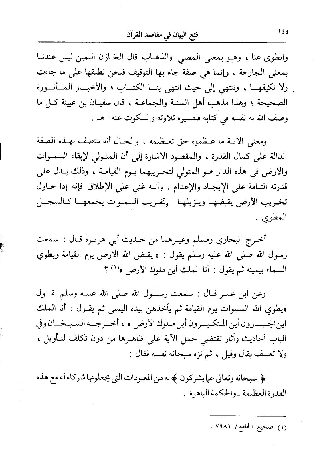 وعن ابن عمر قال: سمعت رسول الله صلى الله عليه وسلم يقول " يطوي الله السموات يوم القيامة ثم يأخذهن بيده اليمنى ثم يقول: أنا الملك أين الجبارون أين المتكبرون أين ملوك الأرض "، أخرجه الشيخان وفي الباب أحاديث وآثار تقتضي حمل الآية على ظاهرها من دون تكلف لتأويل، ولا تعسف بقال وقيل، ثم نزه سبحانه نفسه فقال: