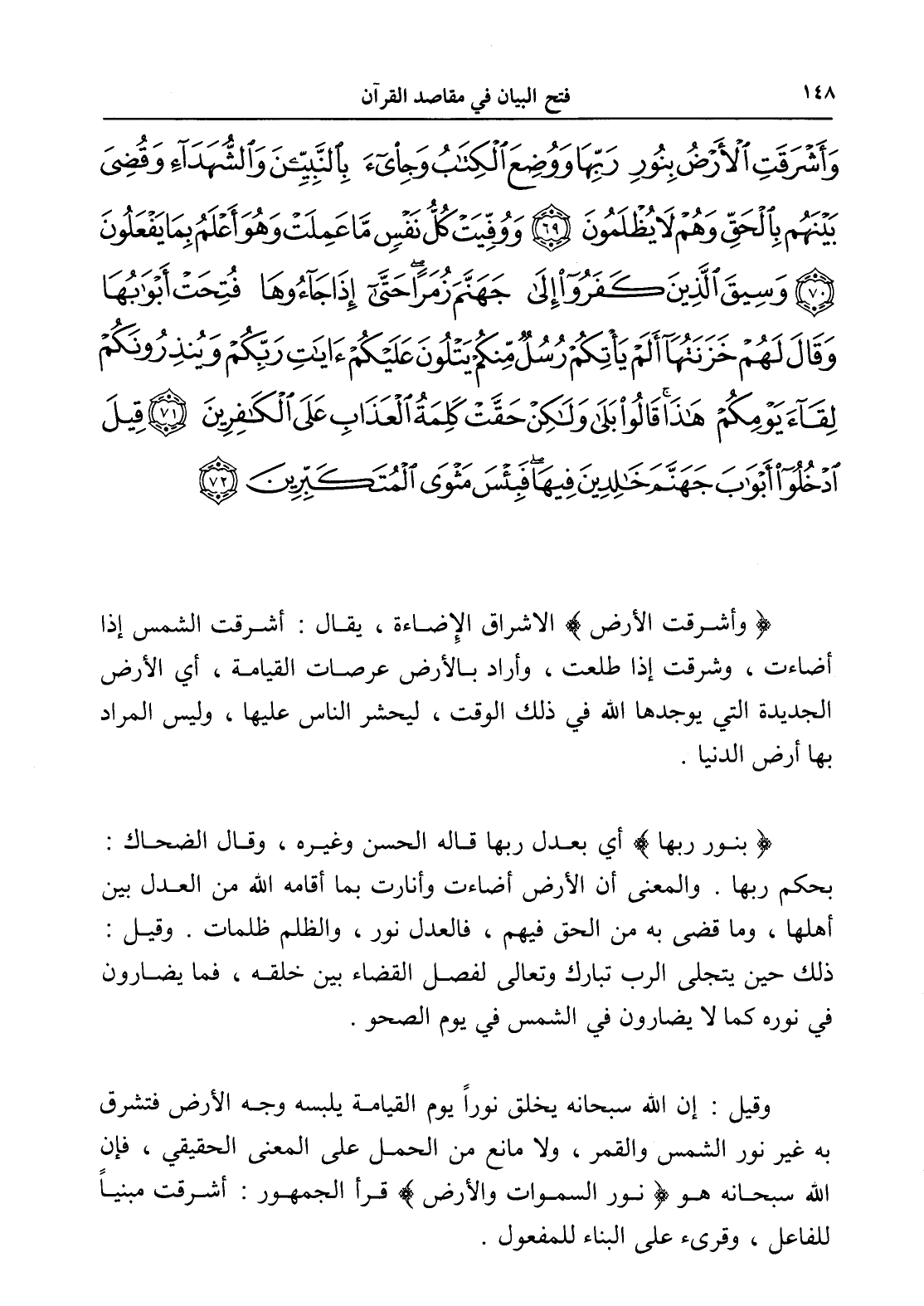 وَأَشْرَقَتِ الْأَرْضُ بِنُورِ رَبِّهَا وَوُضِعَ الْكِتَابُ وَجِيءَ بِالنَّبِيِّينَ وَالشُّهَدَاءِ وَقُضِيَ بَيْنَهُمْ بِالْحَقِّ وَهُمْ لَا يُظْلَمُونَ (69) وَوُفِّيَتْ كُلُّ نَفْسٍ مَا عَمِلَتْ وَهُوَ أَعْلَمُ بِمَا يَفْعَلُونَ (70) وَسِيقَ الَّذِينَ كَفَرُوا إِلَى جَهَنَّمَ زُمَرًا حَتَّى إِذَا جَاءُوهَا فُتِحَتْ أَبْوَابُهَا وَقَالَ لَهُمْ خَزَنَتُهَا أَلَمْ يَأْتِكُمْ رُسُلٌ مِنْكُمْ يَتْلُونَ عَلَيْكُمْ آيَاتِ رَبِّكُمْ وَيُنْذِرُونَكُمْ لِقَاءَ يَوْمِكُمْ هَذَا قَالُوا بَلَى وَلَكِنْ حَقَّتْ كَلِمَةُ الْعَذَابِ عَلَى الْكَافِرِينَ (71) قِيلَ ادْخُلُوا أَبْوَابَ جَهَنَّمَ خَالِدِينَ فِيهَا فَبِئْسَ مَثْوَى الْمُتَكَبِّرِينَ (72)