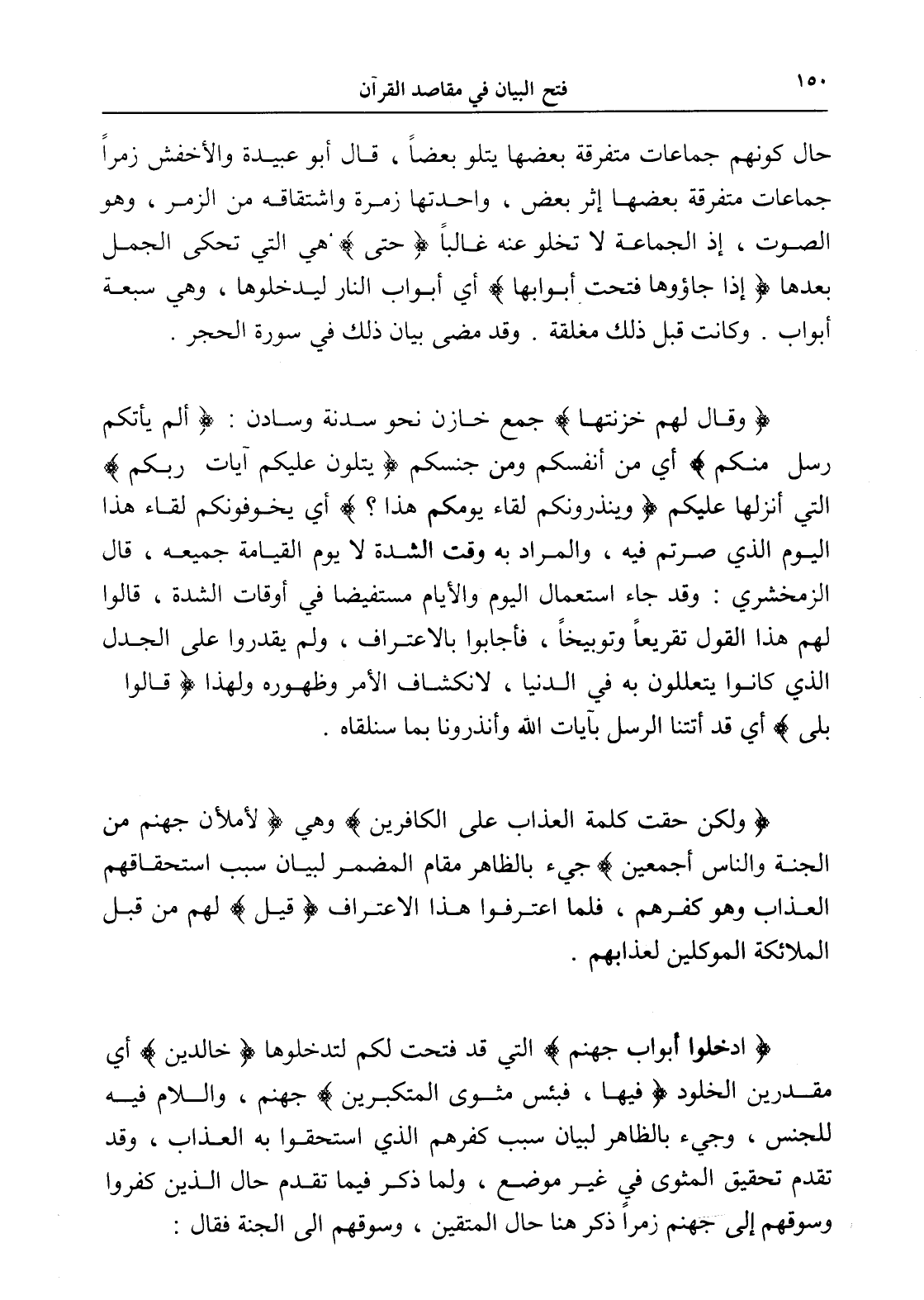 حال كونهم جماعات متفرقة بعضها يتلو بعضاً، قال أبو عبيدة والأخفش زمراً جماعات متفرقة بعضها إثر بعض، واحدتها زمرة واشتقاقه من الزمر، وهو الصوت، إذ الجماعة لا تخلو عنه غالباً (حتى) هي التي تحكي الجمل بعدها (إذا جاؤوها فتحت أبوابها) أي أبواب النار ليدخلوها، وهي سبعة أبواب. وكانت قبل ذلك مغلقة. وقد مضى بيان ذلك في سورة الحجر.