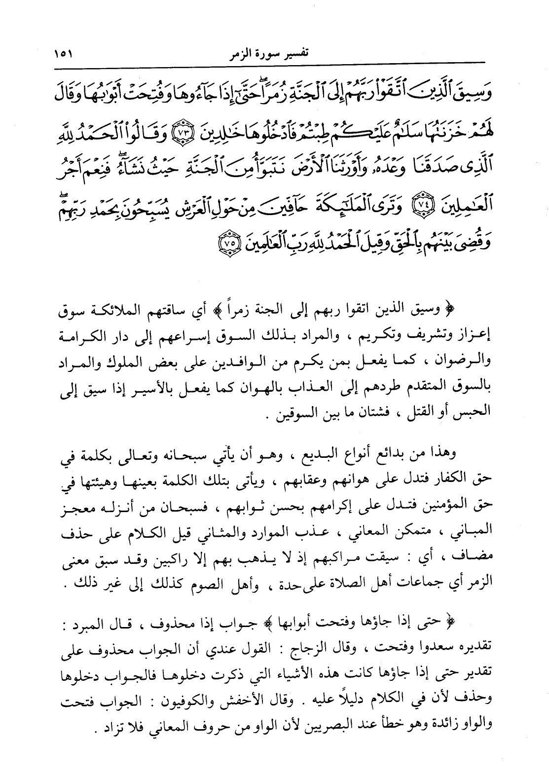 وَسِيقَ الَّذِينَ اتَّقَوْا رَبَّهُمْ إِلَى الْجَنَّةِ زُمَرًا حَتَّى إِذَا جَاءُوهَا وَفُتِحَتْ أَبْوَابُهَا وَقَالَ لَهُمْ خَزَنَتُهَا سَلَامٌ عَلَيْكُمْ طِبْتُمْ فَادْخُلُوهَا خَالِدِينَ (73) وَقَالُوا الْحَمْدُ لِلَّهِ الَّذِي صَدَقَنَا وَعْدَهُ وَأَوْرَثَنَا الْأَرْضَ نَتَبَوَّأُ مِنَ الْجَنَّةِ حَيْثُ نَشَاءُ فَنِعْمَ أَجْرُ الْعَامِلِينَ (74) وَتَرَى الْمَلَائِكَةَ حَافِّينَ مِنْ حَوْلِ الْعَرْشِ يُسَبِّحُونَ بِحَمْدِ رَبِّهِمْ وَقُضِيَ بَيْنَهُمْ بِالْحَقِّ وَقِيلَ الْحَمْدُ لِلَّهِ رَبِّ الْعَالَمِينَ (75)