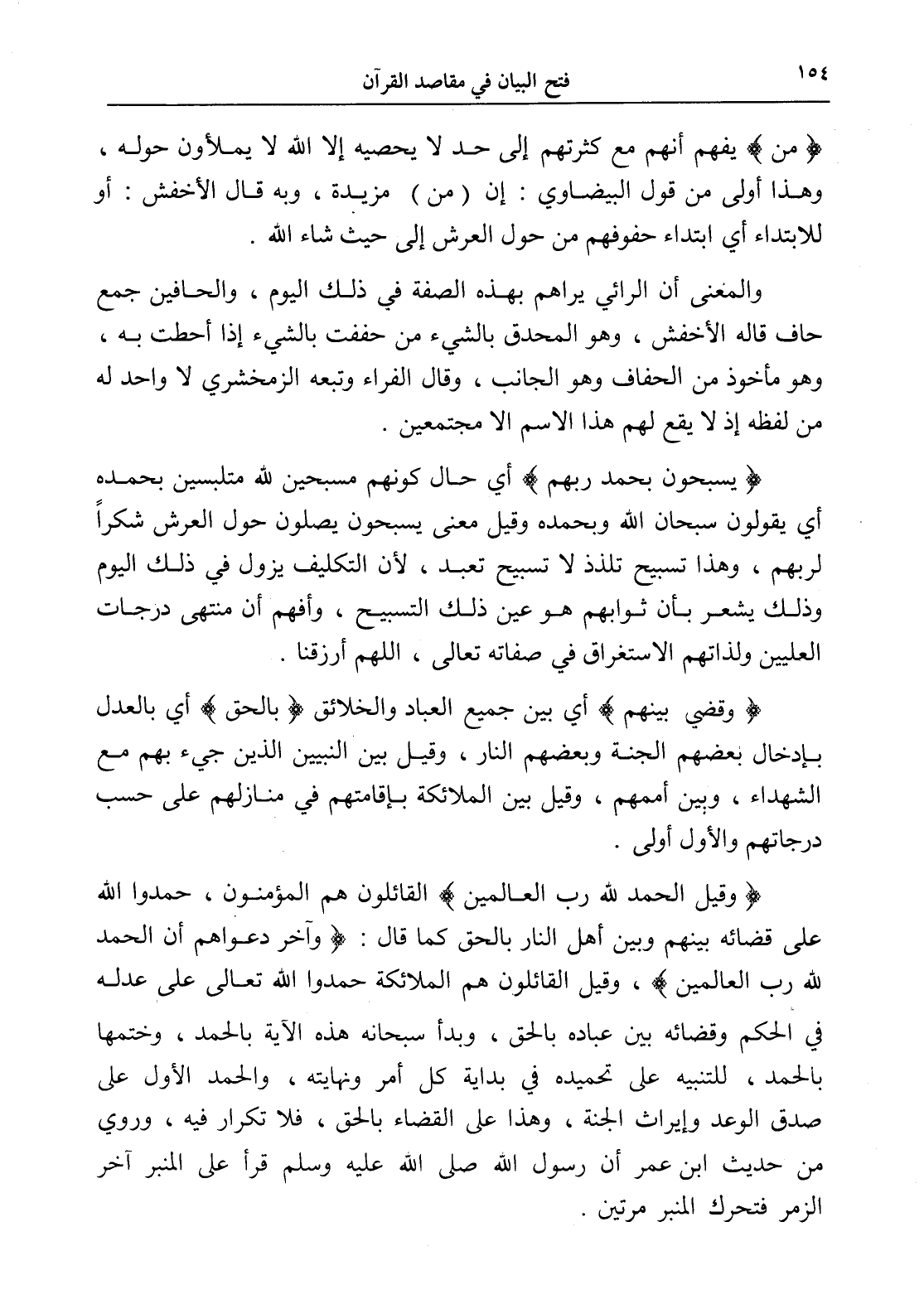 (وقيل الحمد لله رب العالمين) القائلون هم المؤمنون، حمدوا الله على قضائه بينهم وبين أهل النار بالحق كما قال: (وآخر دعواهم أن الحمد لله رب العالمين)، وقيل القائلون هم الملائكة حمدوا الله تعالى على عدله في الحكم وقضائه بين عباده بالحق، وبدأ سبحانه هذه الآية بالحمد، وختمها بالحمد، للتنبيه على تحميده في بداية كل أمر ونهايته، والحمد الأول على صدق الوعد وإيراث الجنة، وهذا على القضاء بالحق، فلا تكرار فيه، وروي من حديث ابن عمر أن رسول الله صلى الله عليه وسلم قرأ على المنبر آخر الزمر فتحرك المنبر مرتين.