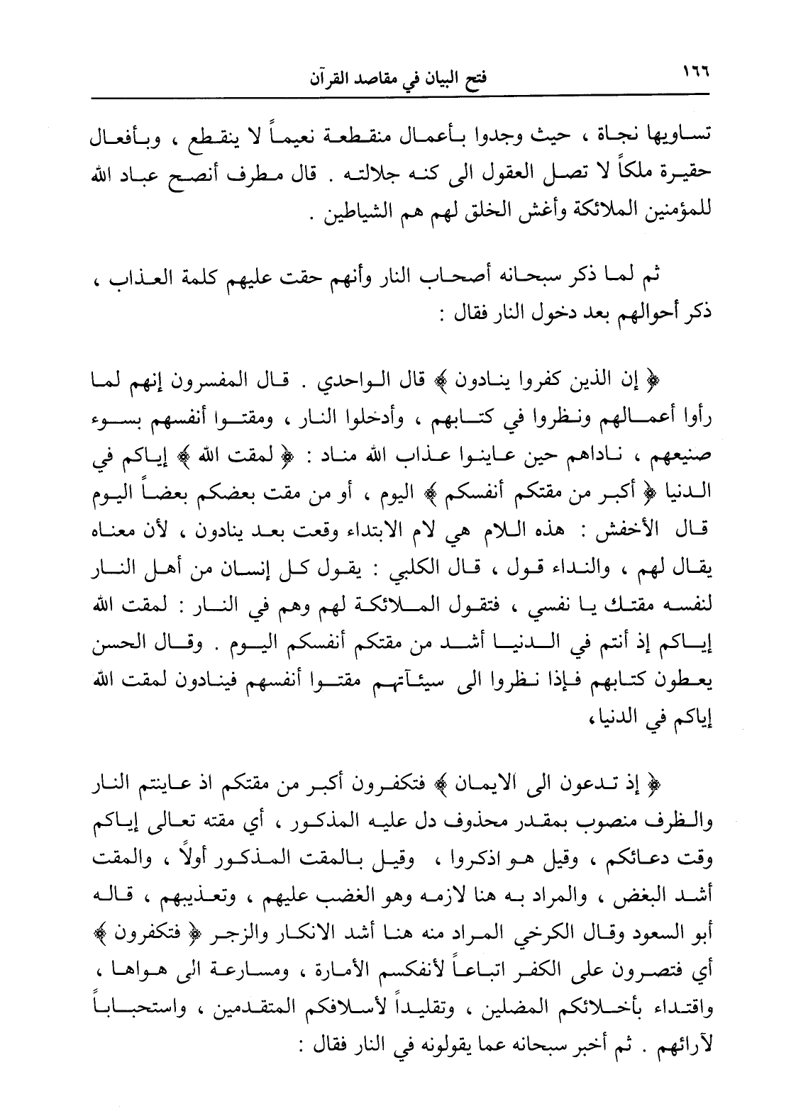 (إن الذين كفروا ينادون) قال الواحدي. قال المفسرون إنهم لما رأوا أعمالهم ونظروا في كتابهم، وأدخلوا النار، ومقتوا أنفسهم بسوء صنيعهم، ناداهم حين عاينوا عذاب الله مناد: (لمقت الله) إياكم في الدنيا (أكبر من مقتكم أنفسكم) اليوم، أو من مقت بعضكم بعضاً اليوم قال الأخفش: هذه اللام هي لام الابتداء وقعت بعد ينادون، لأن معناه يقال لهم، والنداء قول، قال الكلبي: يقول كل إنسان من أهل النار لنفسه مقتك يا نفسي، فتقول الملائكة لهم وهم في النار: لمقت الله إياكم إذ أنتم في الدنيا أشد من مقتكم أنفسكم اليوم. وقال الحسن يعطون كتابهم فإذا نظروا إلى سيئاتهم مقتوا أنفسهم فينادون لمقت الله إياكم في الدنيا.