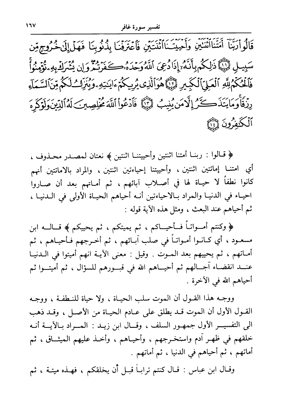قَالُوا رَبَّنَا أَمَتَّنَا اثْنَتَيْنِ وَأَحْيَيْتَنَا اثْنَتَيْنِ فَاعْتَرَفْنَا بِذُنُوبِنَا فَهَلْ إِلَى خُرُوجٍ مِنْ سَبِيلٍ (11) ذَلِكُمْ بِأَنَّهُ إِذَا دُعِيَ اللَّهُ وَحْدَهُ كَفَرْتُمْ وَإِنْ يُشْرَكْ بِهِ تُؤْمِنُوا فَالْحُكْمُ لِلَّهِ الْعَلِيِّ الْكَبِيرِ (12) هُوَ الَّذِي يُرِيكُمْ آيَاتِهِ وَيُنَزِّلُ لَكُمْ مِنَ السَّمَاءِ رِزْقًا وَمَا يَتَذَكَّرُ إِلَّا مَنْ يُنِيبُ (13) فَادْعُوا اللَّهَ مُخْلِصِينَ لَهُ الدِّينَ وَلَوْ كَرِهَ الْكَافِرُونَ (14)