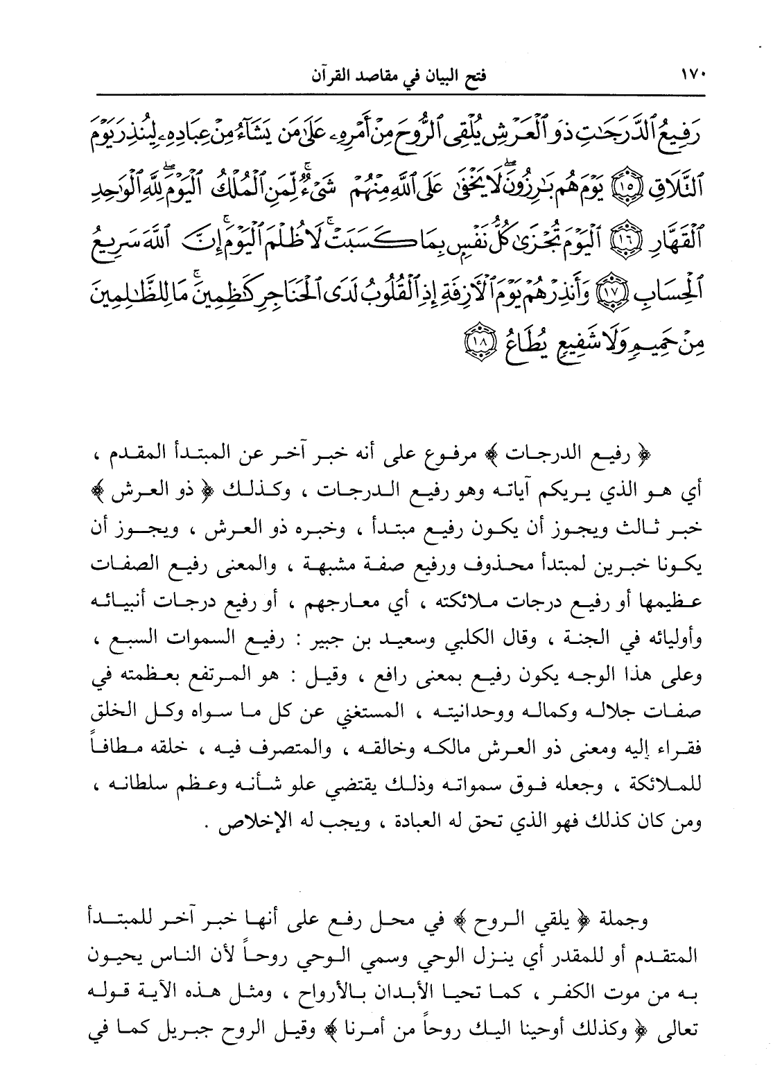 رَفِيعُ الدَّرَجَاتِ ذُو الْعَرْشِ يُلْقِي الرُّوحَ مِنْ أَمْرِهِ عَلَى مَنْ يَشَاءُ مِنْ عِبَادِهِ لِيُنْذِرَ يَوْمَ التَّلَاقِ (15) يَوْمَ هُمْ بَارِزُونَ لَا يَخْفَى عَلَى اللَّهِ مِنْهُمْ شَيْءٌ لِمَنِ الْمُلْكُ الْيَوْمَ لِلَّهِ الْوَاحِدِ الْقَهَّارِ (16) الْيَوْمَ تُجْزَى كُلُّ نَفْسٍ بِمَا كَسَبَتْ لَا ظُلْمَ الْيَوْمَ إِنَّ اللَّهَ سَرِيعُ الْحِسَابِ (17) وَأَنْذِرْهُمْ يَوْمَ الْآزِفَةِ إِذِ الْقُلُوبُ لَدَى الْحَنَاجِرِ كَاظِمِينَ مَا لِلظَّالِمِينَ مِنْ حَمِيمٍ وَلَا شَفِيعٍ يُطَاعُ (18)