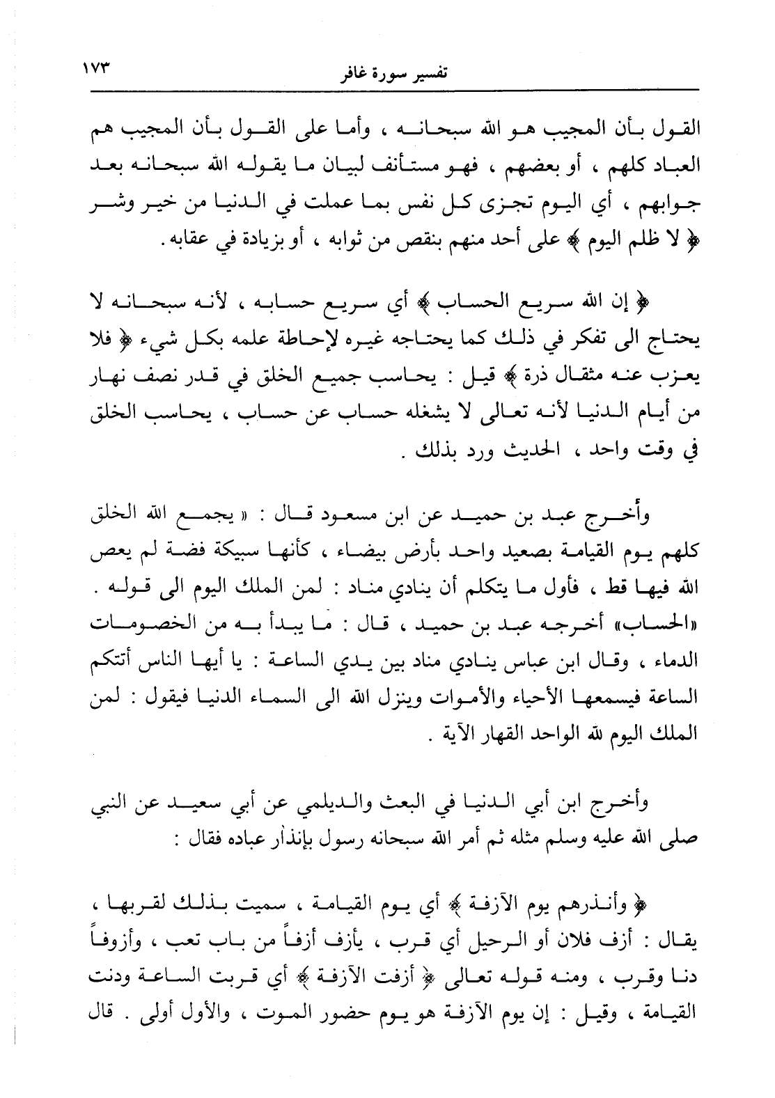 وأخرج عبد بن حميد عن ابن مسعود قال: " يجمع الله الخلق كلهم يوم القيامة بصعيد واحد بأرض بيضاء، كأنها سبيكة فضة لم يعص الله فيها قط، فأول ما يتكلم أن ينادي مناد: لمن الملك اليوم إلى قوله: " الحساب " أخرجه عبد بن حميد، قال: ما يبدأ به من الخصومات الدماء، وقال ابن عباس ينادي مناد بين يدي الساعة: يا أيها الناس أتتكم الساعة فيسمعها الأحياء والأموات وينزل الله إلى السماء الدنيا فيقول: لمن الملك اليوم لله الواحد القهار الآية.