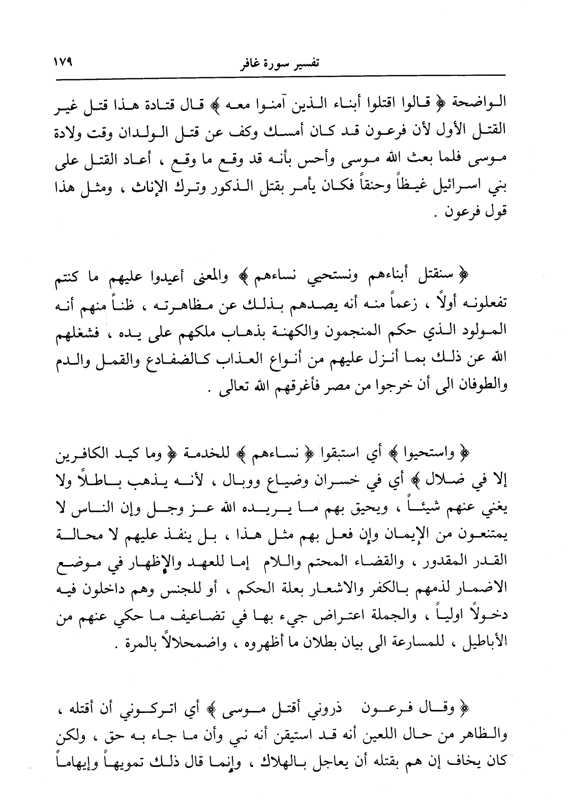 الواضحة (قالوا اقتلوا أبناء الذين آمنوا معه) قال قتادة هذا قتل غير القتل الأول لأن فرعون قد كان أمسك وكف عن قتل الولدان وقت ولادة موسى فلما بعث الله موسى وأحس بأنه قد وقع ما وقع، أعاد القتل على بني إسرائيل غيظاً وحنقاً فكان يأمر بقتل المذكور وترك الإناث، ومثل هذا قول فرعون.